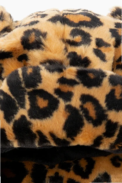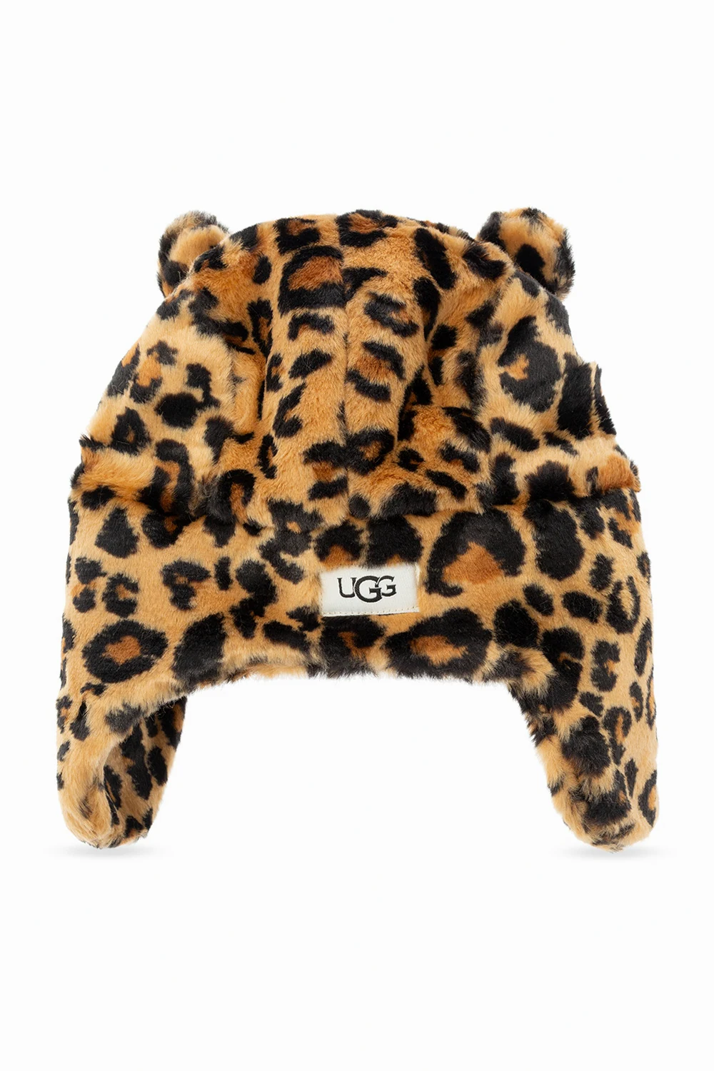 Beige, black and brown beanie from UGG Kids. Crafted from faux fur, this item is enriched by a leopard pattern and logo patch at the back.