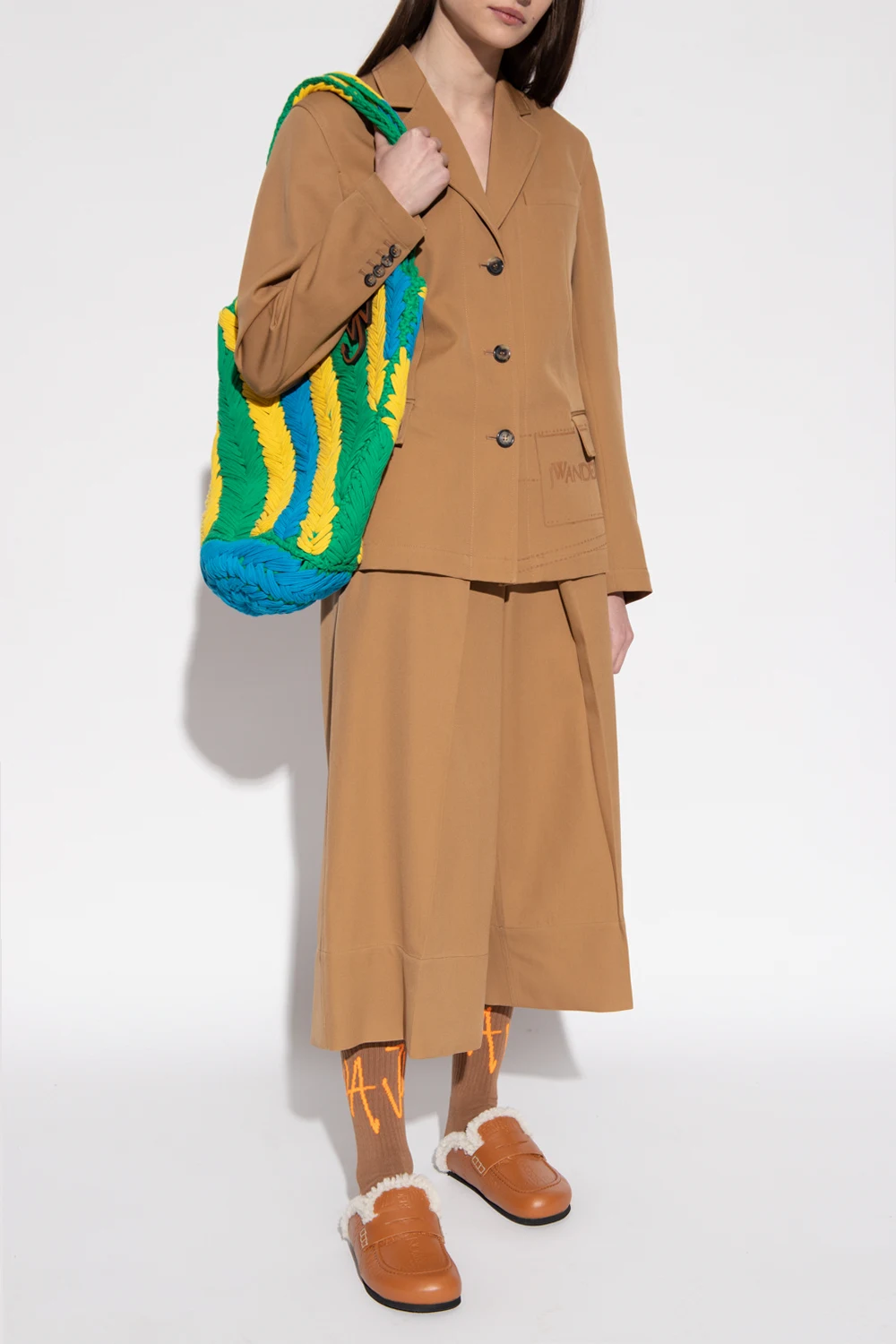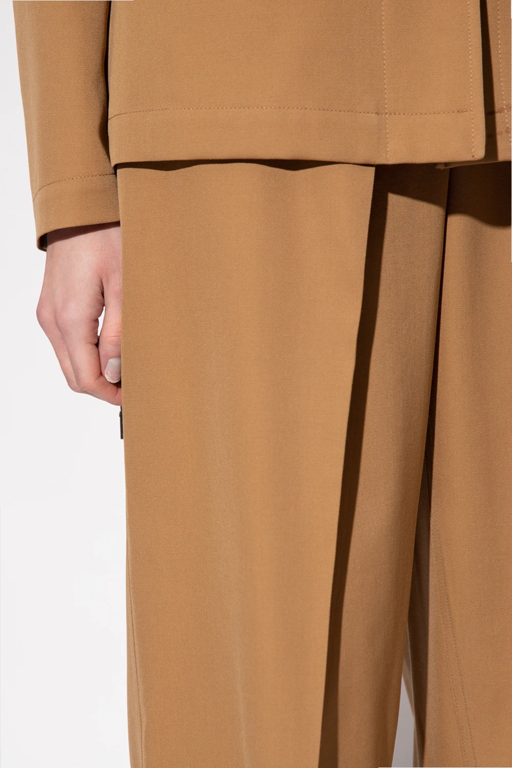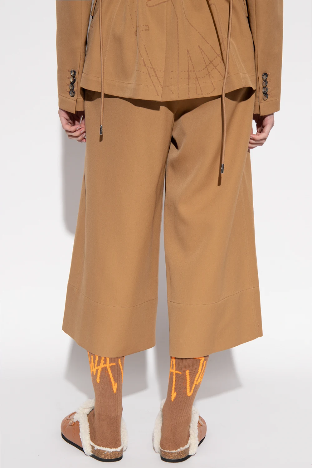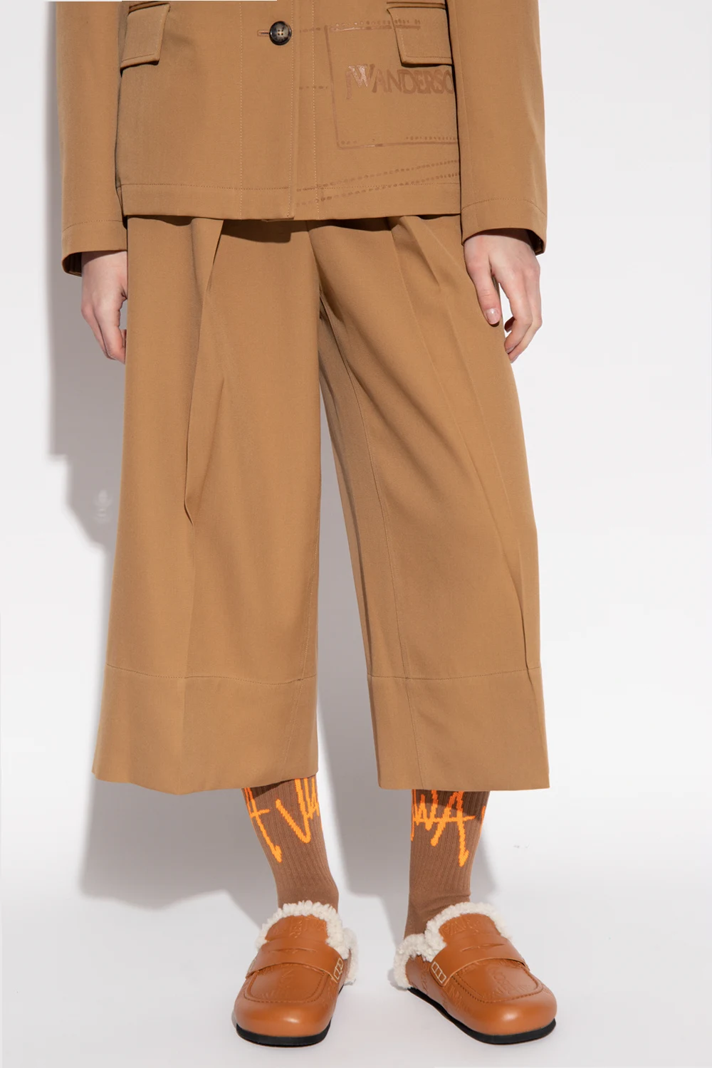Beige trousers from J.W. Anderson. Crafted from combed wool with a twill weave, this pair falls with wide, cropped legs and features a zip fly with a button and a hook, pleat detailing at the waist, two slip pockets on the front and two button pockets at the back.