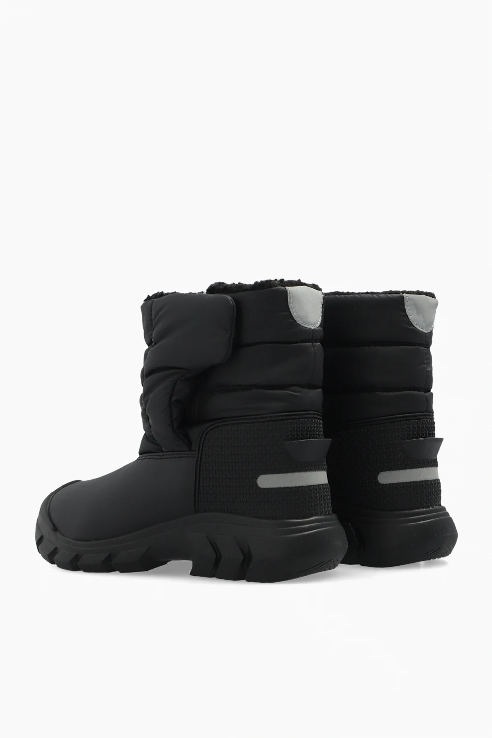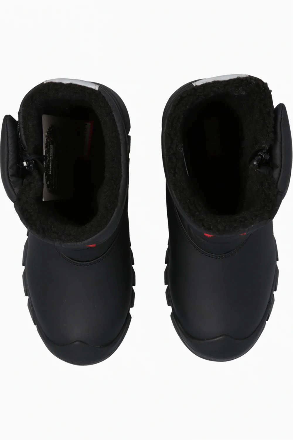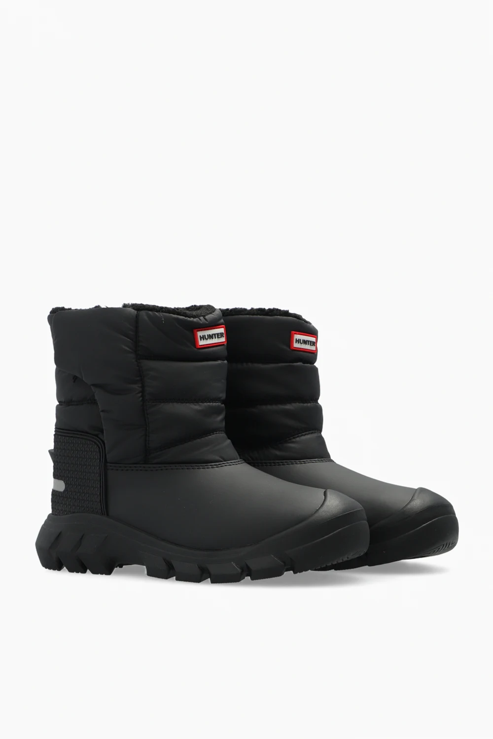 Black snow boots from Hunter Kids. Crafted from recycled material and trimmed with rubber, this model offers waterproof properties and features a side zipper and a velcro closure, a logo patch on the front, reflective details, a fleece lining and a black rubber sole. Temperature range: up to -20°C.