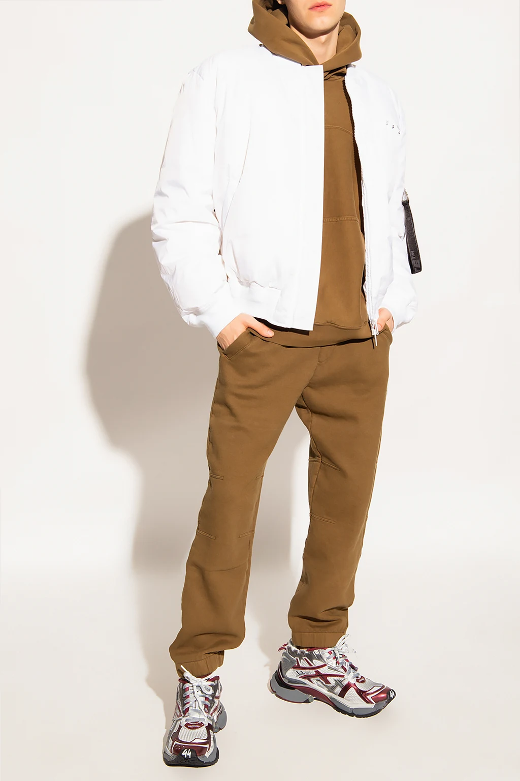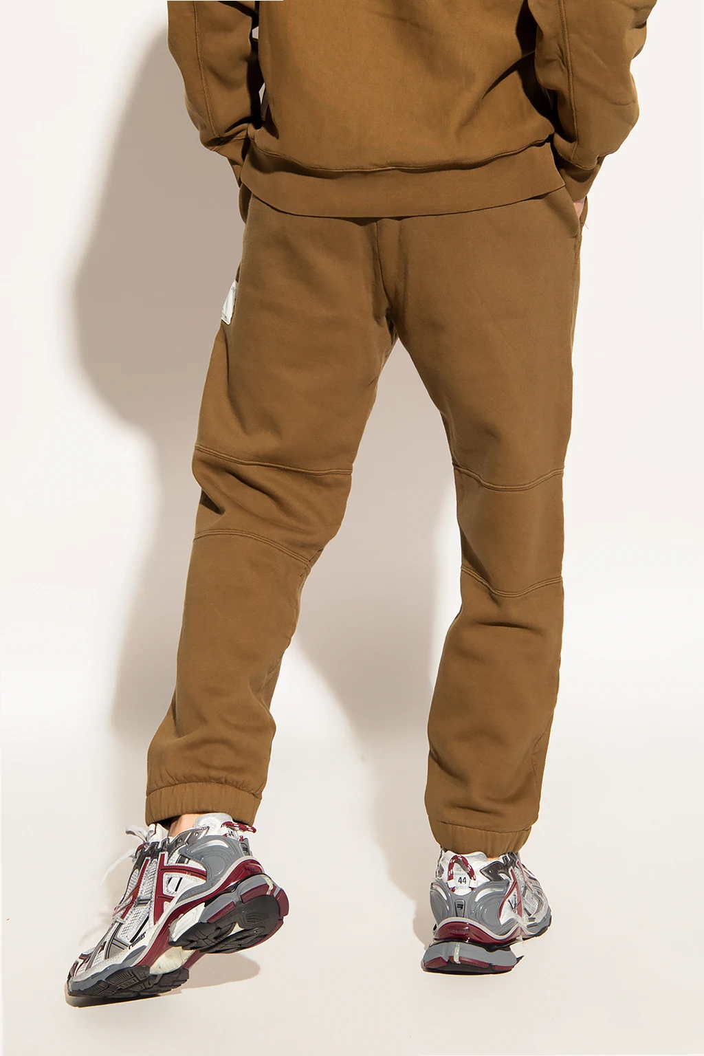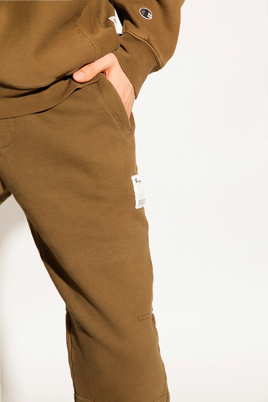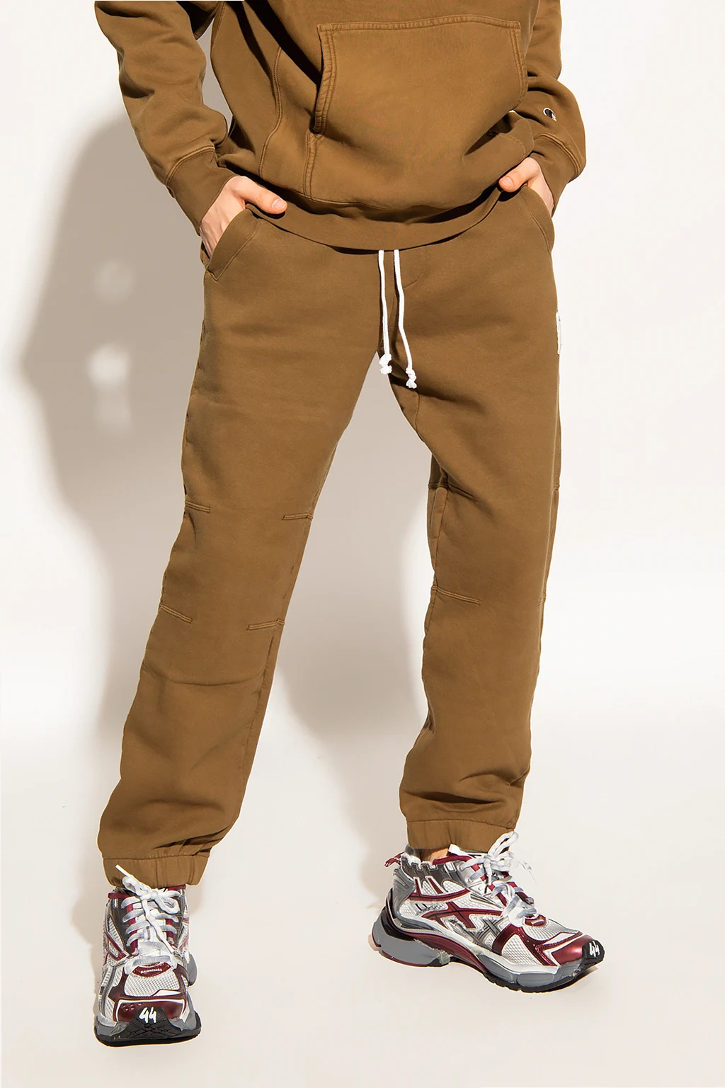 Khaki sweatpants from Champion. Crafted from cotton, this pair features an elasticated waistband with a drawstring fastening, elasticated cuffs and two slip pockets accompanied by logo patches on the front.