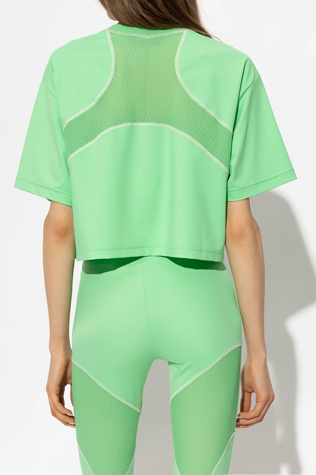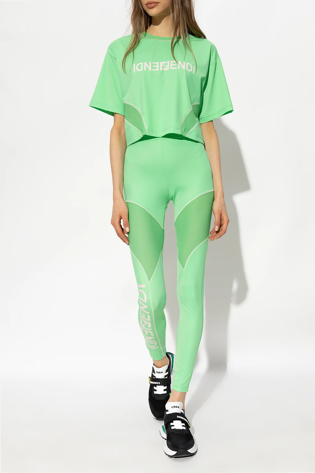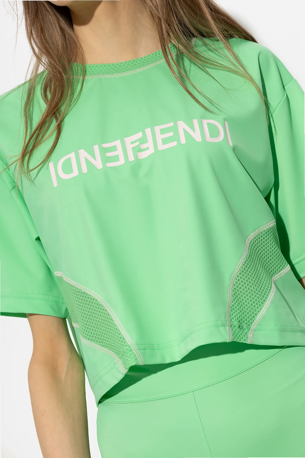 Green crewneck T-shirt from Fendi. This short sleeve design is decorated with a white logo print and micromesh inserts.