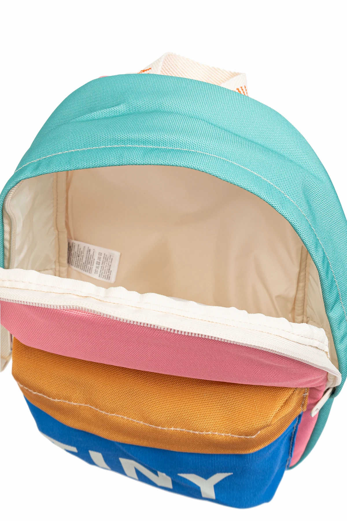 Hergestellt aus strapazierfähigem synthetischem Material, kombiniert der Rucksack verschiedene Farbtöne: eine rosa Vorderseite, eine orangefarbene Reißverschlusstasche, ein blaues unteres Panel mit weißem "TINY"-Schriftzug, grüne Seiten sowie eine orange-rosa Rückseite und Träger. Gepolsterte rosa Träger und ein weißer Griff mit "TINY"-Schriftzug sorgen für Tragekomfort.
