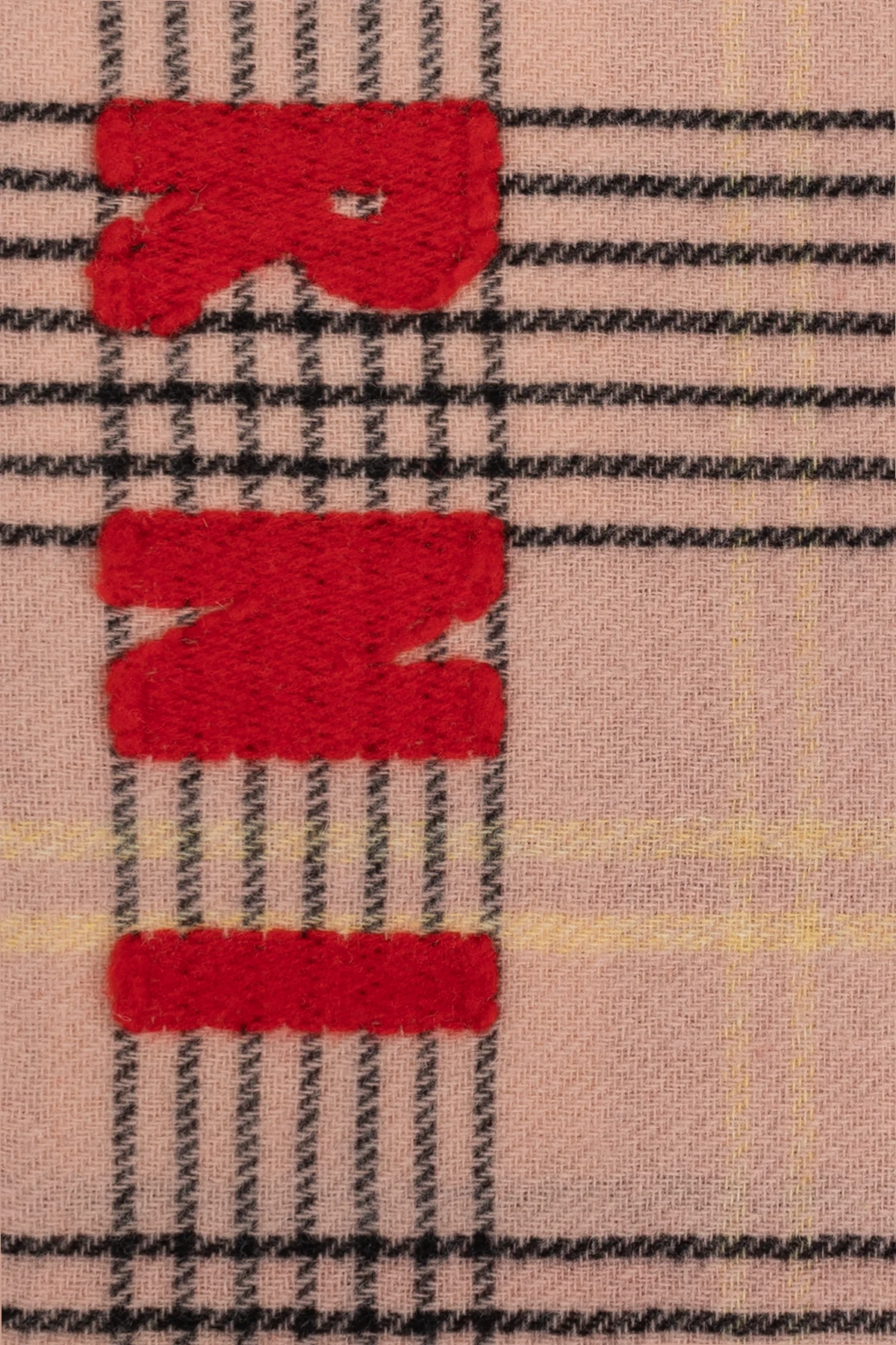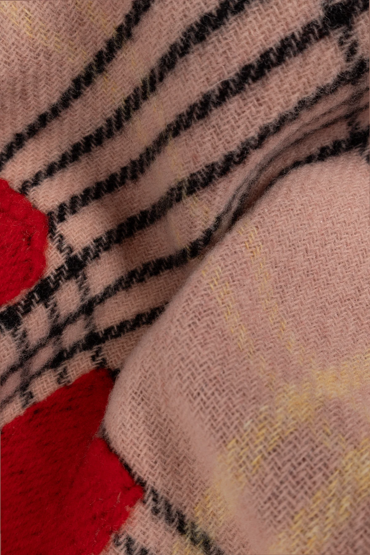 Muster und Farbgebung: Der Schal verfügt über ein charakteristisches Karomuster mit schwarzen Linien auf rosa Hintergrund, ergänzt durch gelbe Akzente. An einem Ende des Schals befindet sich der große rote Schriftzug "MARNI", das Markenzeichen der Marke. Die andere Seite des Schals zeigt ein auffälligeres Karo in den Farben Rot, Gelb und Beige.