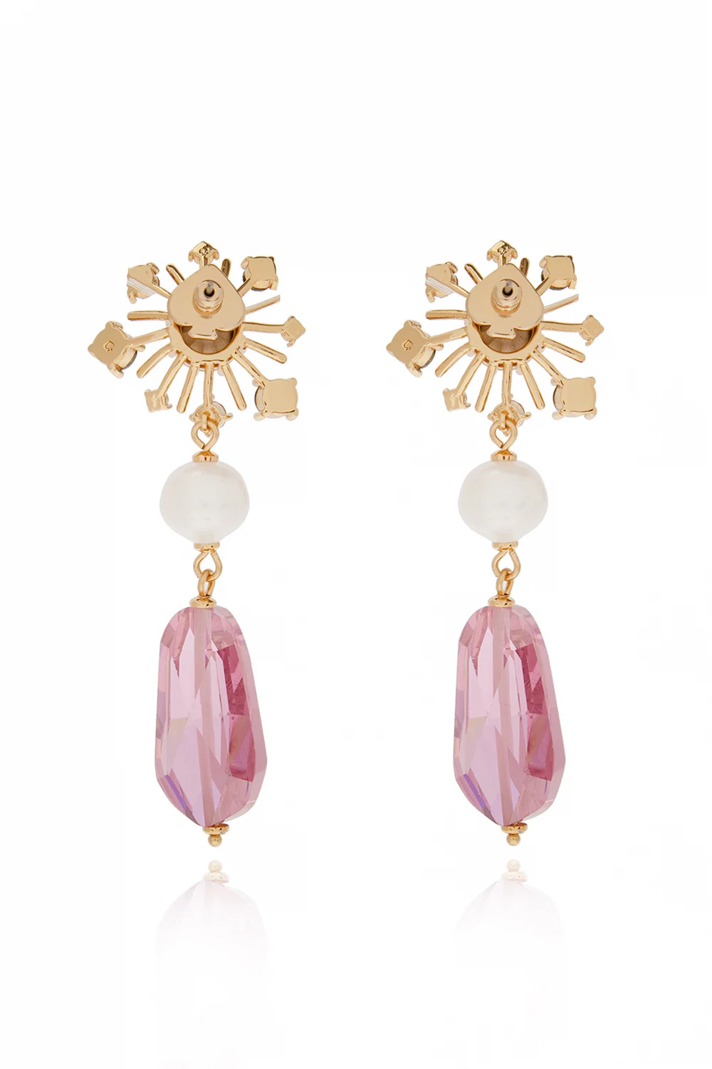 Drop earrings in gold-tone from Kate Spade. Made of brass, they secure with push back closures and showcase pearls and colourful glass rhinestones.