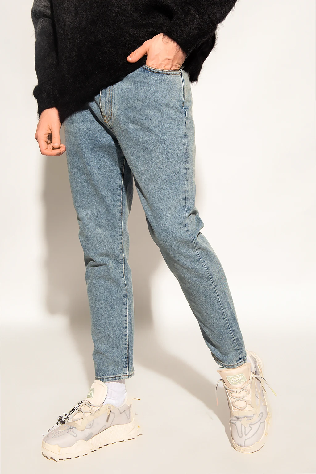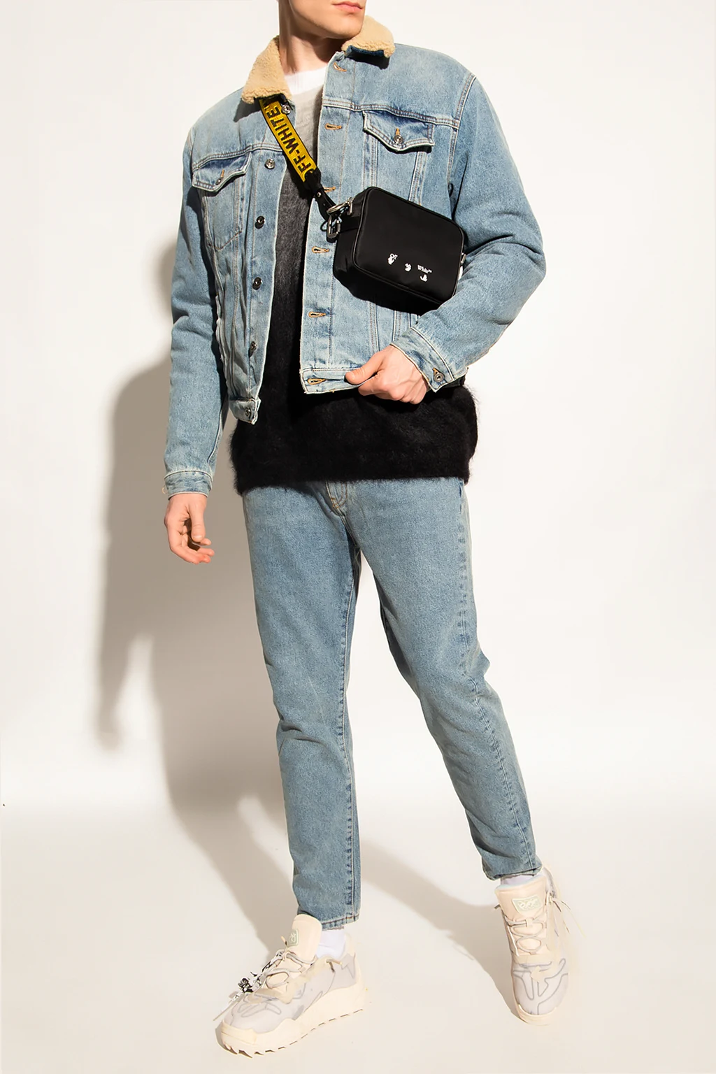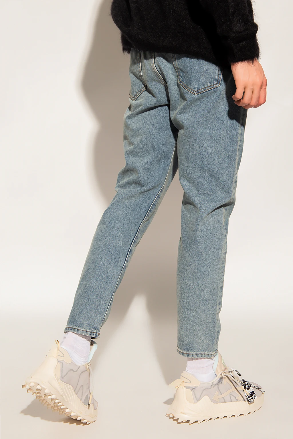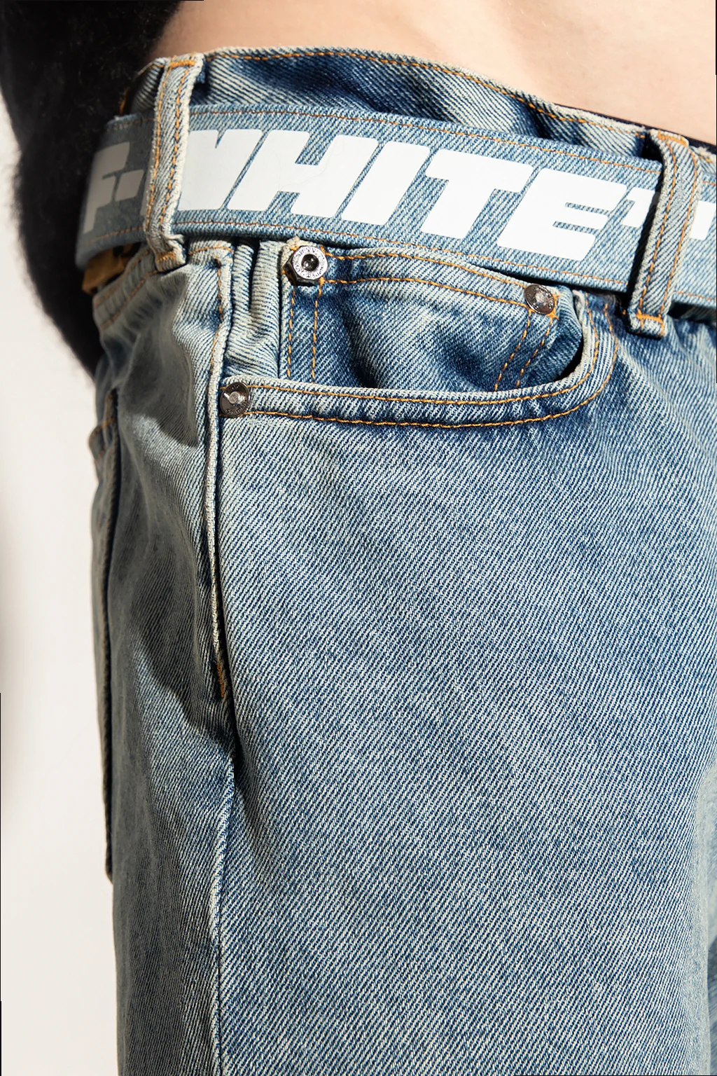 Light blue jeans from Off-White. Falling with legs that taper towards the ankles, this pair features an elasticated waistband, a zip fly with a button, classic five pockets, a light brown logo patch on the back and an attached denim belt with a buckle and white logo graphic prints.