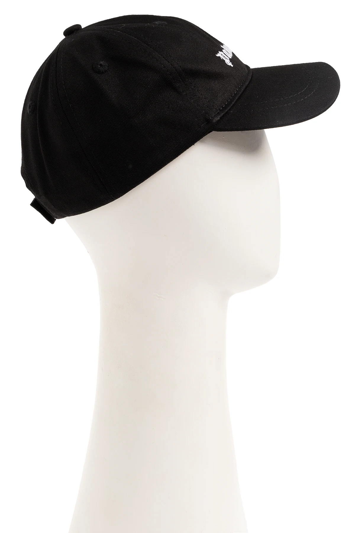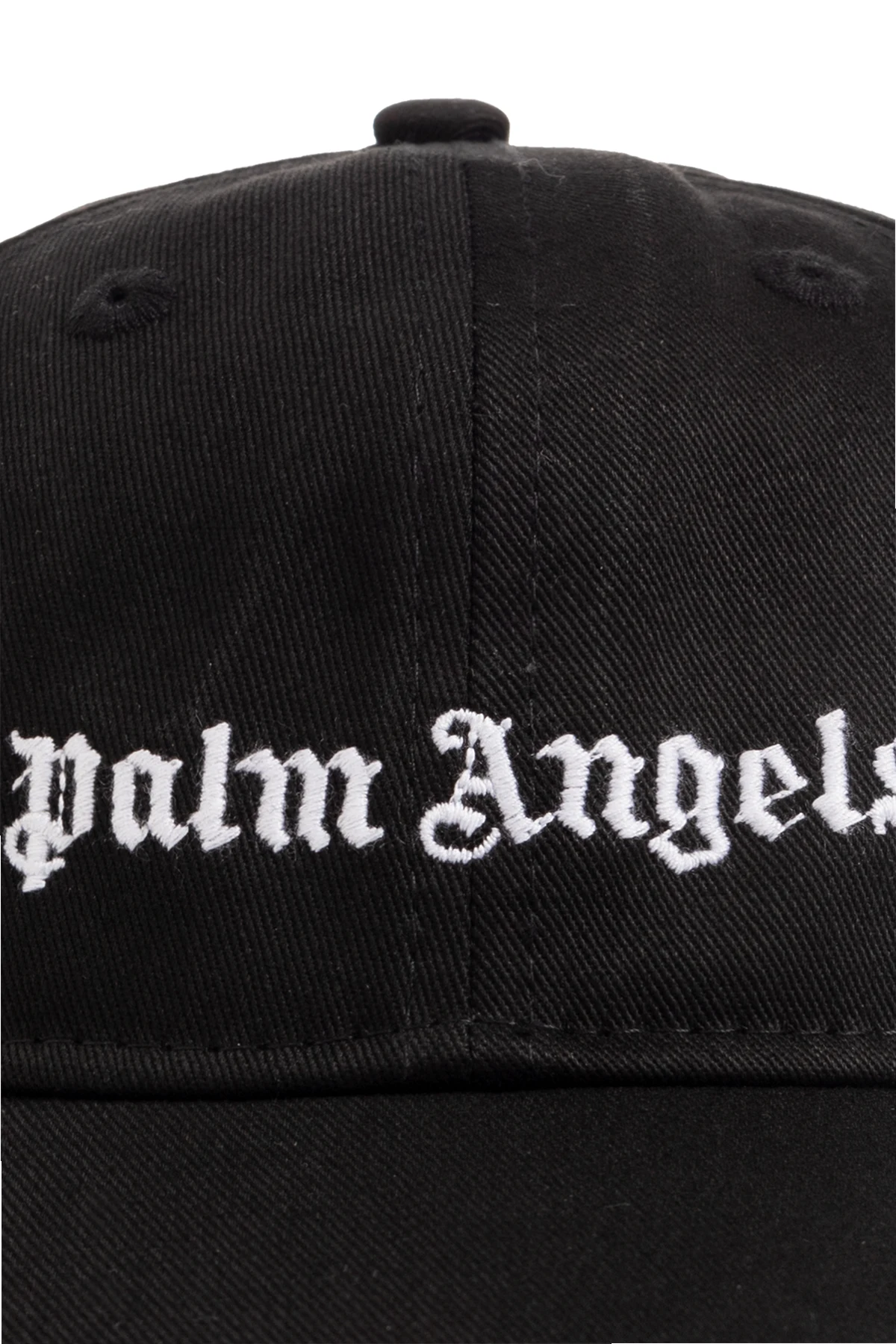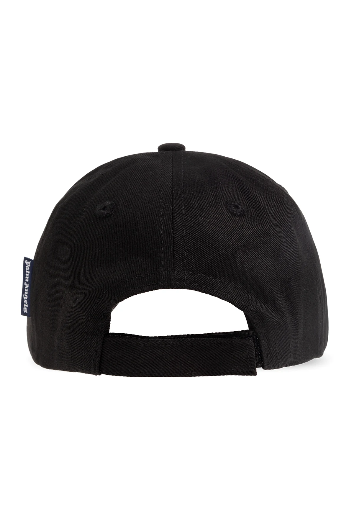 Black baseball cap from Palm Angels Kids. Made from cotton, this item showcases an embroidered white logo on the front and a hook & loop fastener on the back.