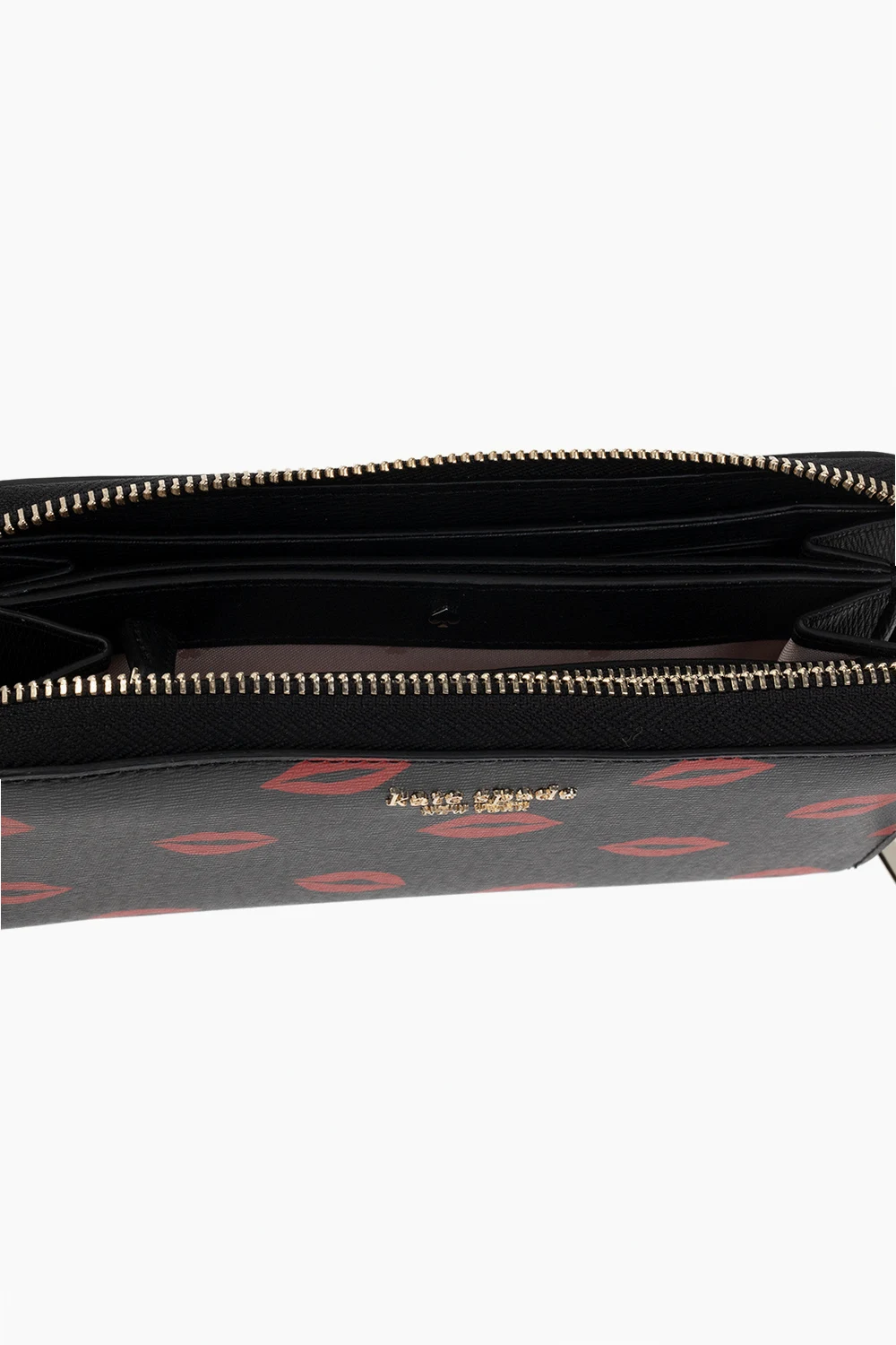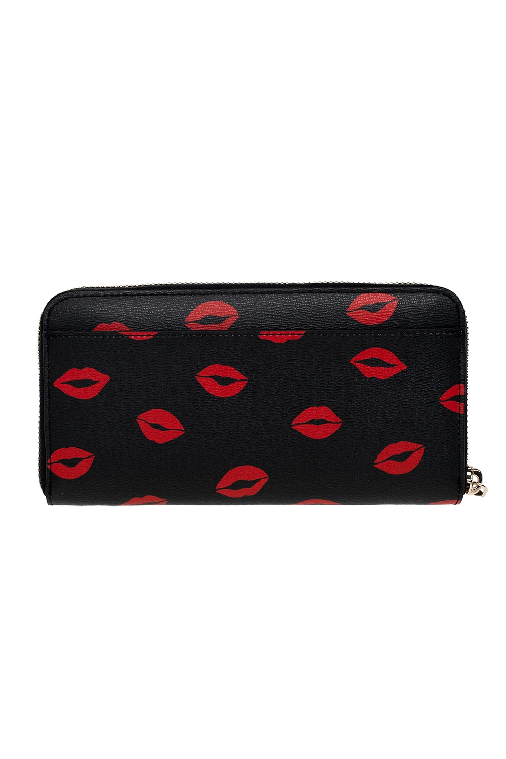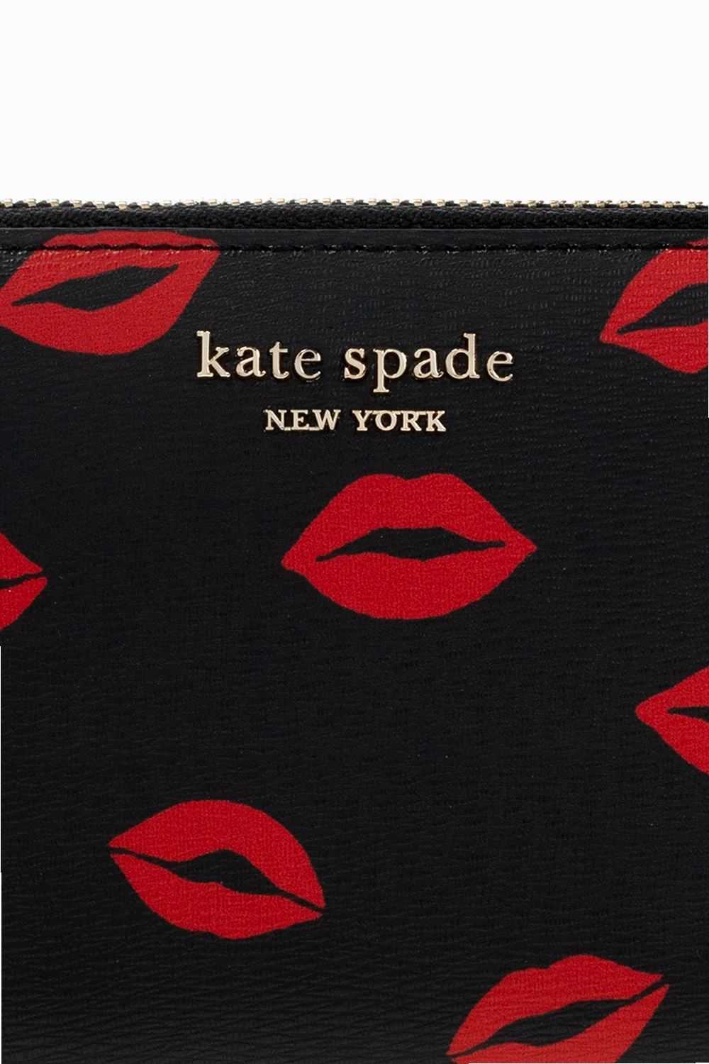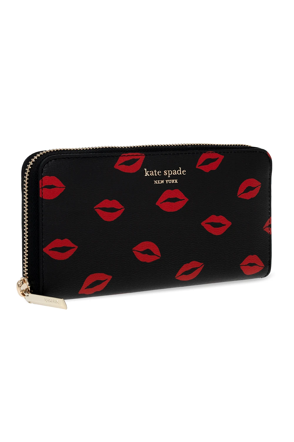 Black ‘Spencer Kisses’ wallet from Kate Spade. Embellished with a red lips motif and a logo application, this design features a zip fastening, a back slip pocket, gold-tone metal hardware and an interior with three compartments, three slip pockets, one zipped pocket and twelve card slots.