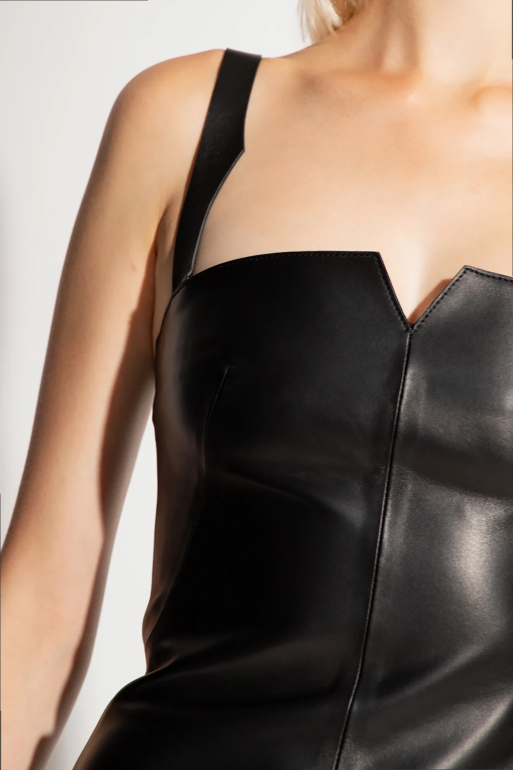 Black mini slip dress from Off-White. Crafted from leather, this style features a slim-fitting silhouette with a back zipper.