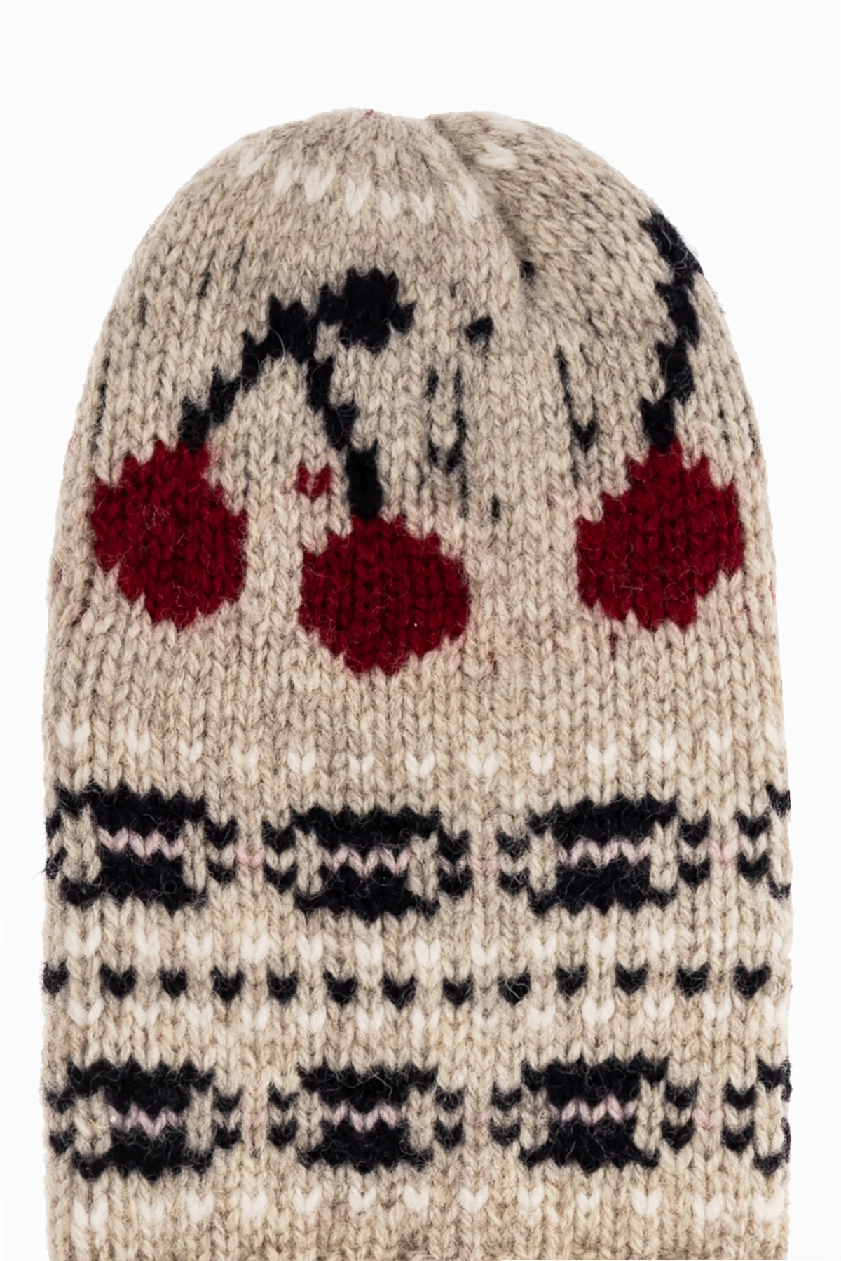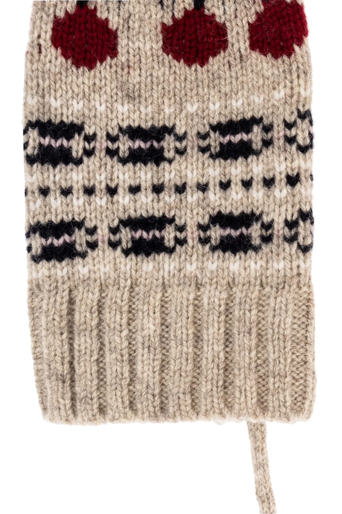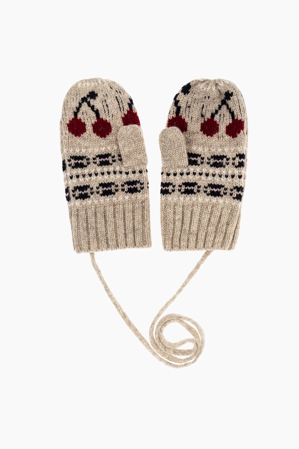 Greyish beige ‘Dhuri’ gloves from Bonpoint. Made of wool, this design features a navy, red and white logo pattern, ribbed cuffs and connecting string.