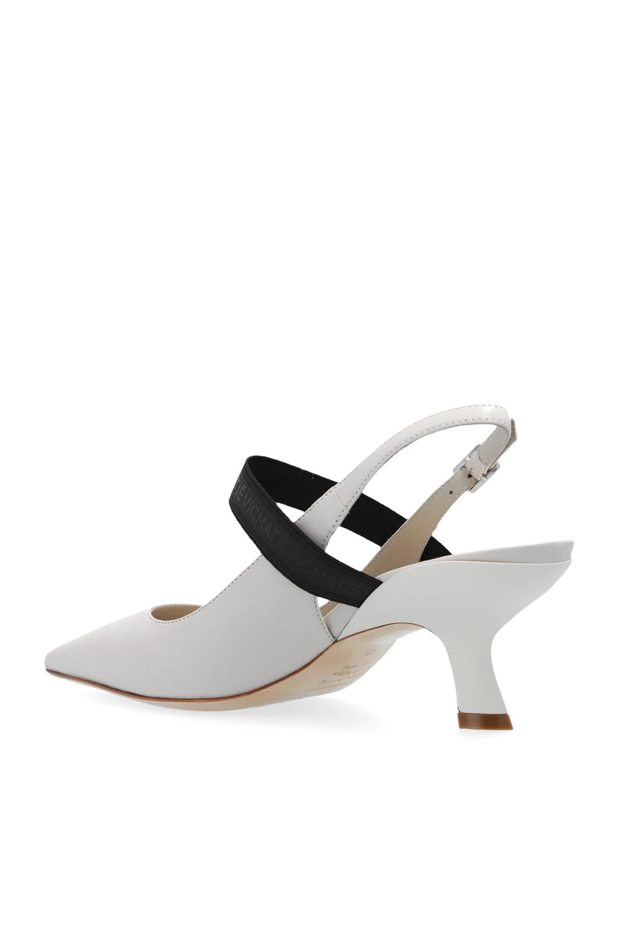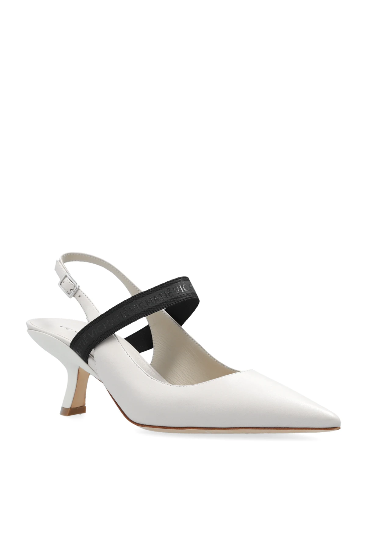 Cream ‘Bonbon’ pumps from Vic Matie. Made of leather with a pointed-toe silhouette, this model sits on a beige leather sole and features an adjustable strap with a buckle on the back and a black elastic strap with a logo on the front.