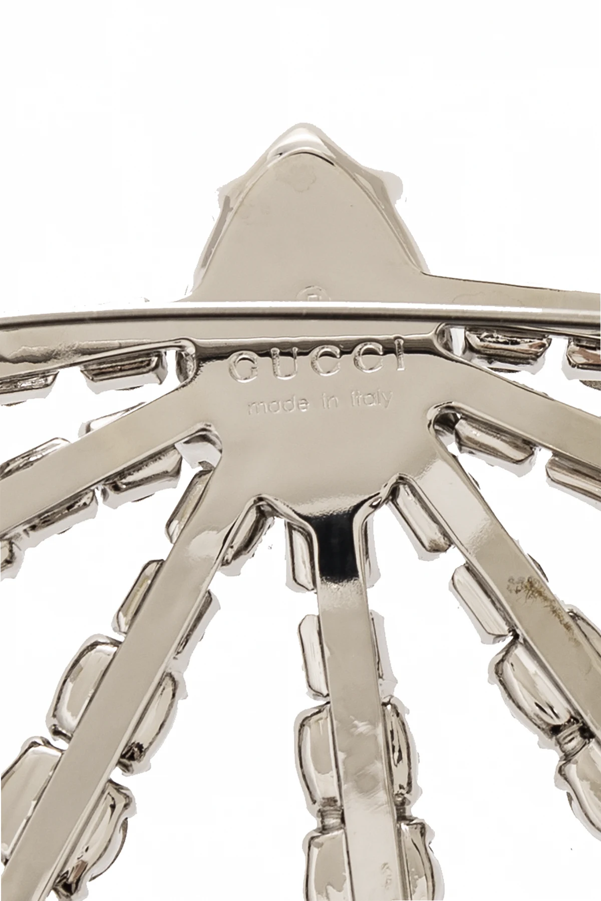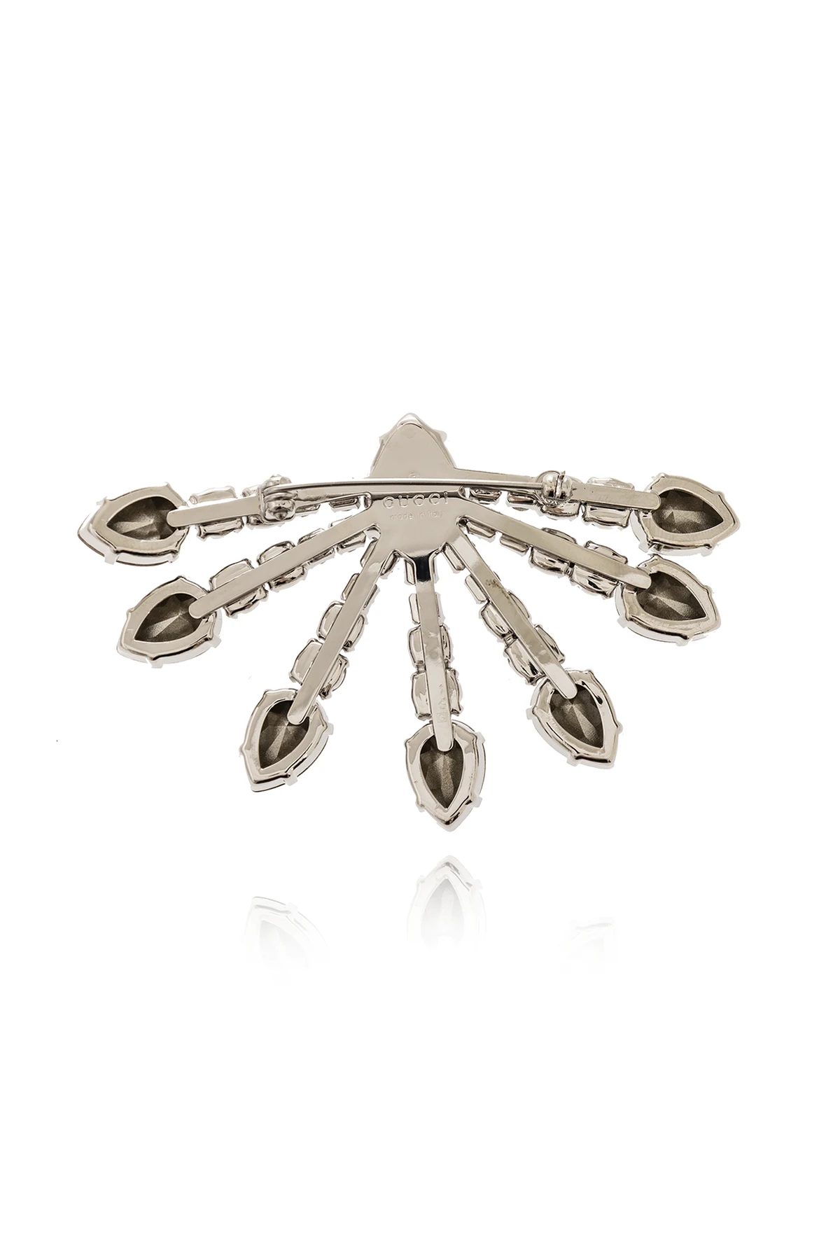 Silver-tone brooch from Gucci. Made of brass, this item is embellished with glossy crystals and features a pin closure.
