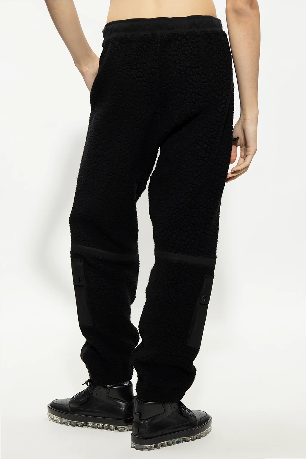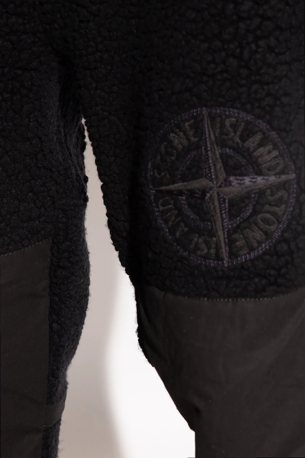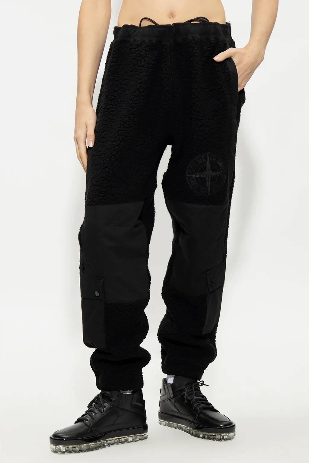 Black trousers from Stone Island. Crafted from a textured wool blend, this pair features a drawstring waist, black logo embroidery, two slip pockets, two zip pockets, two flap pockets and ribbed cuffs.