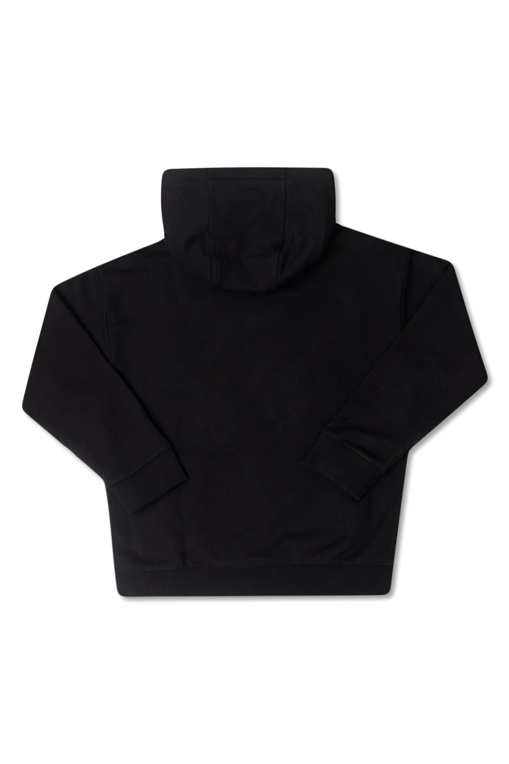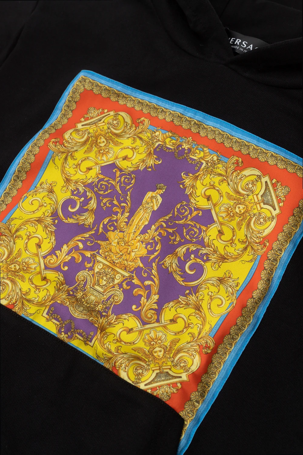 Black hoodie from Versace Kid. Crafted from cotton, this garment features a multicolored patch with the Barocco Goddess, slip pocket and ribbed trims at the hem and cuffs.