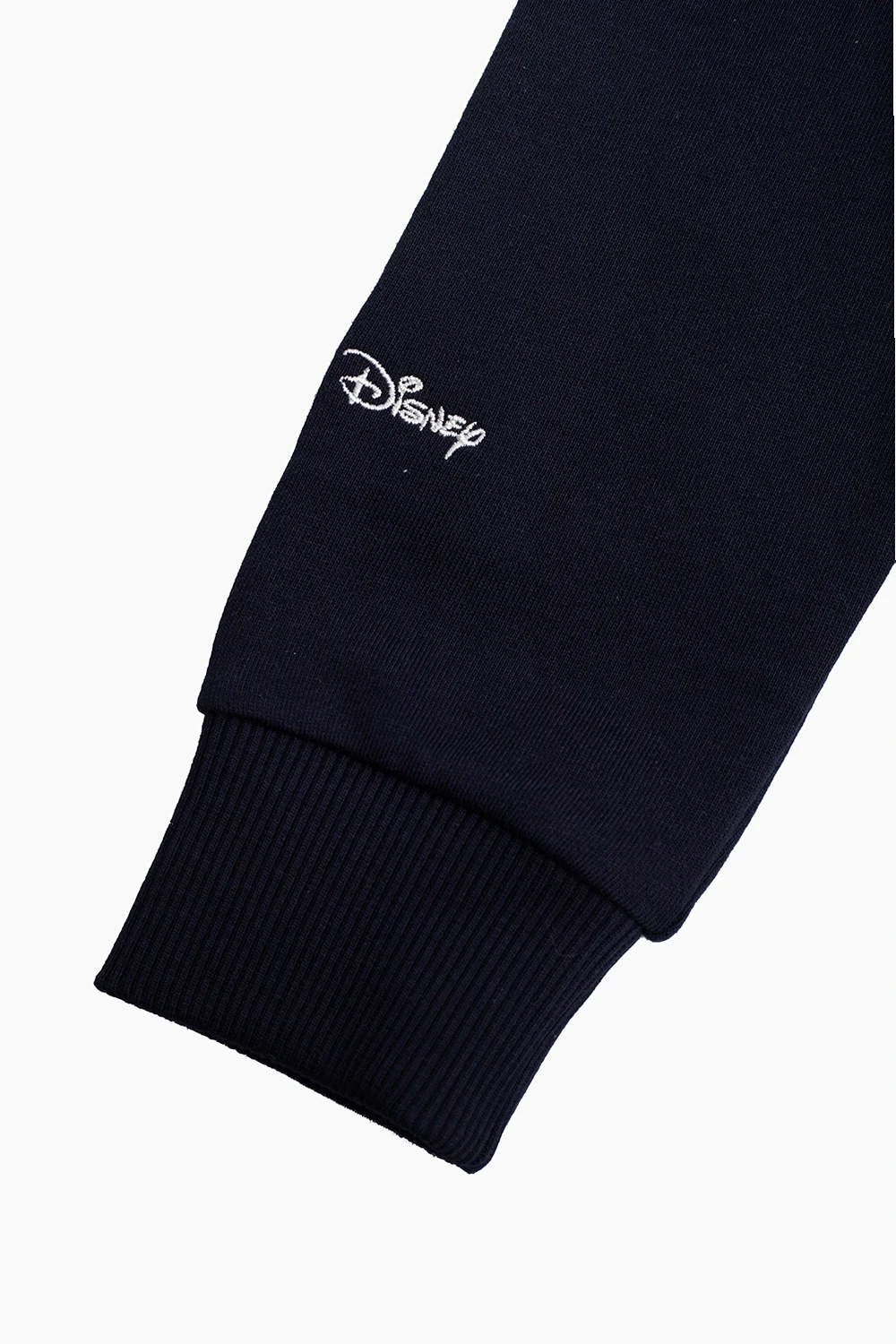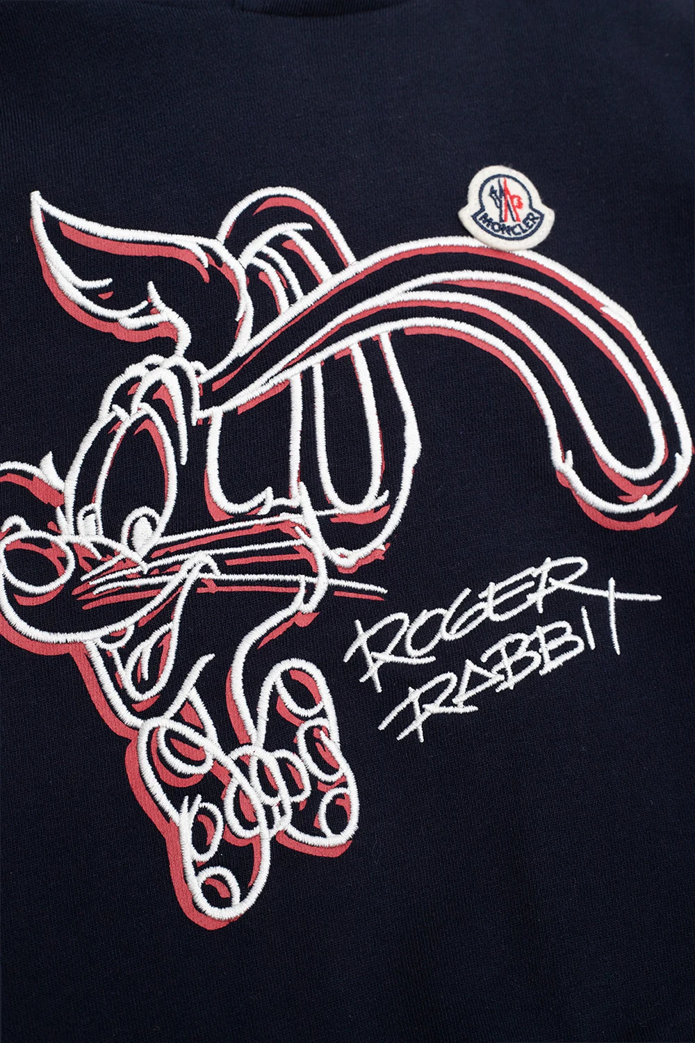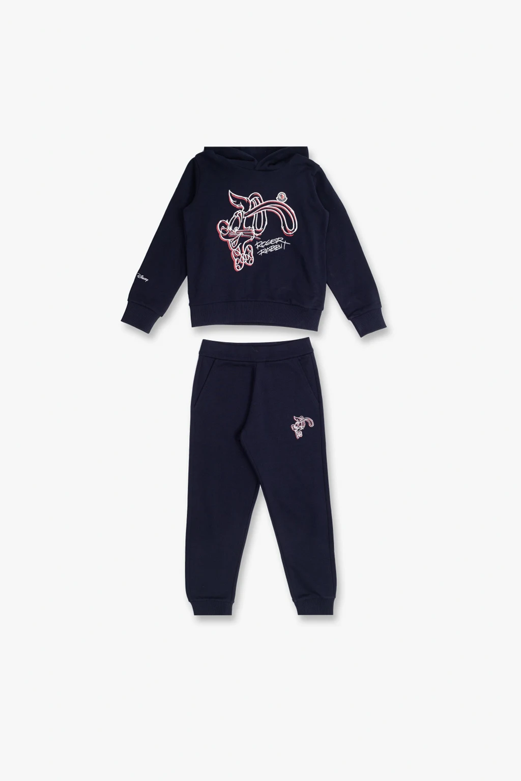 Navy blue sweatsuit from Moncler x Disney. Crafted from cotton, it includes a hoodie with a white and red Roger Rabbit and felt logo patch on the front, a kangaroo pocket and elasticized trims on the bottom hem and long sleeves and sweatpants featuring an elasticated waistband, two slip pockets, embroidered detailing on the front and a logo patch at the back.