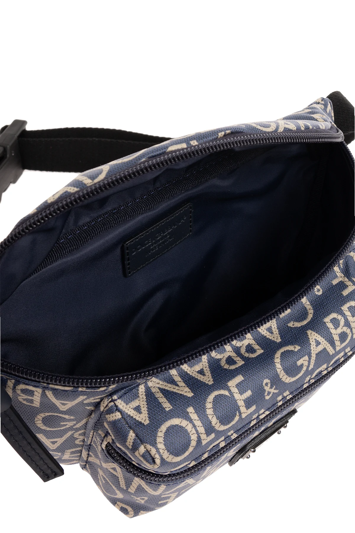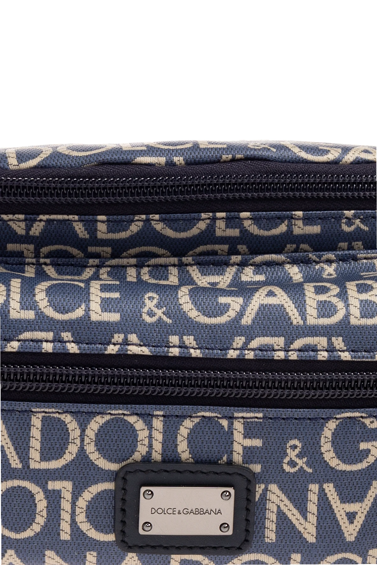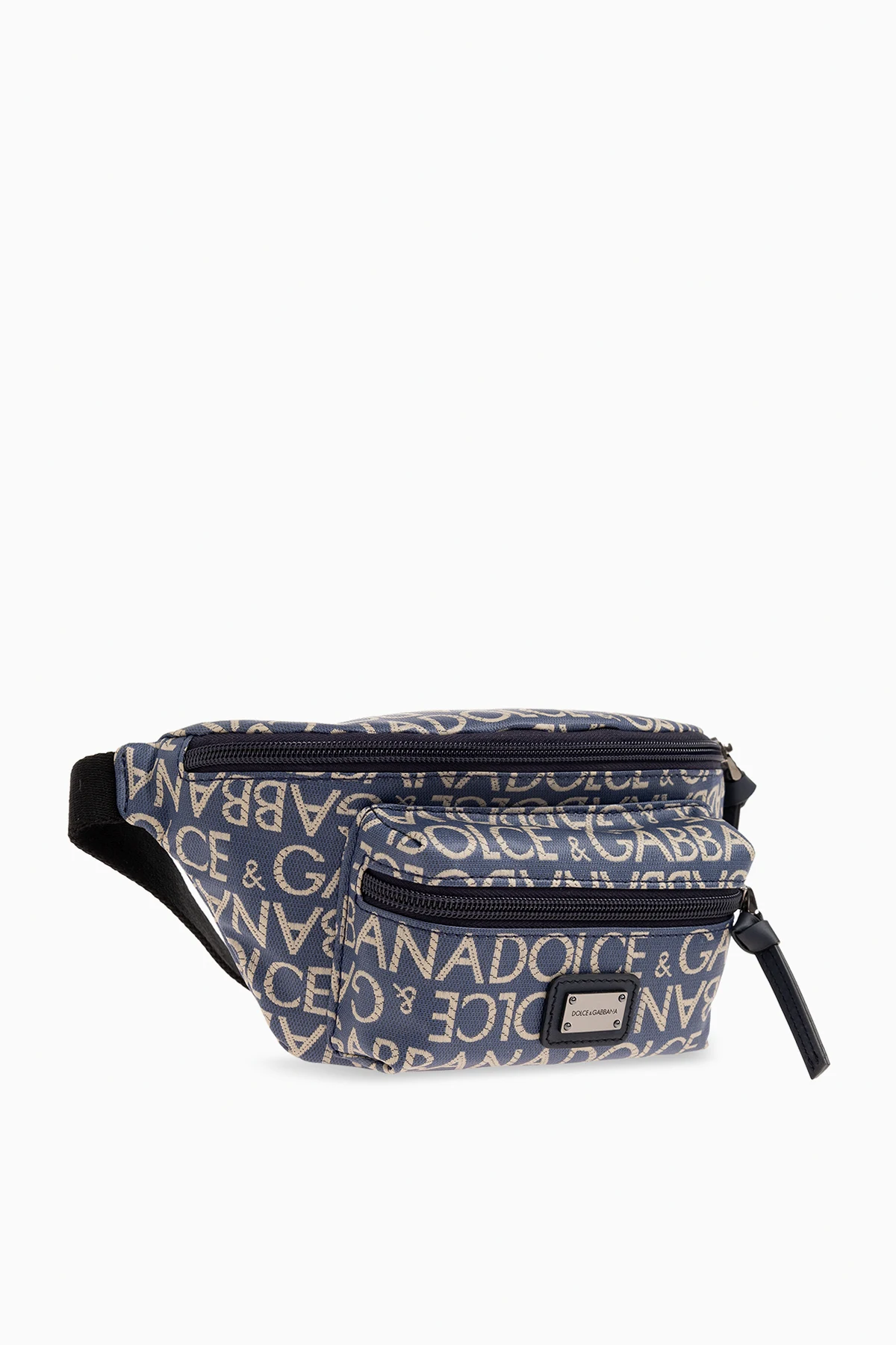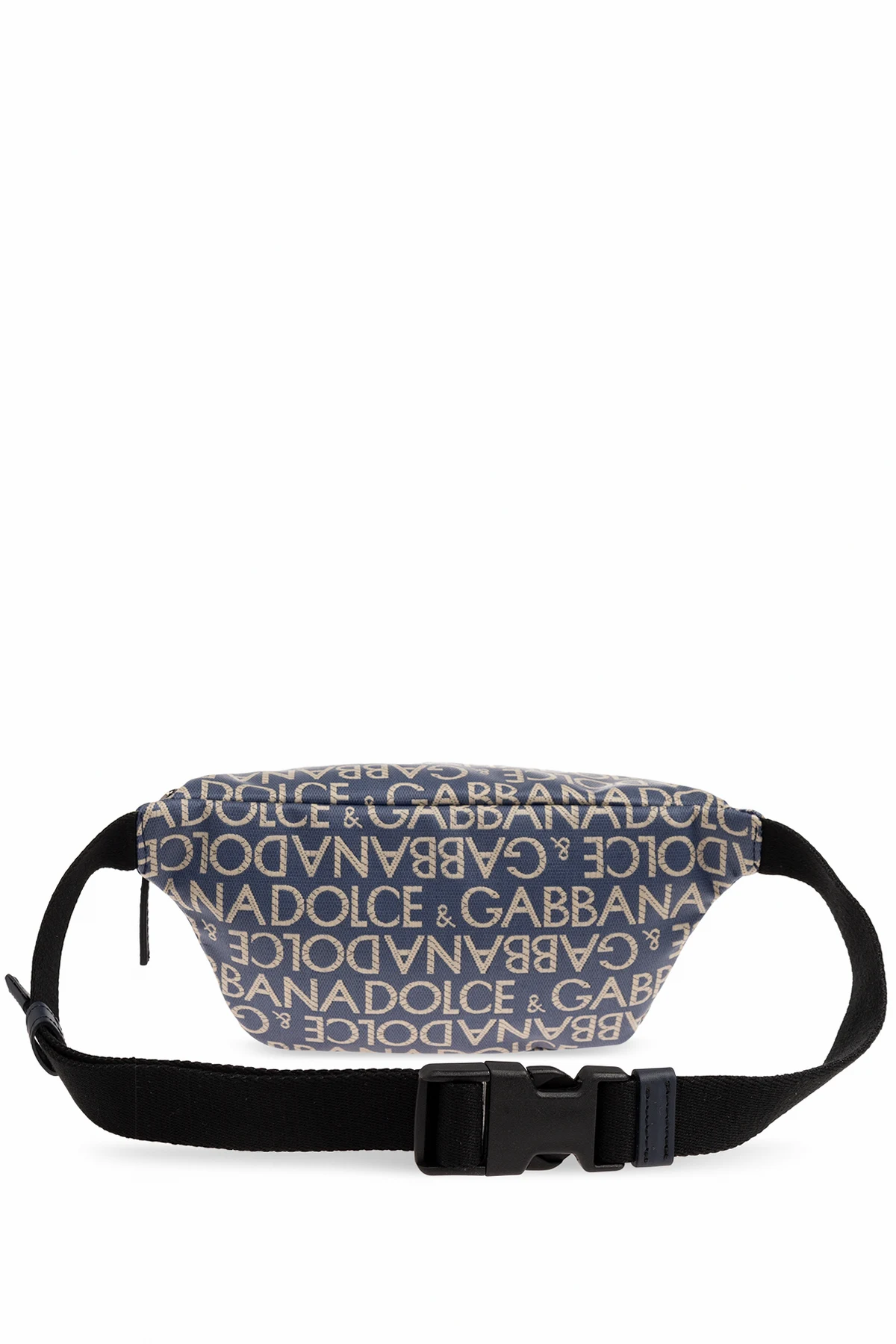 Blue belt bag from Dolce & Gabbana Kids. Made of fabric with leather trims, this model features a zip fastening, cream logo pattern, zipped front pocket, metal logo detail, adjustable strap and one internal compartment.
