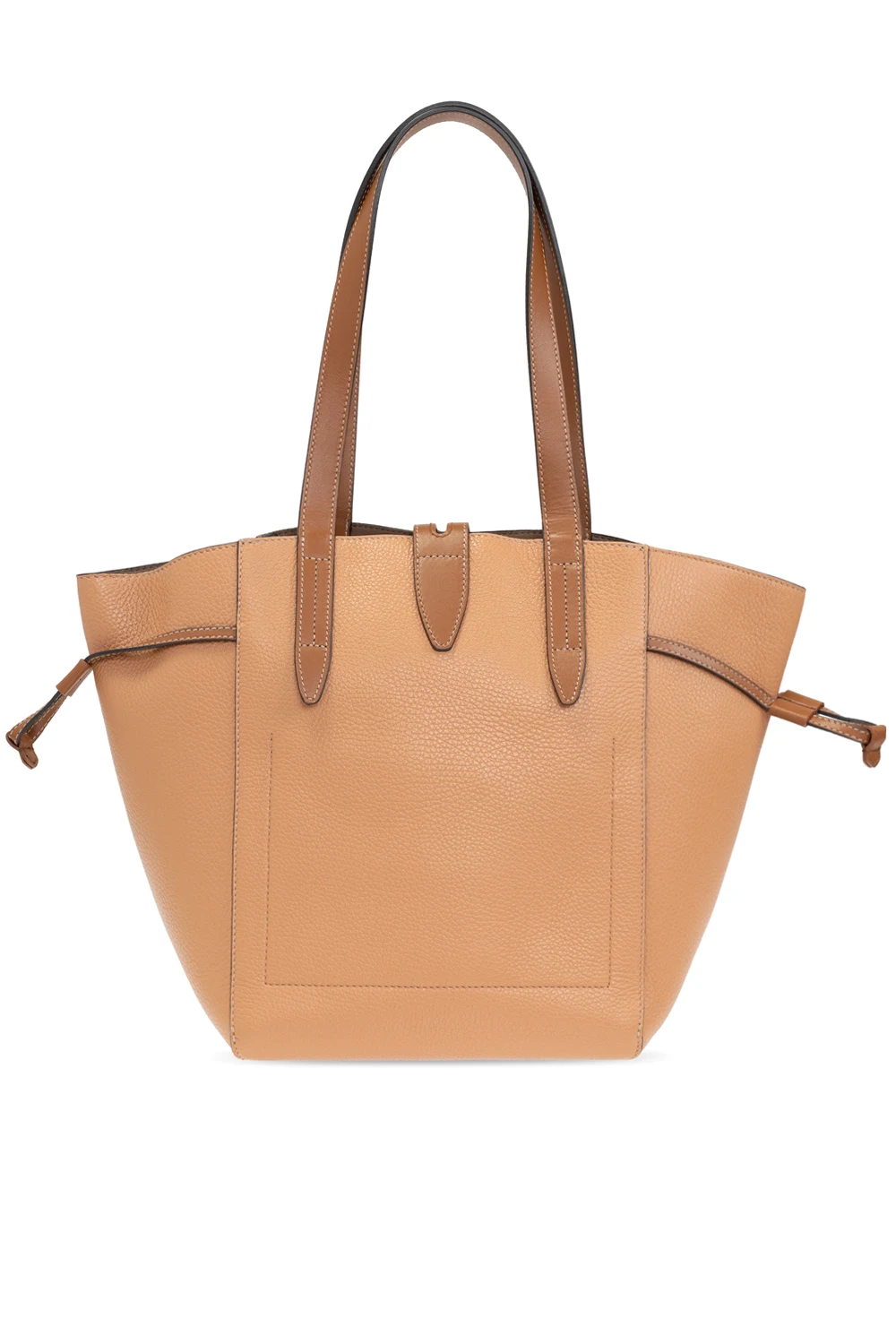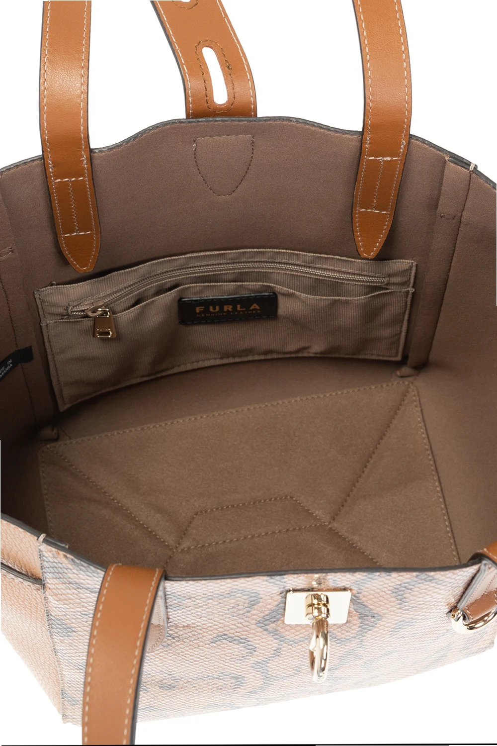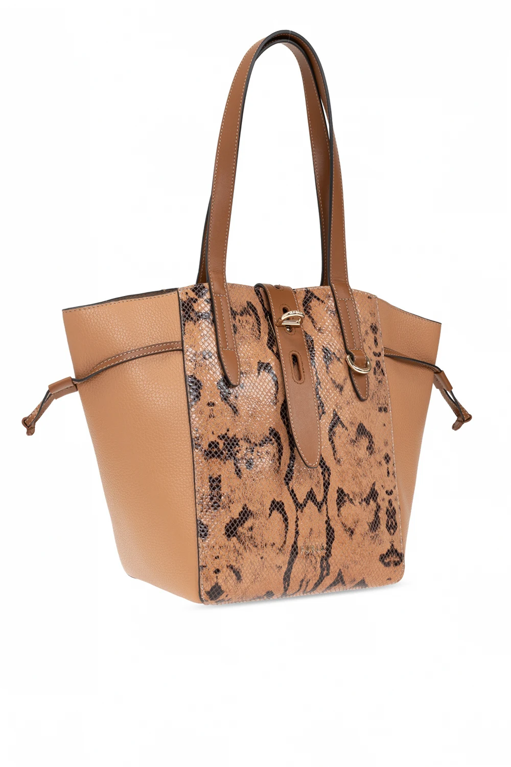 Brown ‘Toni’ shoulder bag from Furla. Made of leather with a snakeskin effect, this model has a decorative closure, drawstrings on the sides, metal logo, two half-round handles, gold-tone metal hardware and one internal compartment with one zip pocket and two slip pockets.