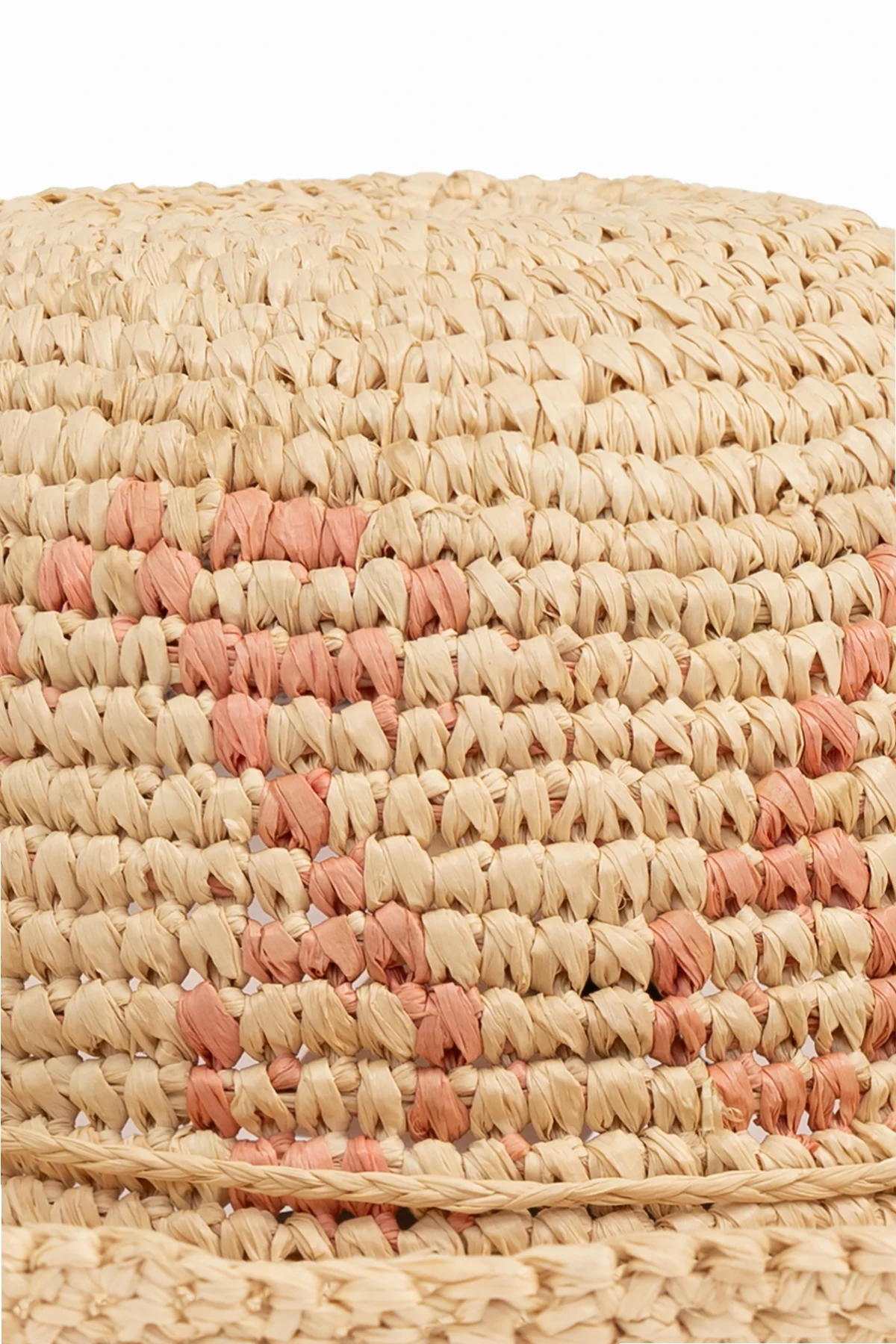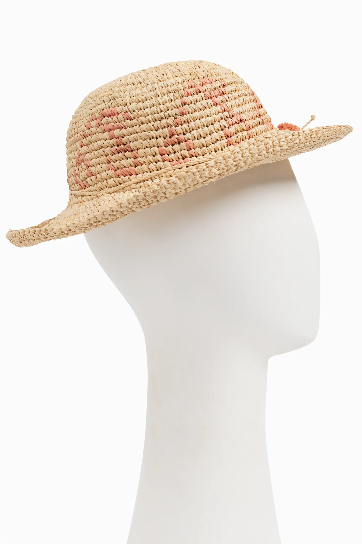 Die Form des Hutes ist eine klassische, runde Form mit leicht abfallender Krempe, die ihm einen einzigartigen Charme verleiht. Das Muster besticht durch ein dezentes, rosafarbenes Motiv, das an Blumen oder Früchte erinnert und hervorragend mit der dominierenden, beigen Farbe kontrastiert.