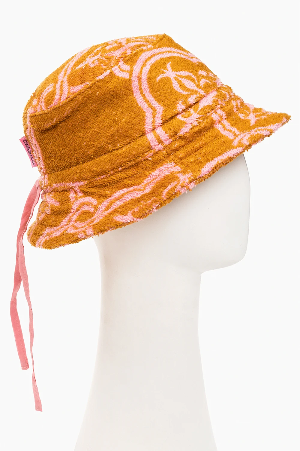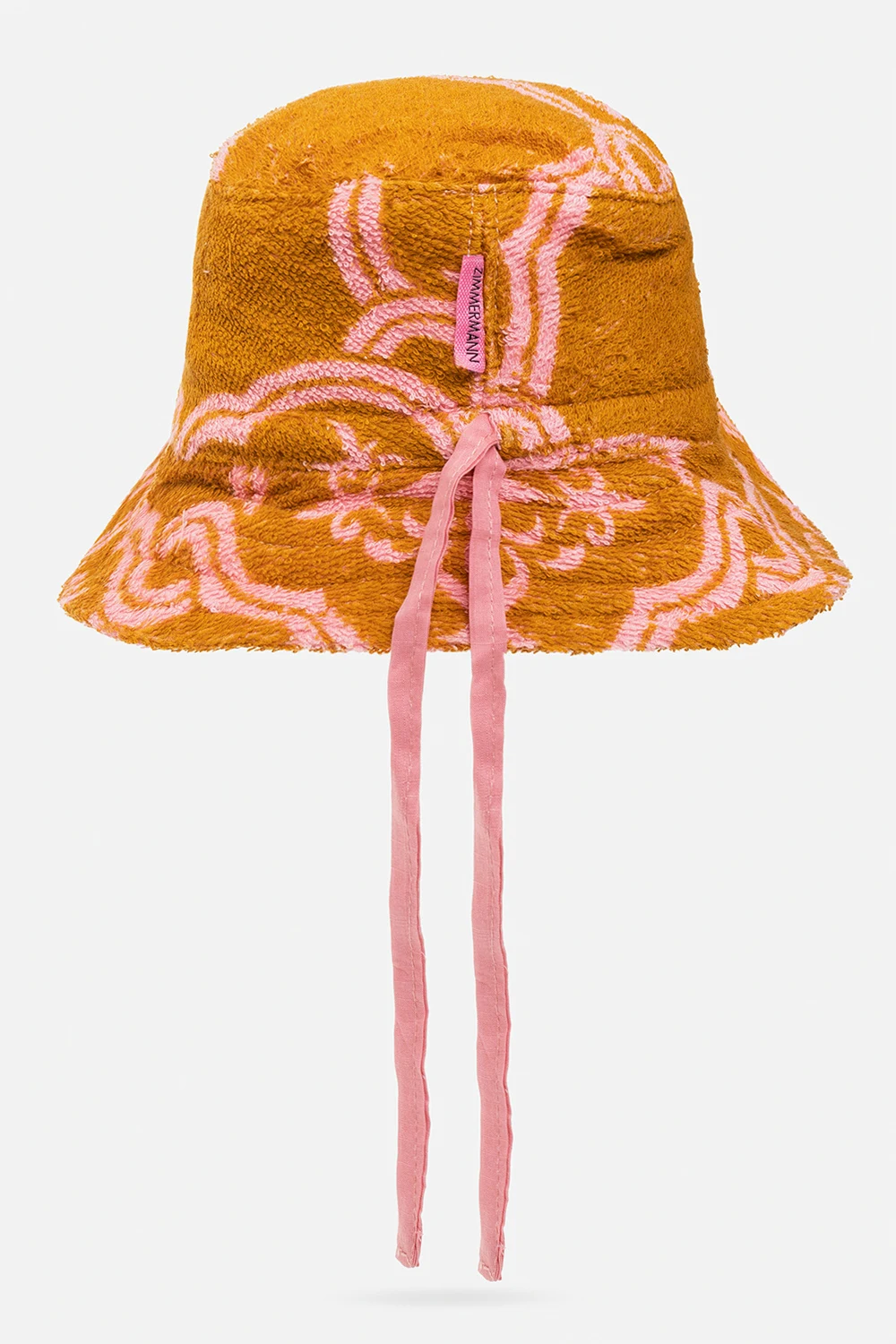 Orange and pink bucket hat from Zimmermann Kids. Crafted in terry cotton, this item showcases an all-over pattern and a drawstring fastening at the back.
