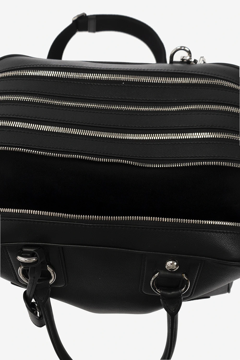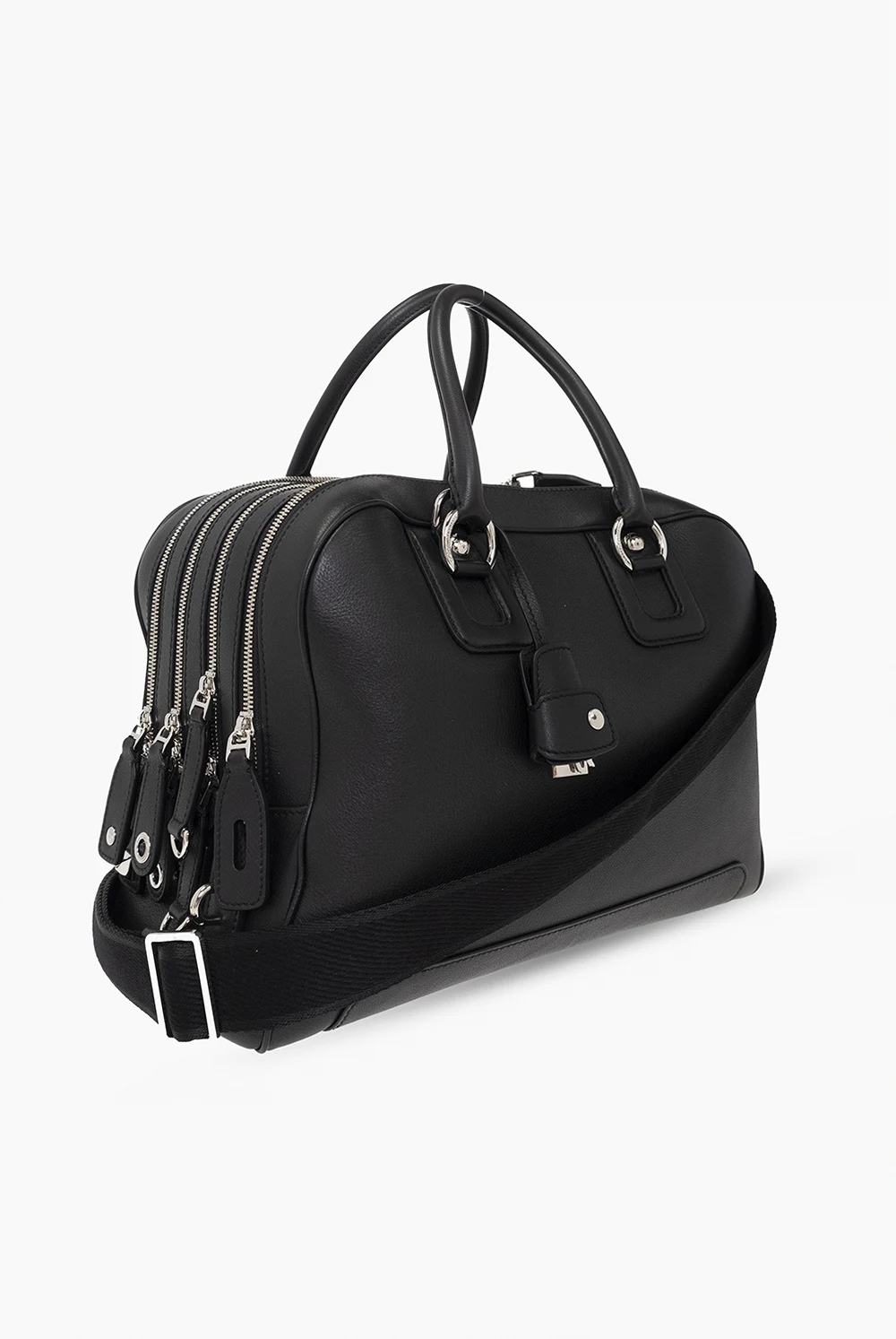Black shoulder bag from Dolce & Gabbana. Crafted from calf leather, this design fastens with a two-way zipper and showcases a metal logo plaque on the front and two half-round handles – one is accompanied with a padlock charm with two keys. It is complete with a detachable and adjustable shoulder strap, silver-tone metal hardware and four internal compartments – one houses a slip pocket, the other one has a zip pocket.