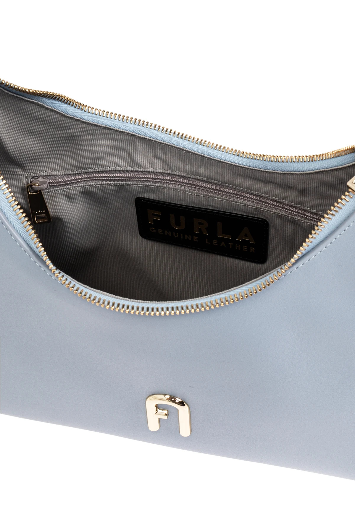 Auf der Vorderseite der Tasche befindet sich ein luxuriöses goldenes Logo in Form des Buchstabens "A", das perfekt mit dem Reißverschluss in derselben Farbe harmoniert. Das Innere der Tasche ist mit einem Futter ausgekleidet und bietet zusätzliche Taschen: eine Einstecktasche und eine mit Reißverschluss, was ihre Funktionalität erhöht. Im Inneren befindet sich außerdem ein eingenähtes Markenlogo "FURLA" mit dem Hinweis auf echtes Leder, das für höchste Verarbeitungsqualität steht.