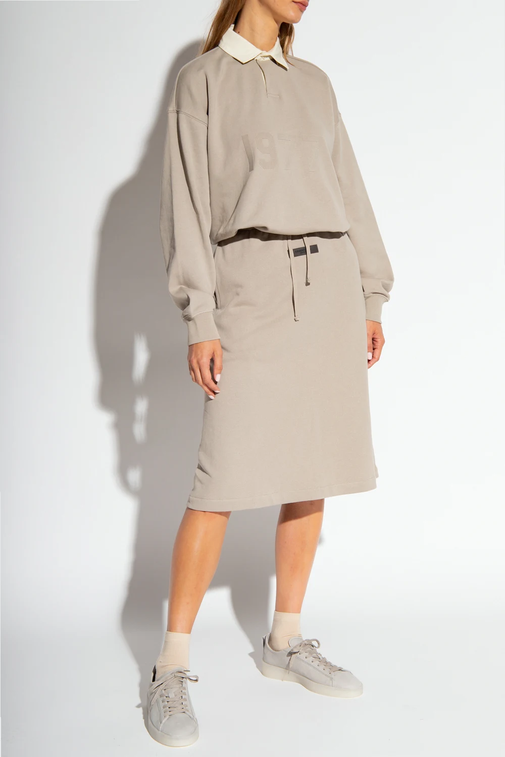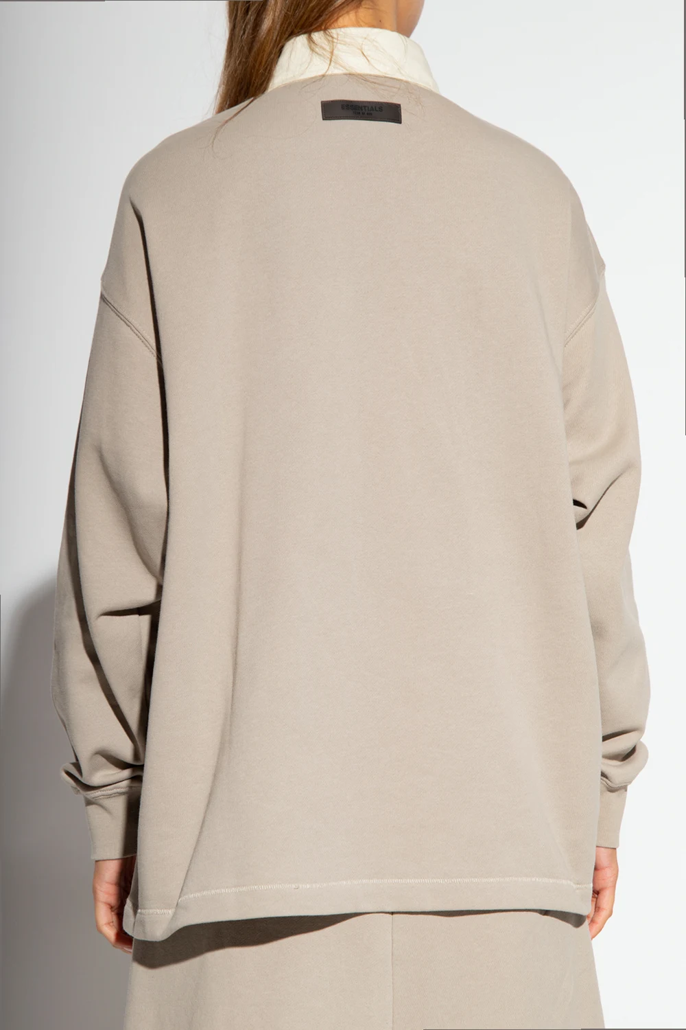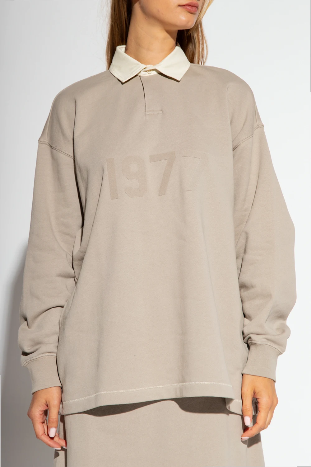 Light grey polo shirt from Fear Of God Essentials. Made of cotton, this garment features a cream buttoned collar, ‘1977’ print with a velvet finish, the label’s signature black rubber logo patch at the back and long sleeves with ribbed cuffs.
