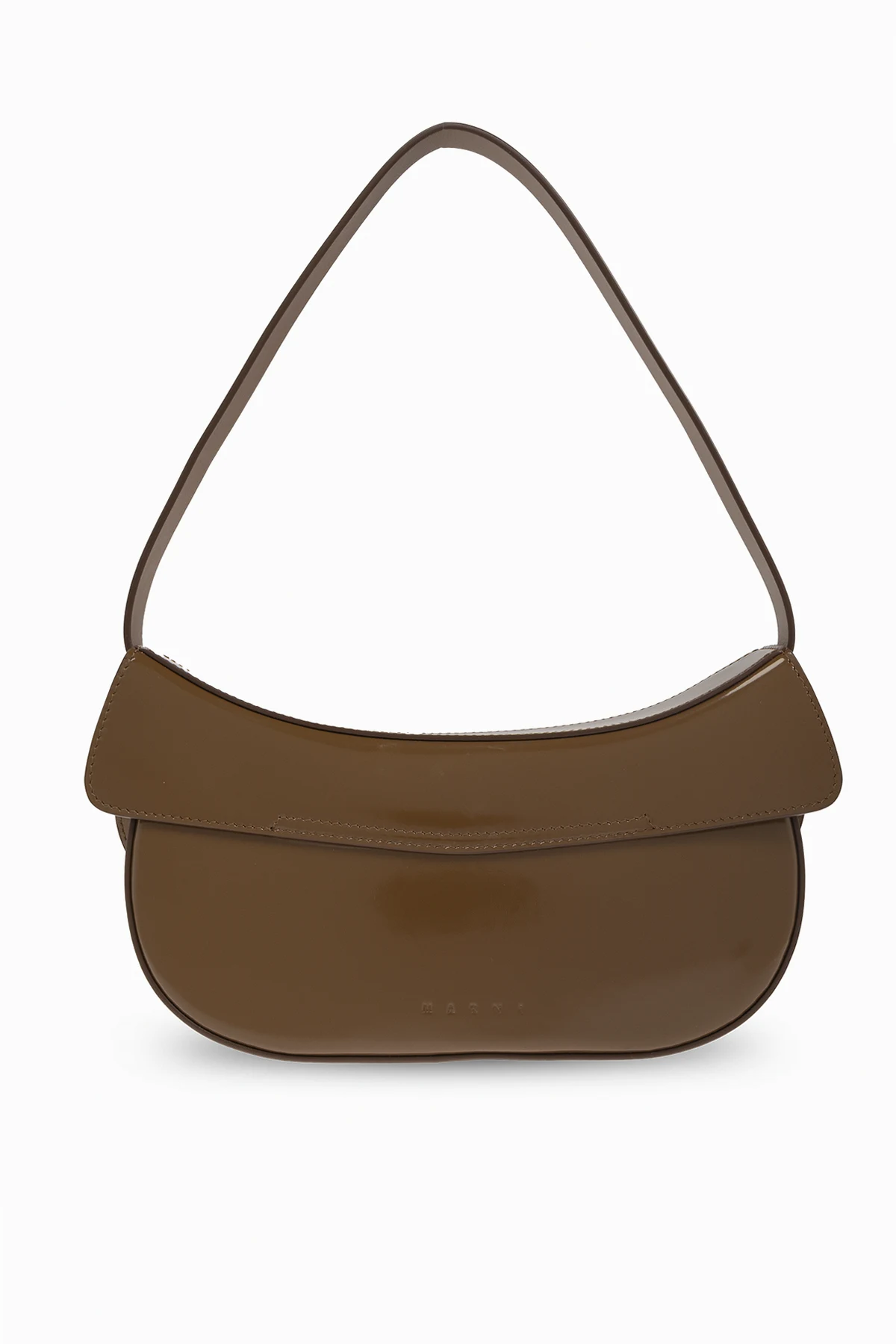 Wir präsentieren Ihnen die Schultertasche "Butterfly Medium" aus der Kollektion der exklusiven Marke Marni . Diese exquisite Tasche begeistert mit ihrer klassischen, abgerundeten Form und der glatten, glänzenden braunen Oberfläche, die einen subtilen Glanz ausstrahlt.