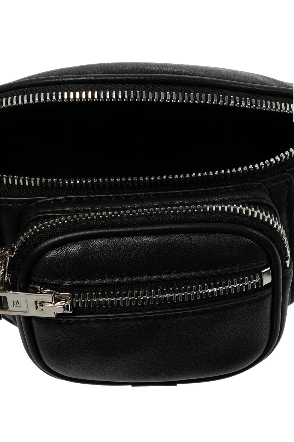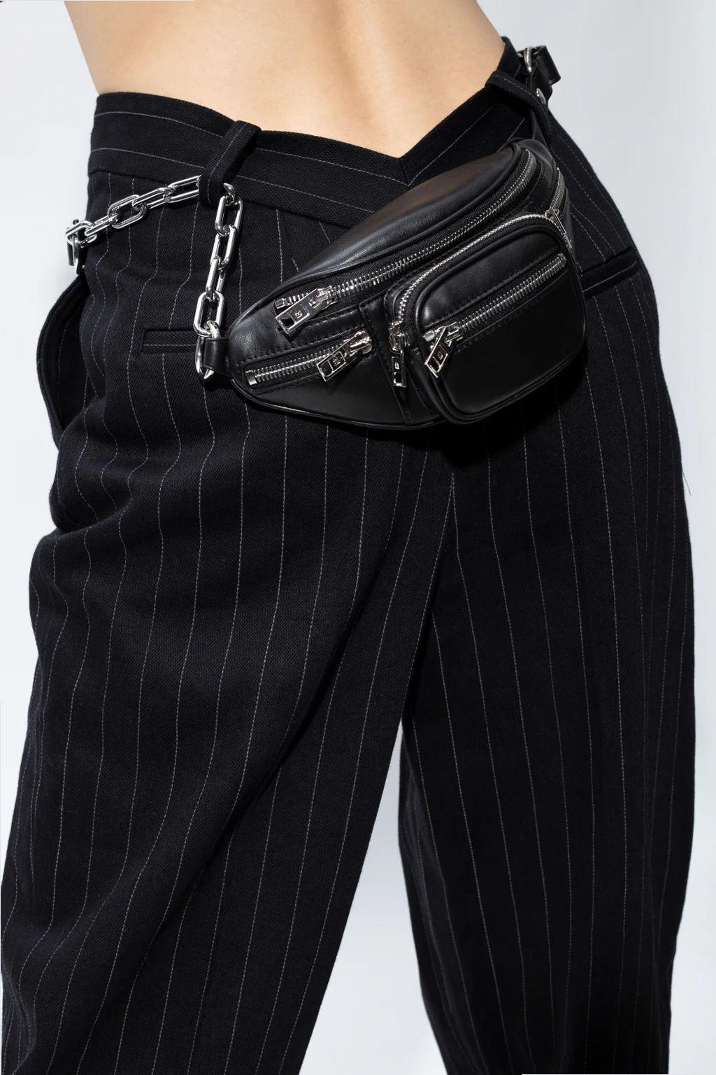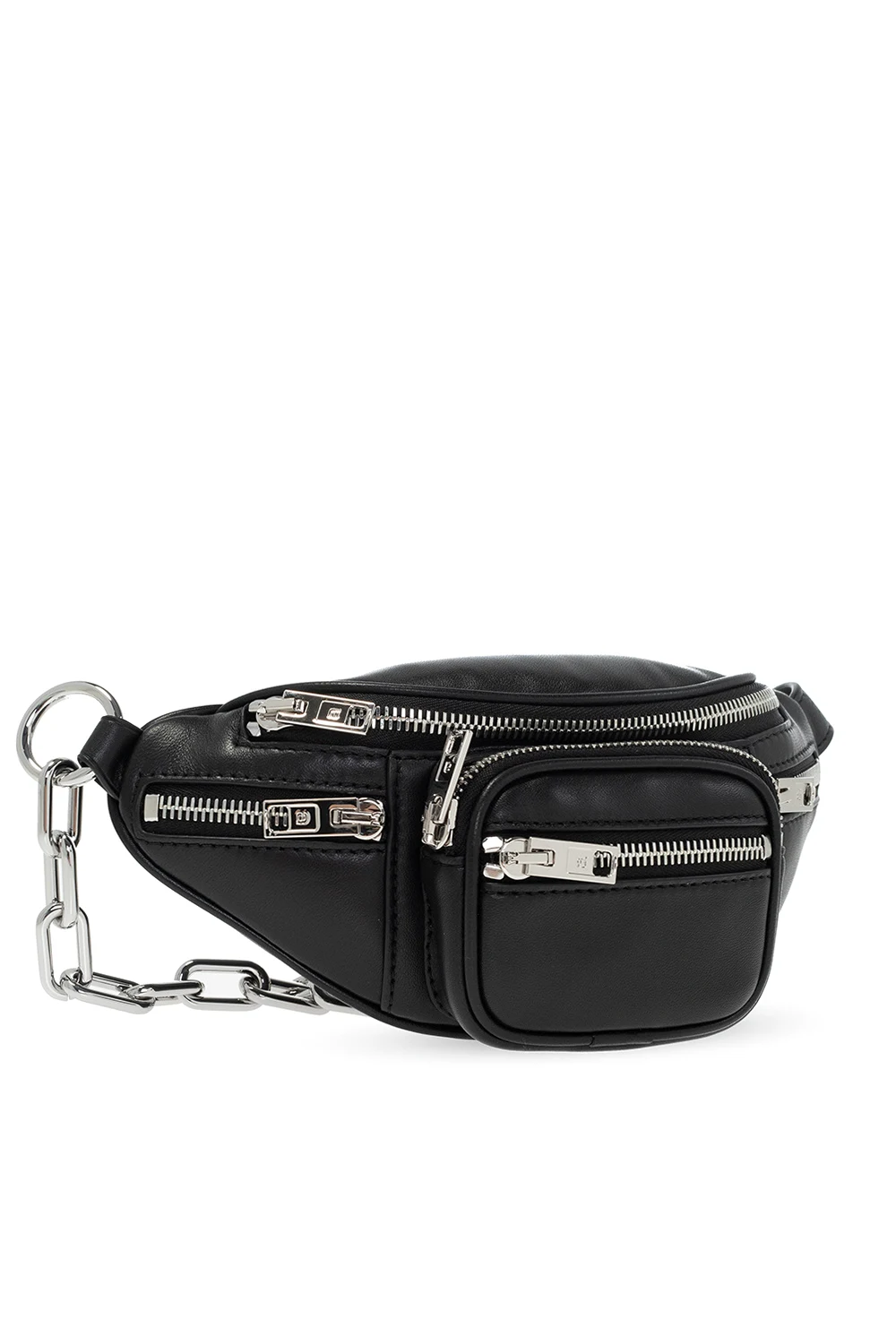 Black ‘Attica’ waist bag from Alexander Wang. Size mini. Made of leather, this design fastens via a zip and features numerous zip pockets, an adjustable shoulder strap reinforced with a chain and one internal compartment.