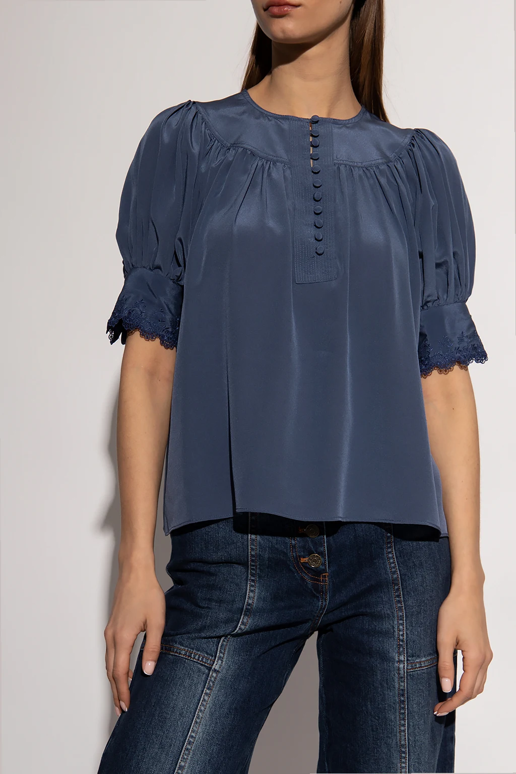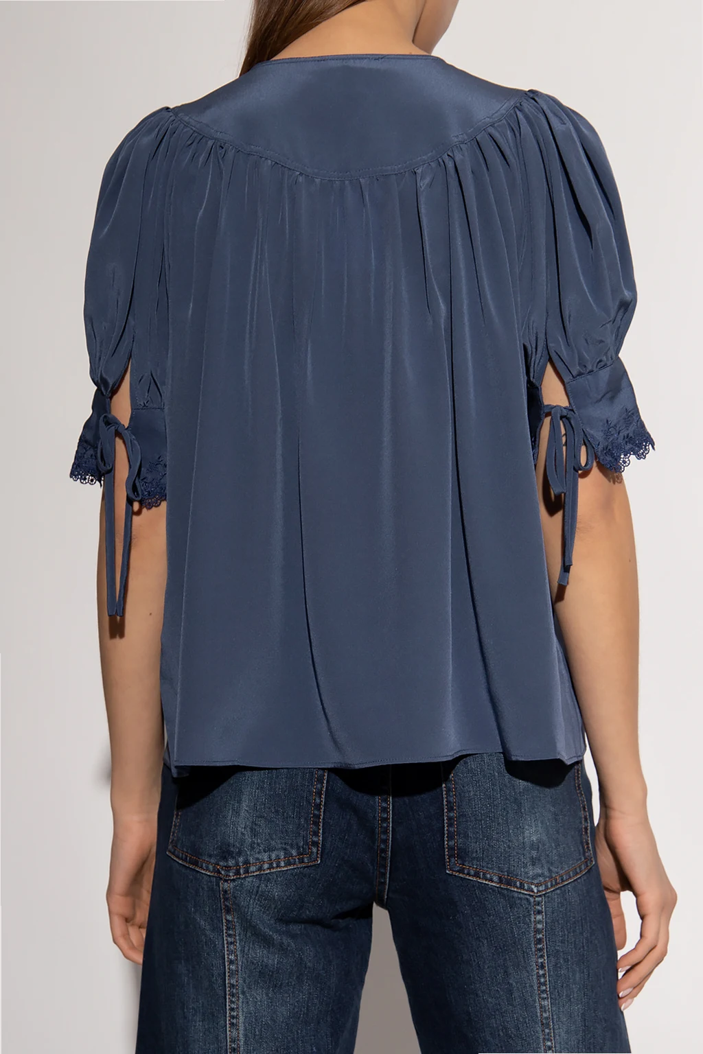 Greyish blue ‘Karina’ top from Ulla Johnson. Made of silk, this style fastens via buttons and features distinctive gathers on the neckline and puff sleeves with tie cuffs and decorative embroidery.