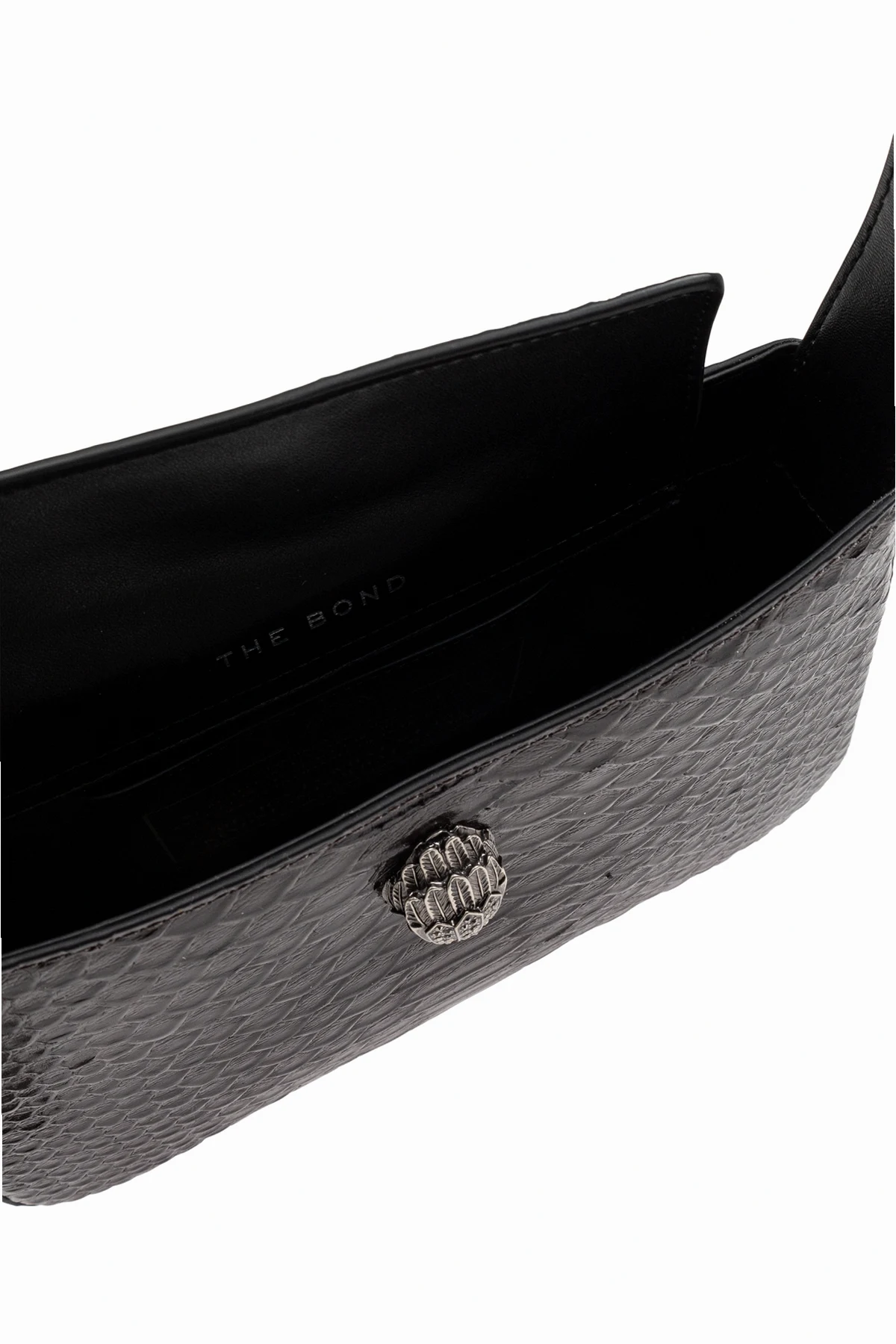 Dekorative Elemente wie die metallische Verzierung in Schuppenform und die seitliche Metallkette verleihen der Tasche Raffinesse. Das in Schwarz gehaltene Innenleben mit dem sichtbaren Namen "THE BOND" betont ihre Exklusivität.