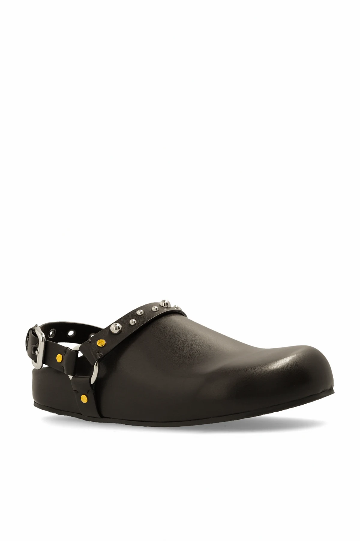 Aus glattem, schwarzem Material gefertigt, zeichnen sich diese Slipper durch eine geschlossene Vorderseite aus, die die Zehen bedeckt und ihnen das Aussehen von Clogs verleiht. Die offene Ferse mit einem verstellbaren Fersenriemen, verziert mit silbernen Nieten und gelben Zierelementen, verleiht ihnen einen unverwechselbaren Charakter. Eine Metallschnalle am Riemen ermöglicht eine perfekte Anpassung an den Fuß und sorgt für Komfort und Eleganz.