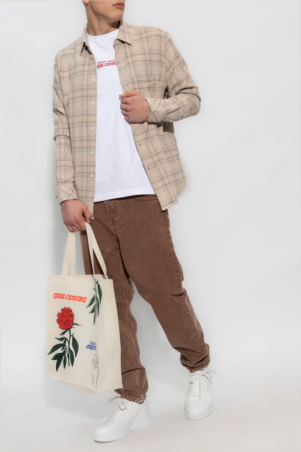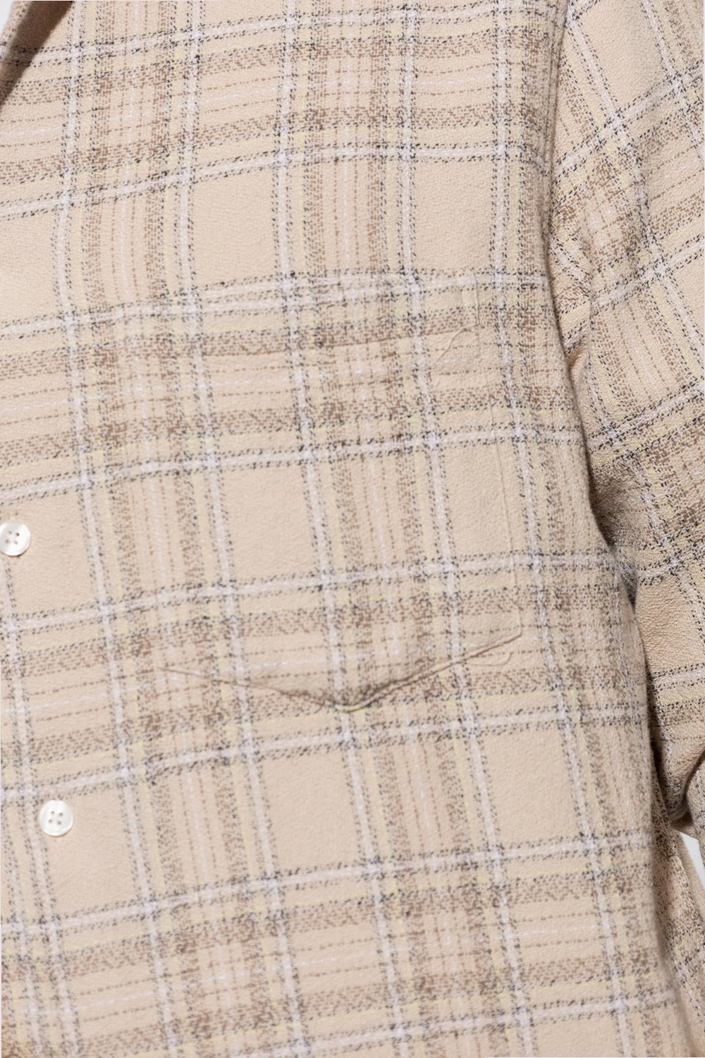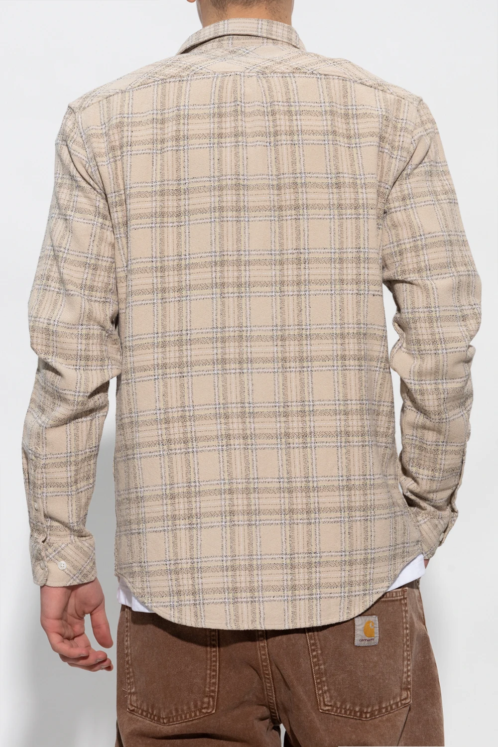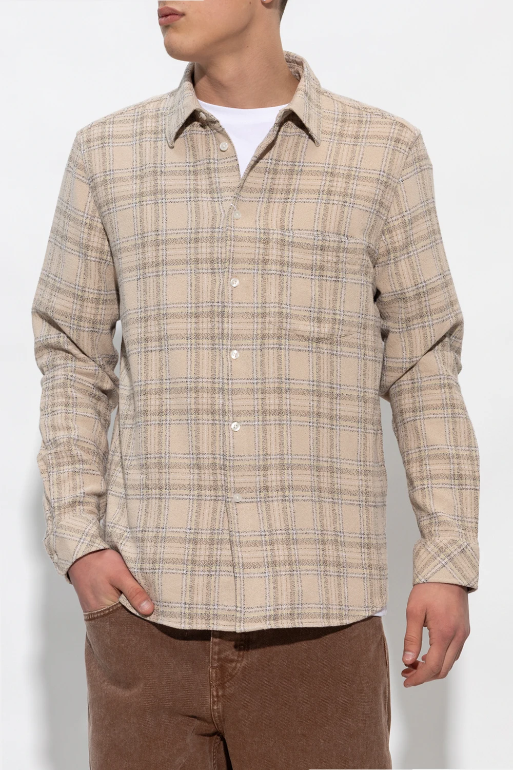 Beige ‘Liam’ shirt from Samsoe Samsoe. Crafted from organic cotton, this design features button fastenings, check pattern, slip pocket and long sleeves with buttoned cuffs.