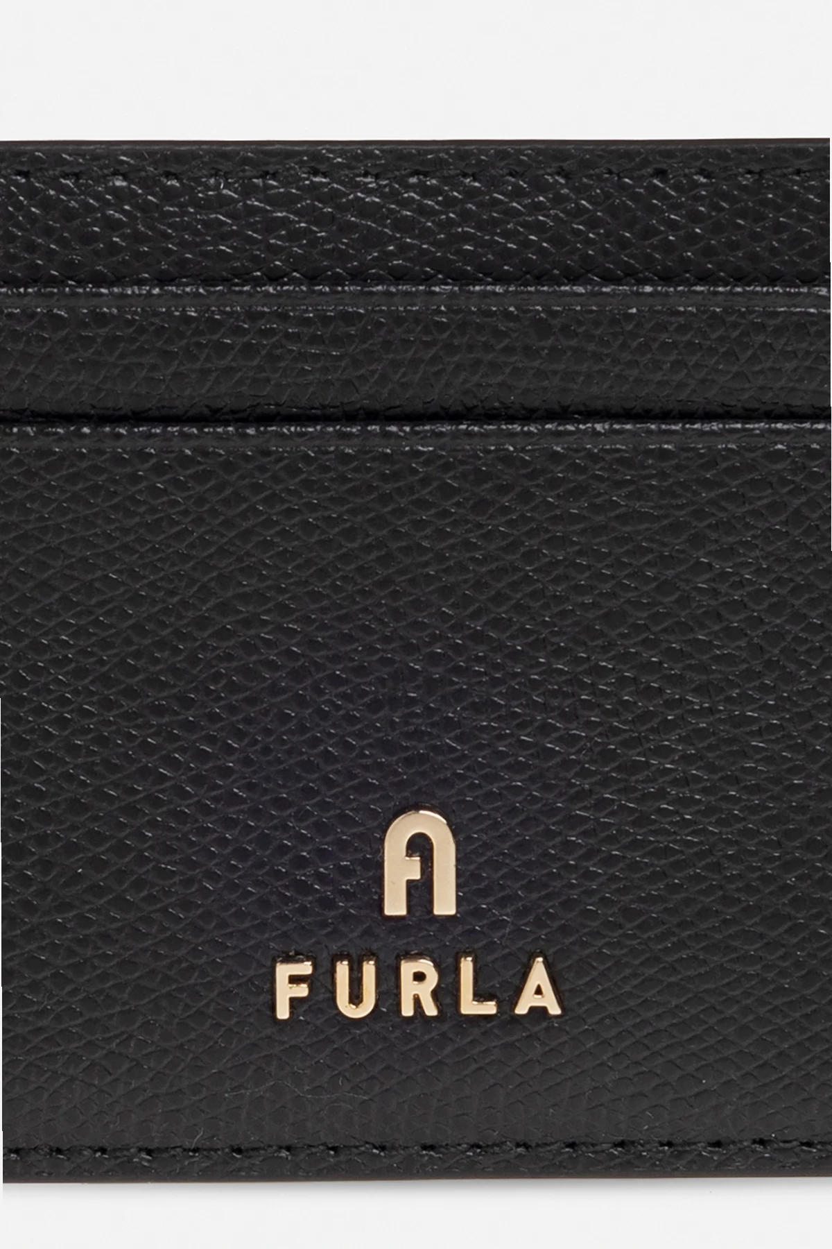 Black ‘Camelia’ card case from Furla. Crafted from leather, this design features a logo application, four card slots, light gold-tone metal hardware and one internal compartment.
