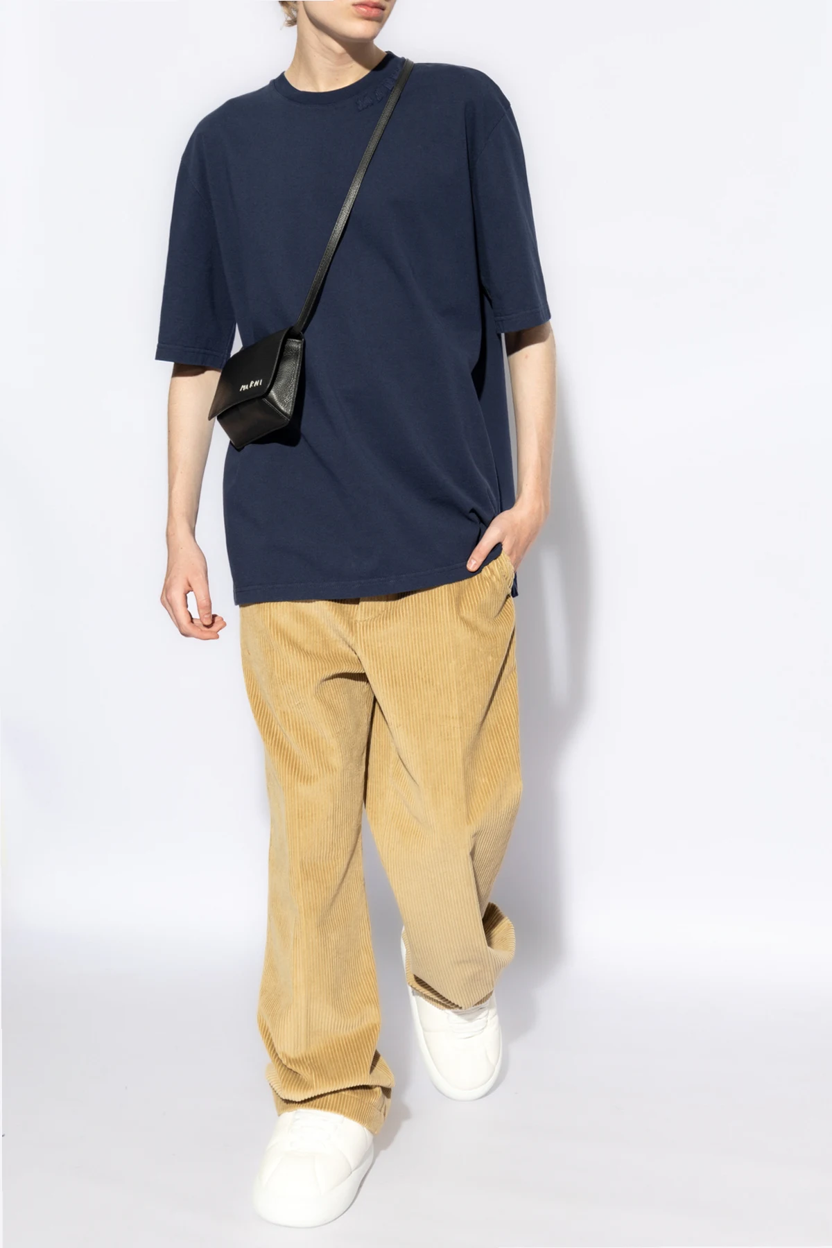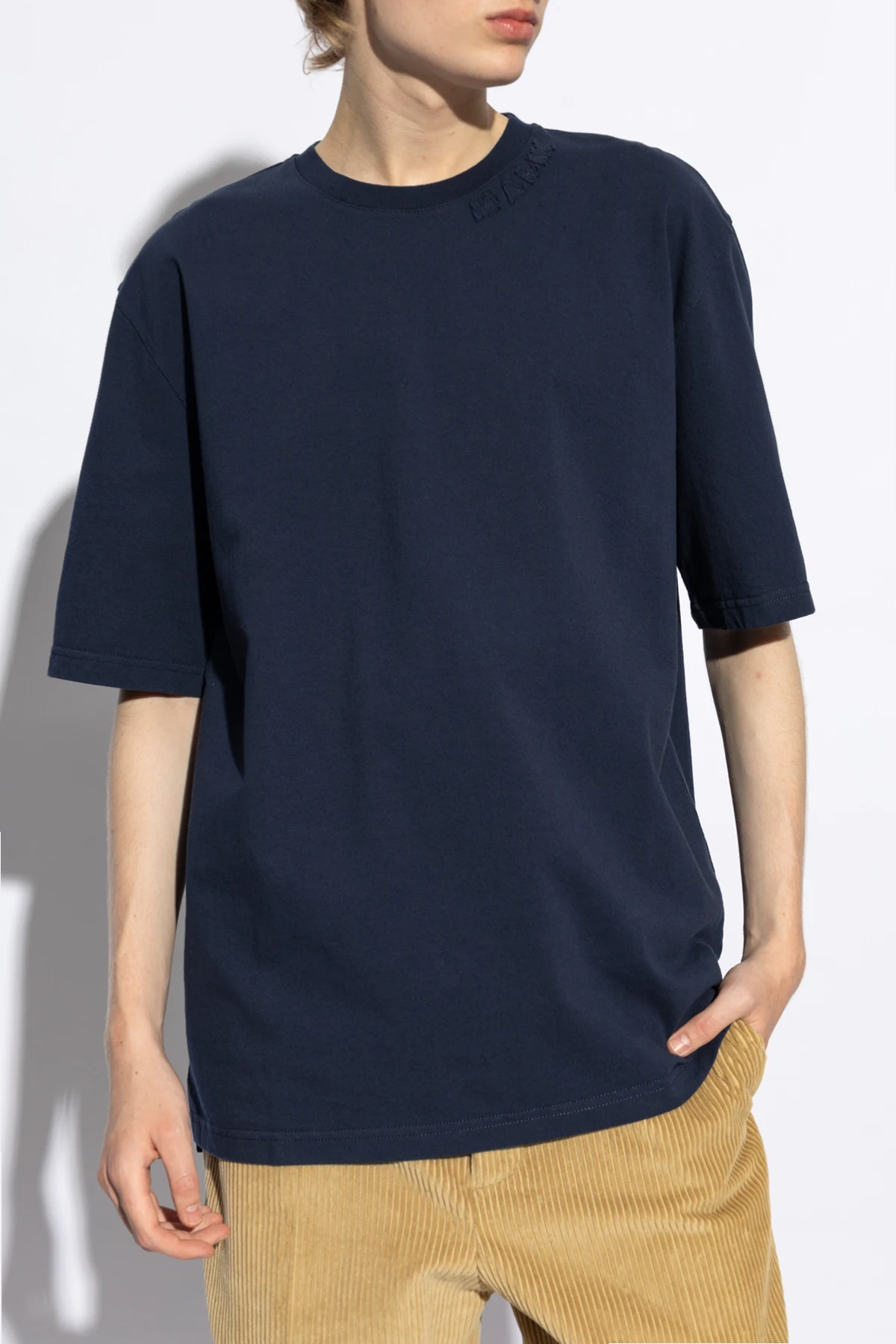 Wir präsentieren Ihnen ein außergewöhnliches T-Shirt mit Logo von der renommierten Marke Marni , das die Quintessenz der Eleganz in Verbindung mit alltäglichem Komfort darstellt. Gänzlich aus hochwertigster Baumwolle gefertigt, zeichnet sich dieses marineblaue T-Shirt durch einen klassischen Schnitt aus, der Bewegungsfreiheit und ein makelloses Aussehen in jeder Situation gewährleistet.