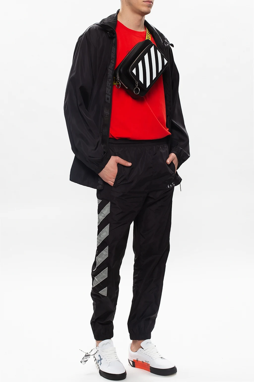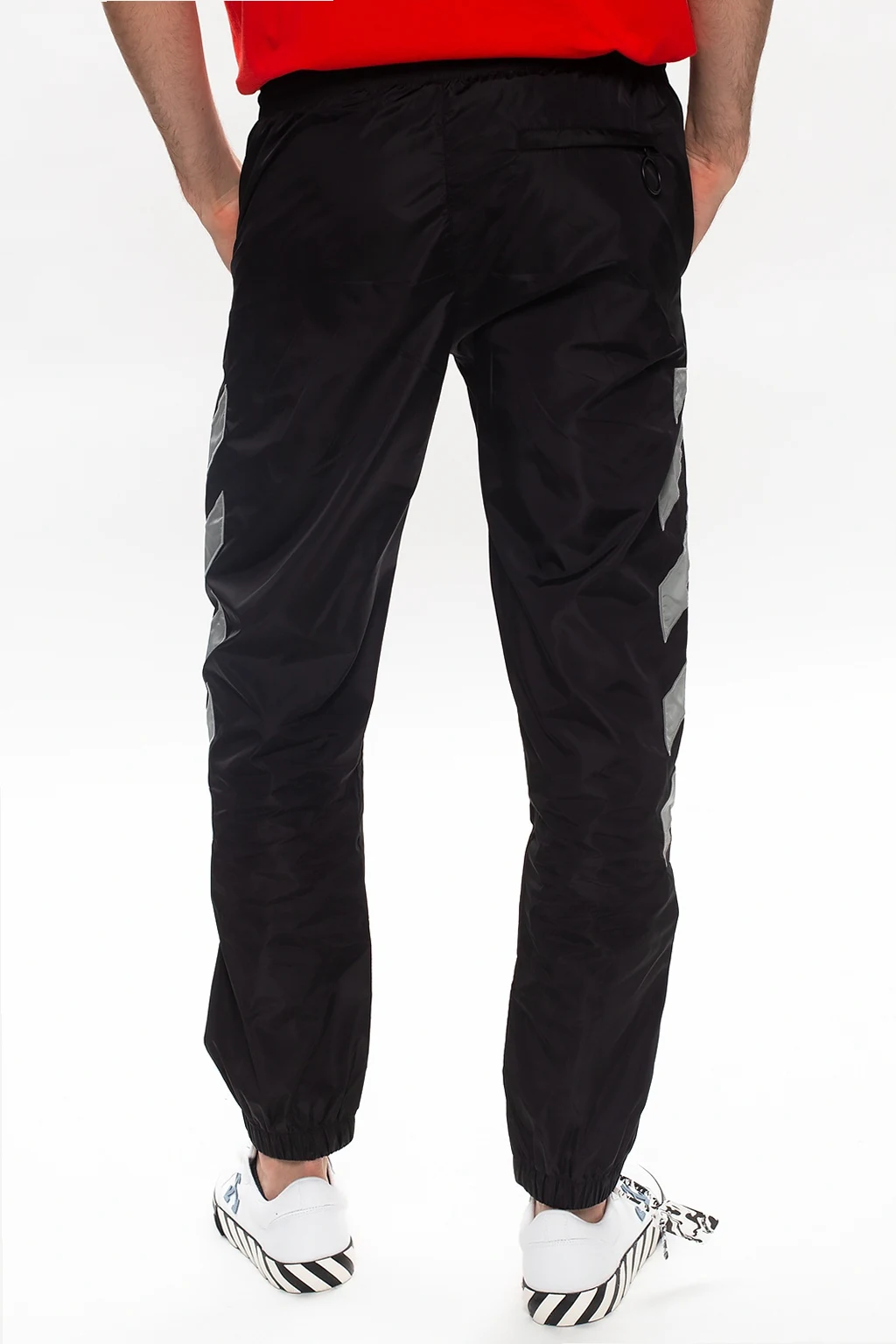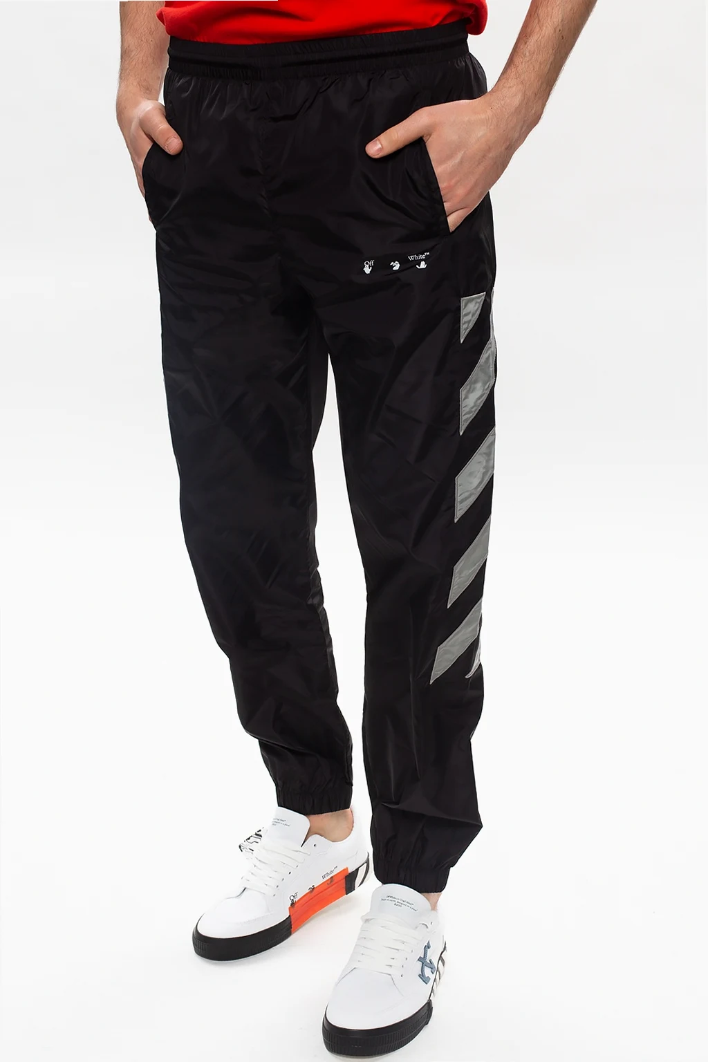 Black sweatpants from Off-White. Emblazoned with a white logo print and grey panels along the sides, this pair is complete with an elasticated waistband with cinching drawcords, twi side seam pockets, one back zipped pockets and ribbed cuffs.