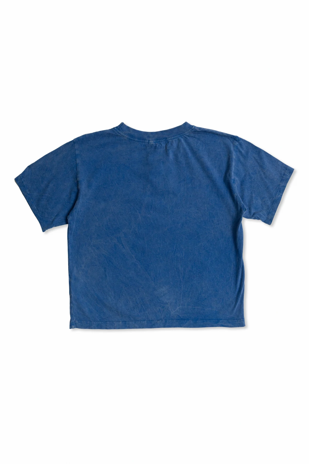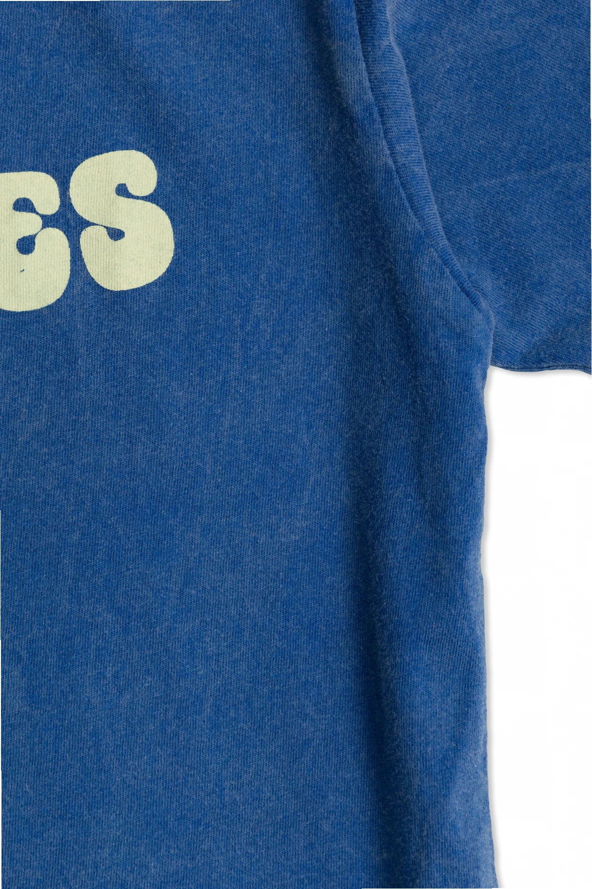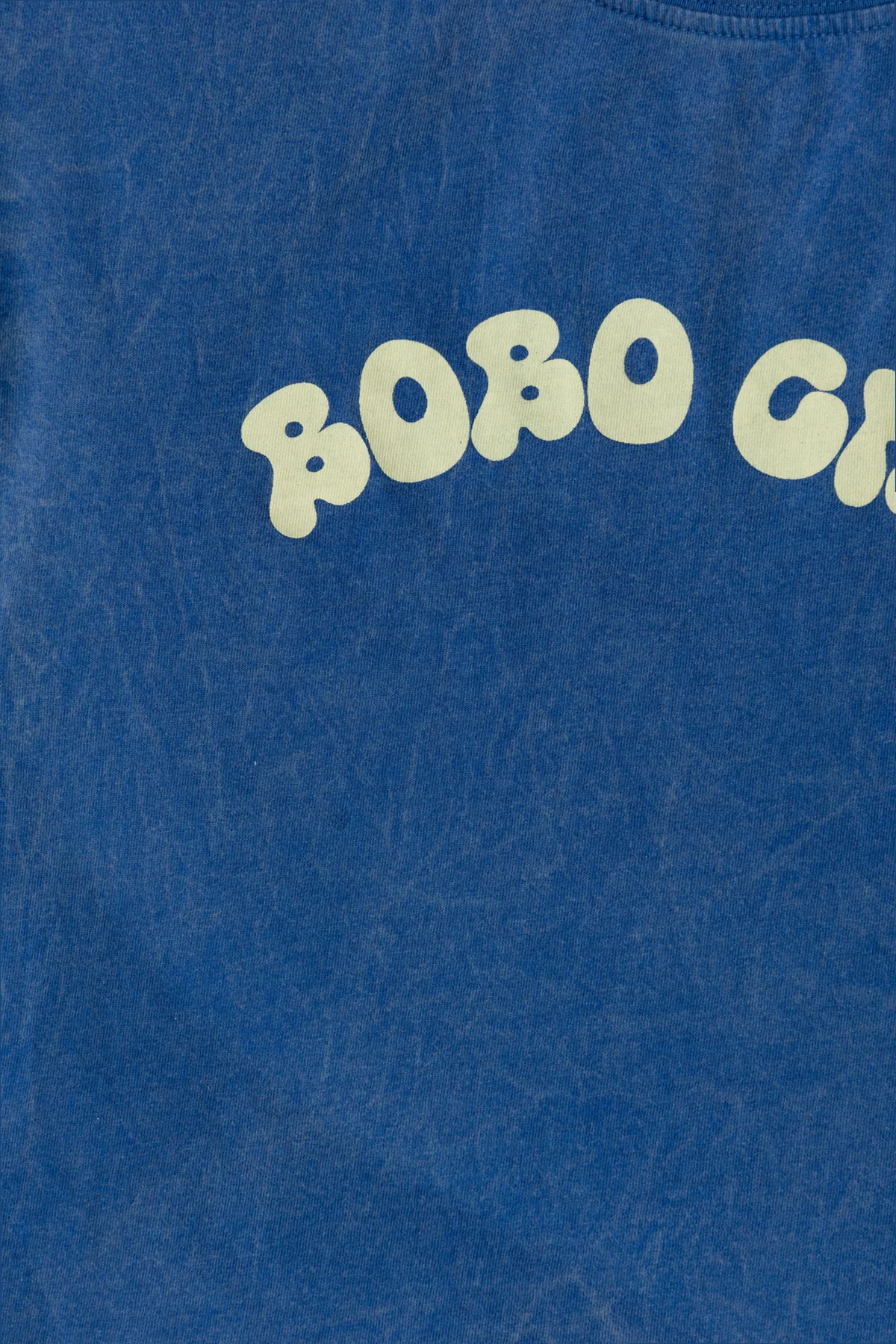 Das T-Shirt ist aus weicher, zarter Baumwolle gefertigt, was einen hohen Tragekomfort gewährleistet. Es hat einen klassischen Schnitt mit kurzen Ärmeln, und seine blaue Farbe mit leicht verwaschenem Effekt verleiht ihm einen besonderen Charakter. Auf der Vorderseite befindet sich der Aufdruck "BOBO CHOSES" im Retro-Stil, der in hellem Farbton einen Kontrast zum Hintergrund des T-Shirts bildet.
