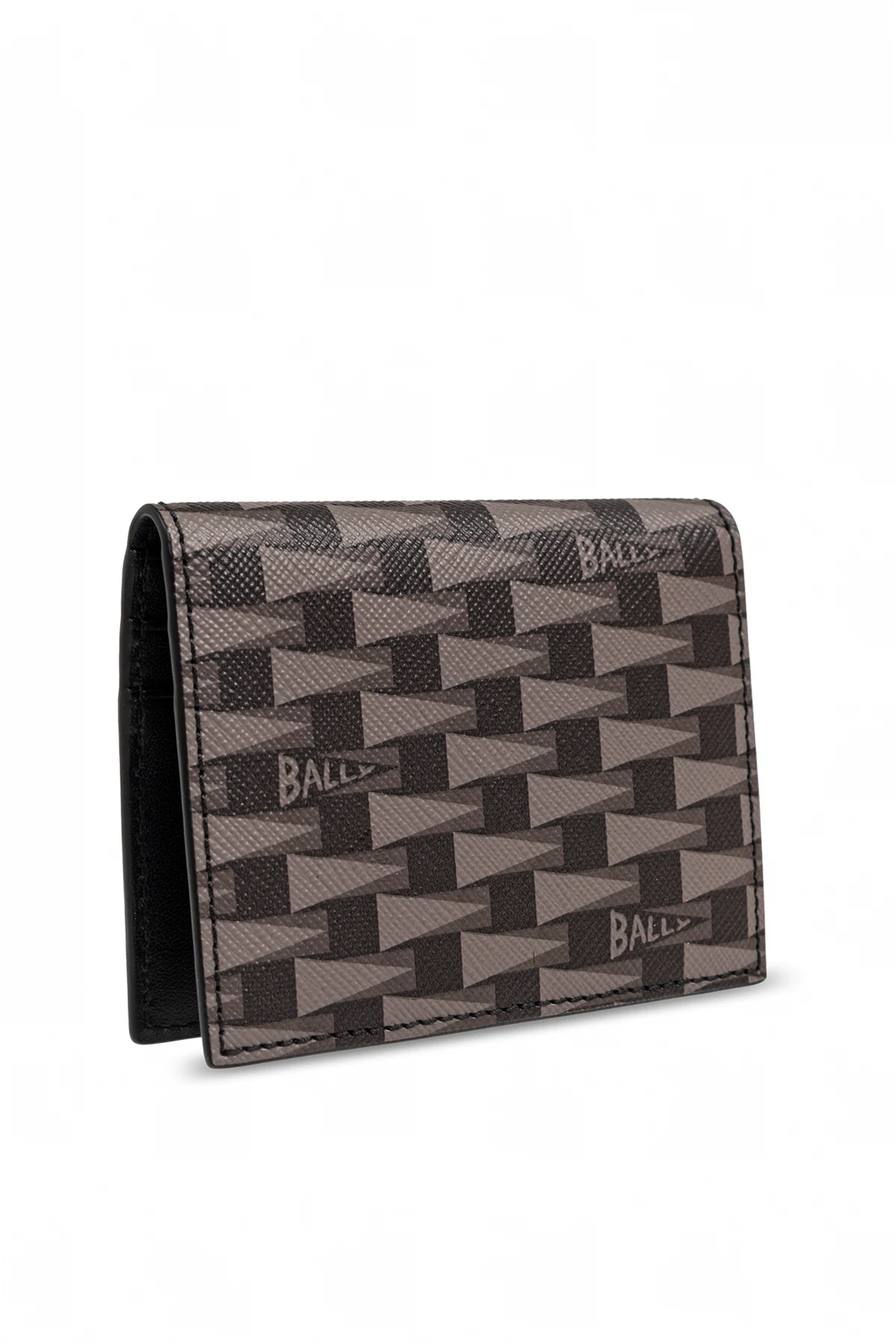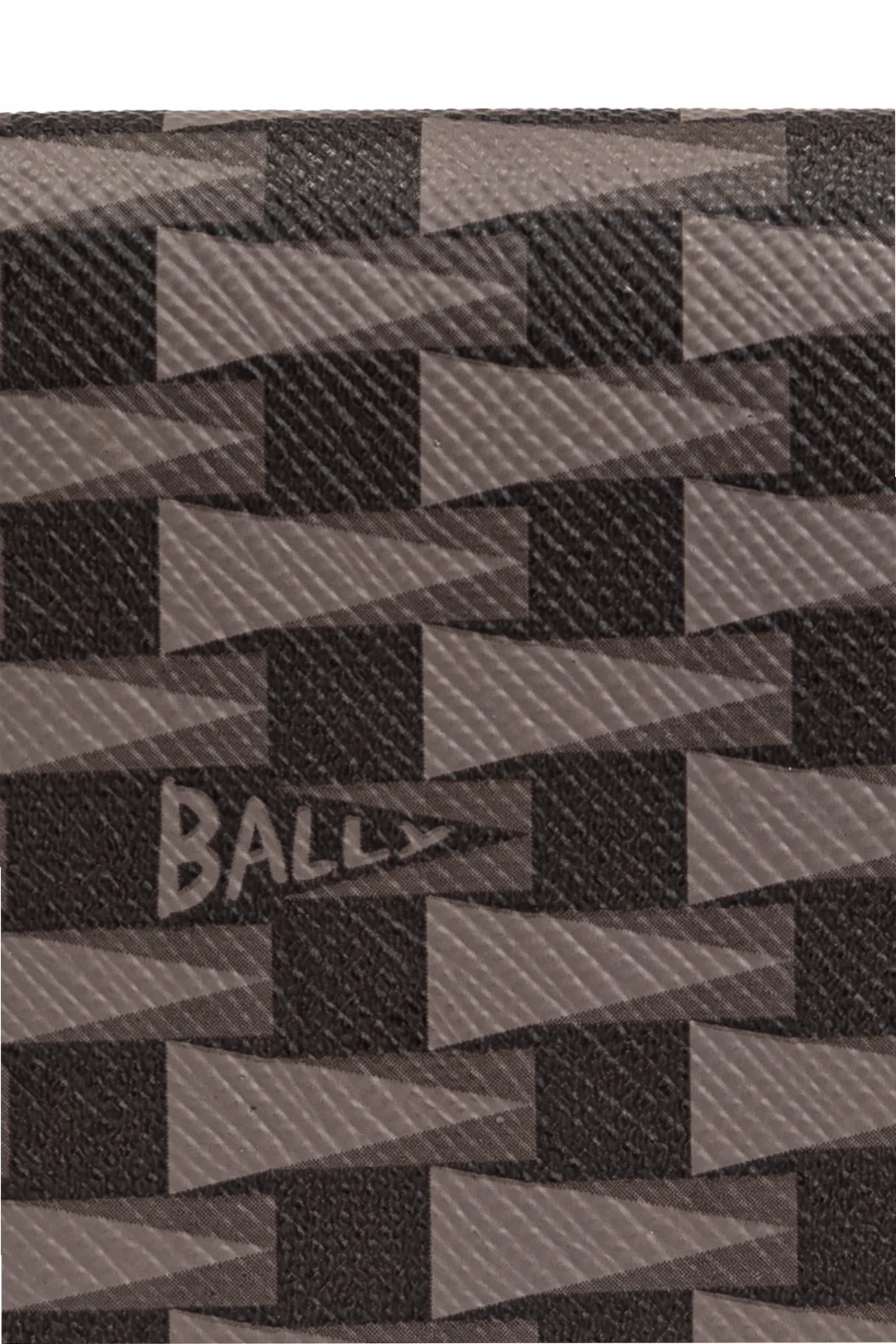 Die braune Farbe und das geometrische Muster mit wiederkehrenden Rechtecken in Brauntönen und Schwarz verleihen ihm ein raffiniertes Aussehen. Auf der Außenseite des Etuis ist subtil das Markenlogo "Bally" eingearbeitet, was die Exklusivität des Produkts unterstreicht.