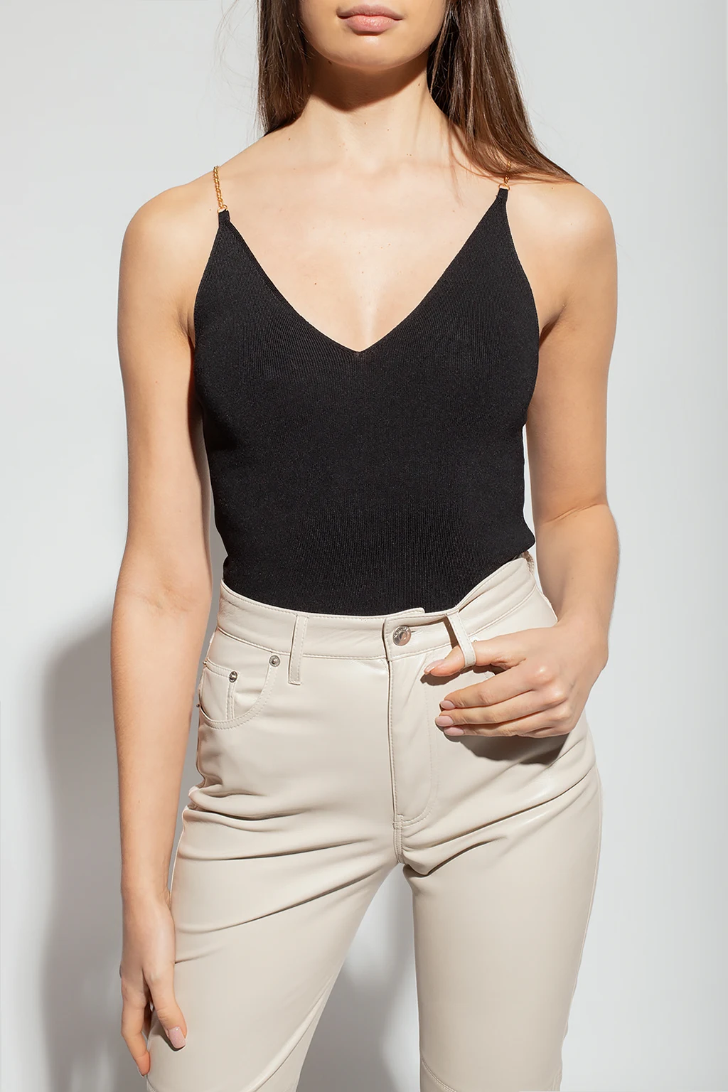 Black ‘Inna’ crop top from Nanushka. Made of cellulose-based fabric sourced from sustainably managed forests, this garment features decorative narrow straps with chain trims in gold-tone, snap hooks and a V-neck.