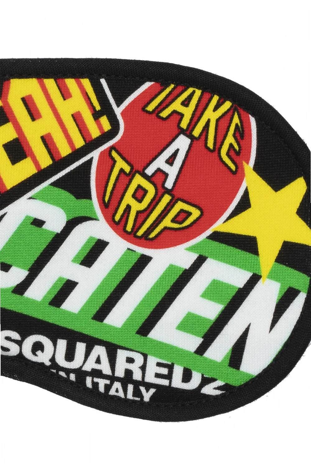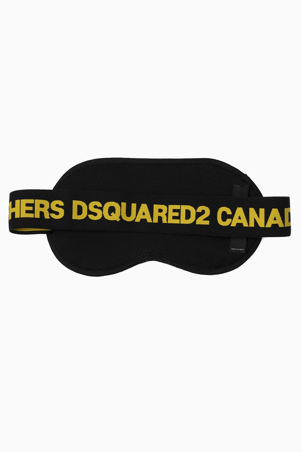 Black and yellow sleeping mask from Dsquared2. Made of cotton, this design is decorated with a colorful logo print and comes with a case.