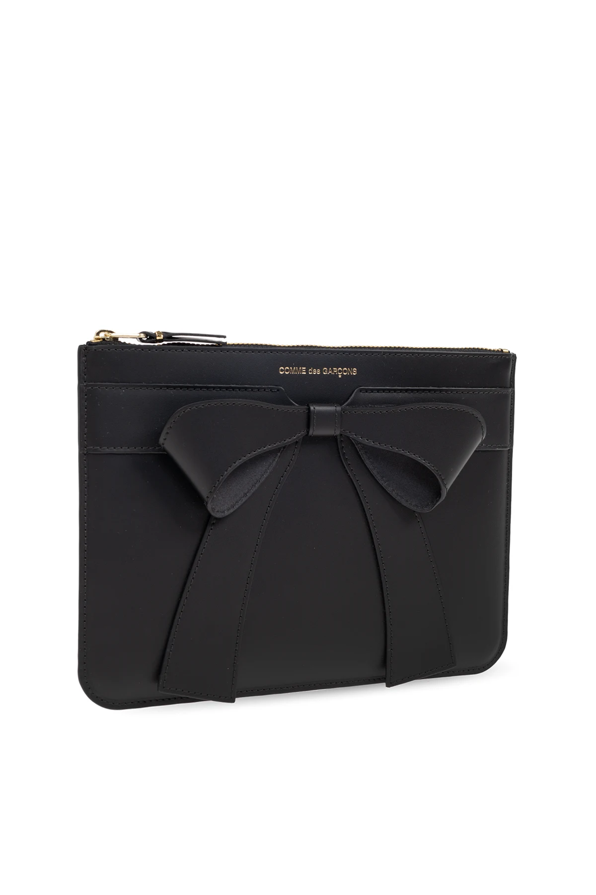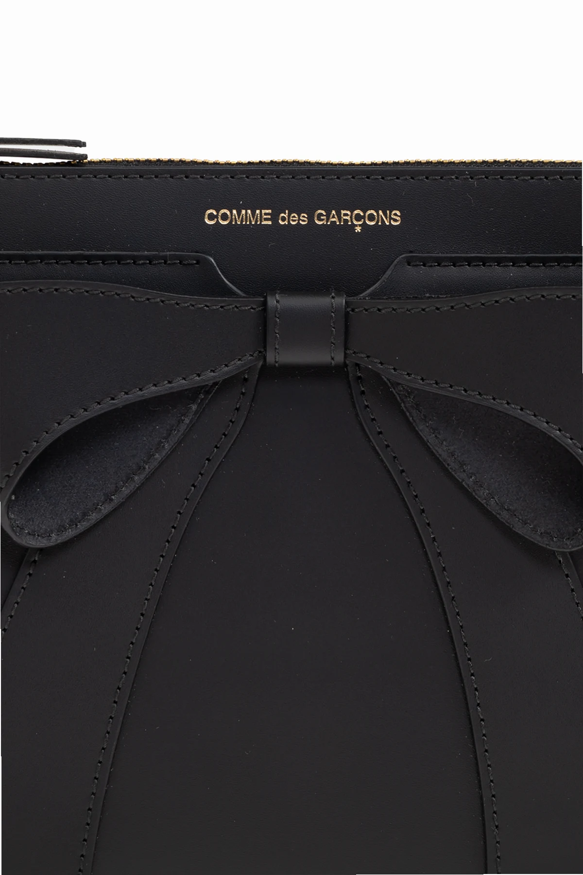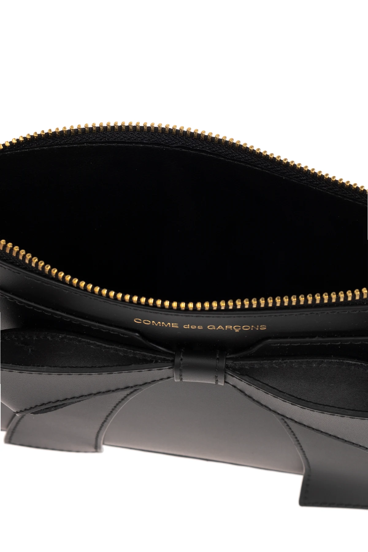 Die Tasche zeichnet sich durch eine subtile Verzierung in Form einer schwarzen Schleife aus, die ihr einen besonderen Charme verleiht, während der goldene Reißverschluss und das dezente "COMME des GARÇONS"-Logo in Gold ihren luxuriösen Charakter unterstreichen. Der Innenraum, ebenfalls in Schwarz gehalten, vervollständigt die Harmonie und Eleganz.