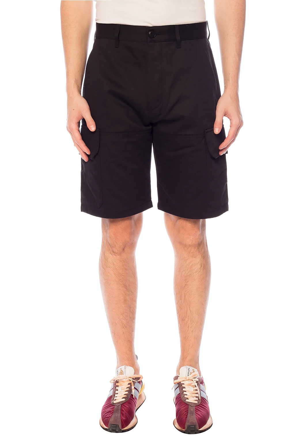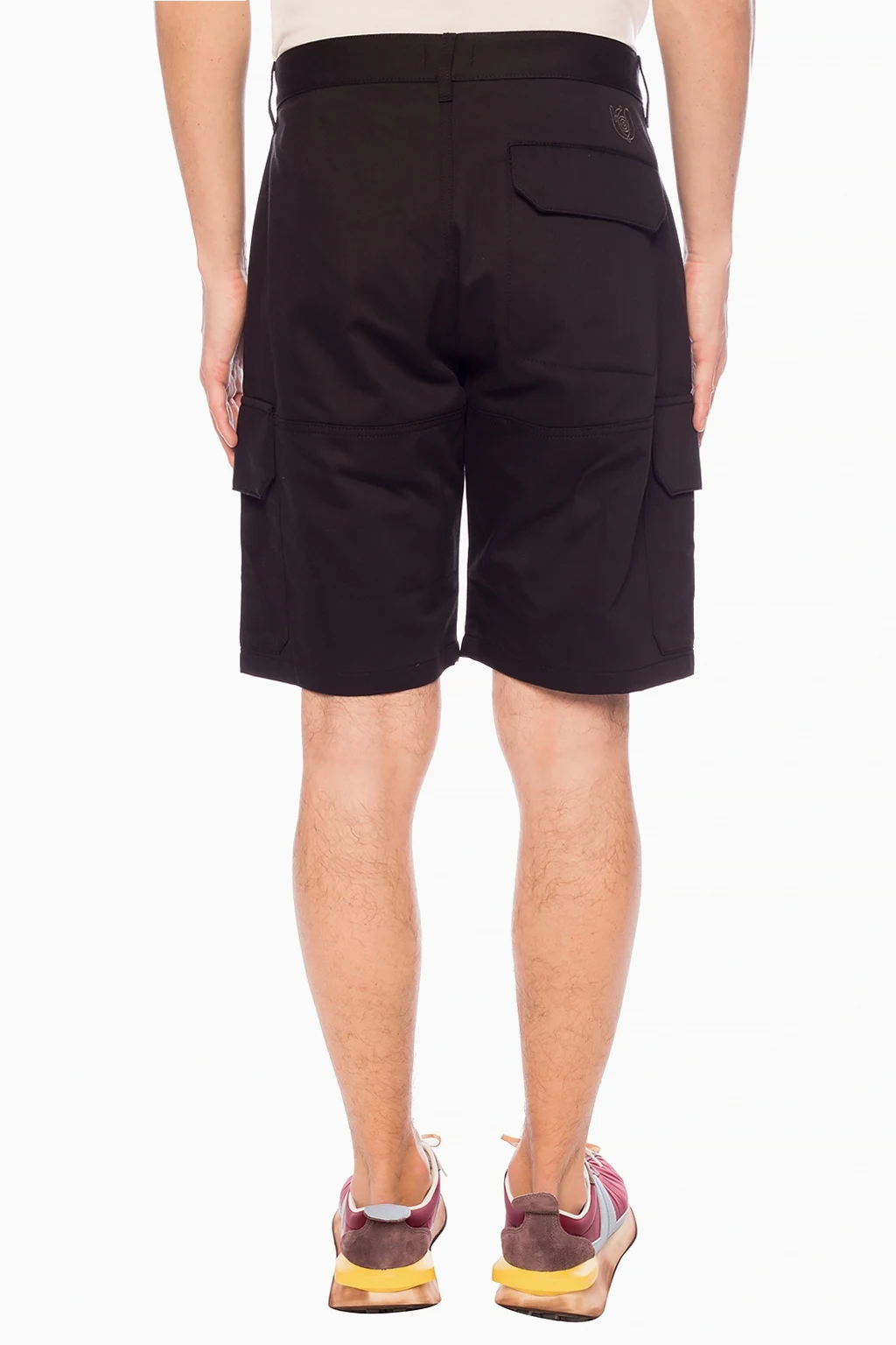 Black shorts from Loewe. Made of cotton. Fastened with buttons. 2 slip pockets and 3 flap pockets fastened with buttons. Decorated with a grey logo embroidery.