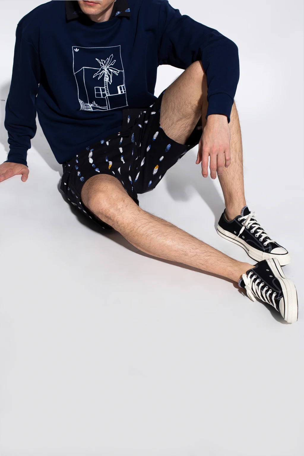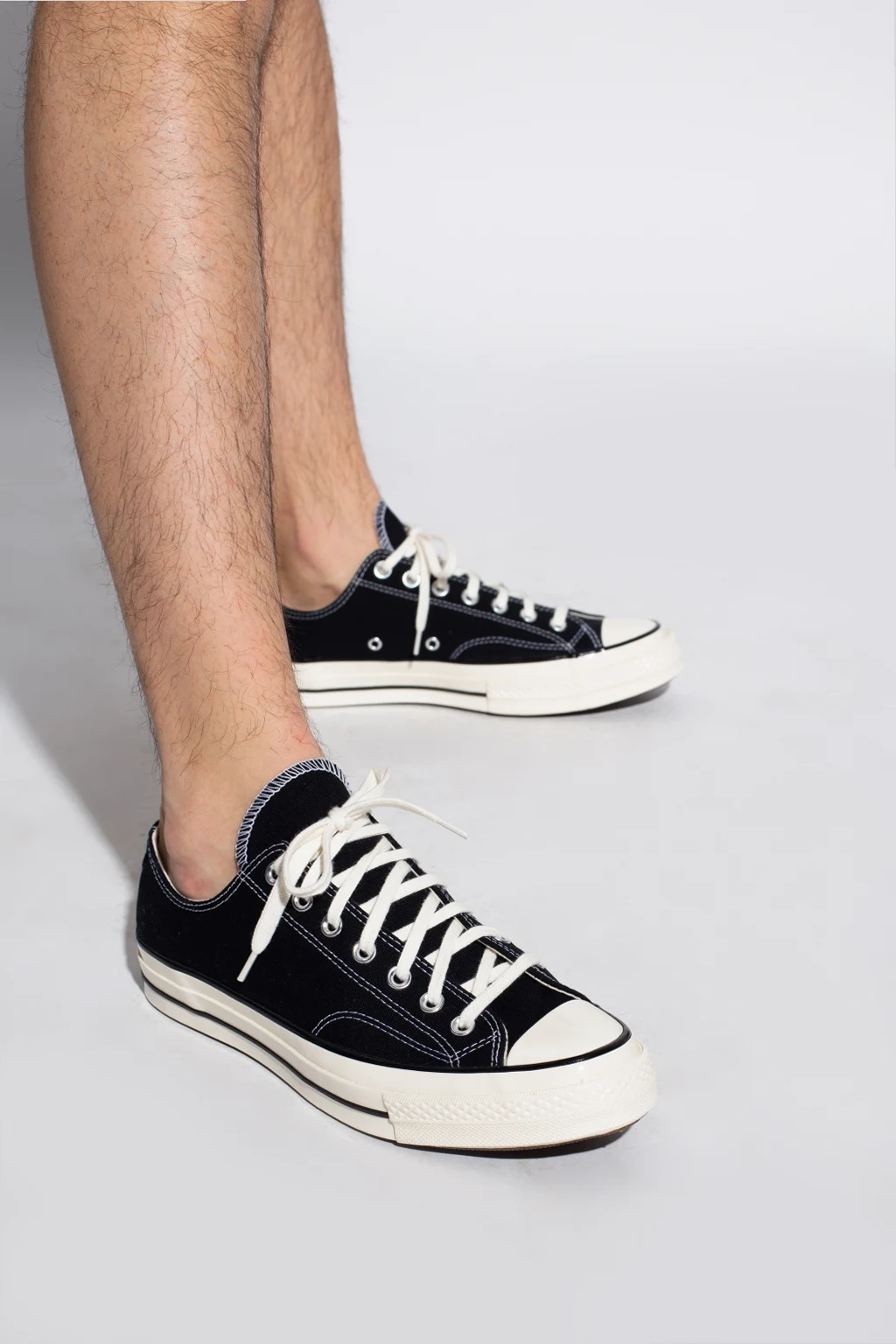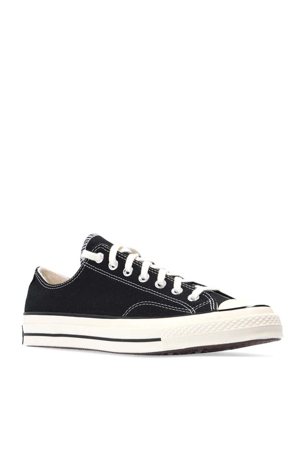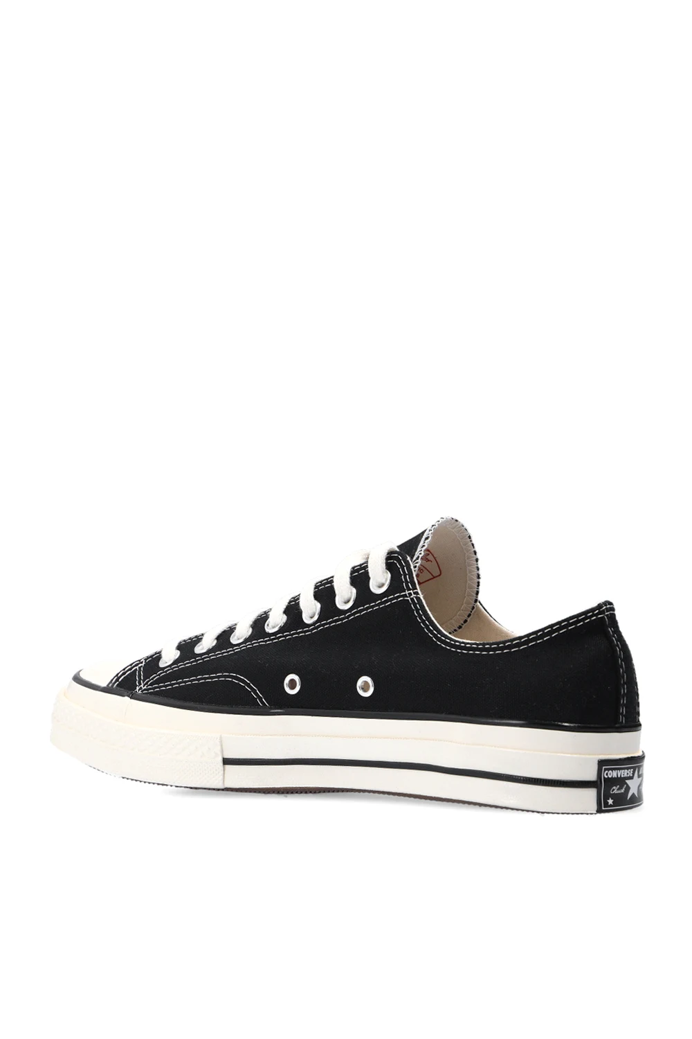 Black ‘Chuck 70 OX’ sneakers from Converse. Crafted from canvas, this lace-up pair sits on a cream and brown rubber sole and features silver-tone metal hardware and a logo print at the back.