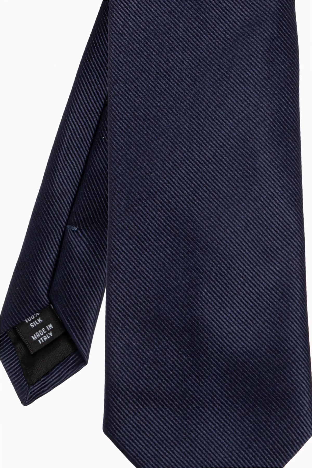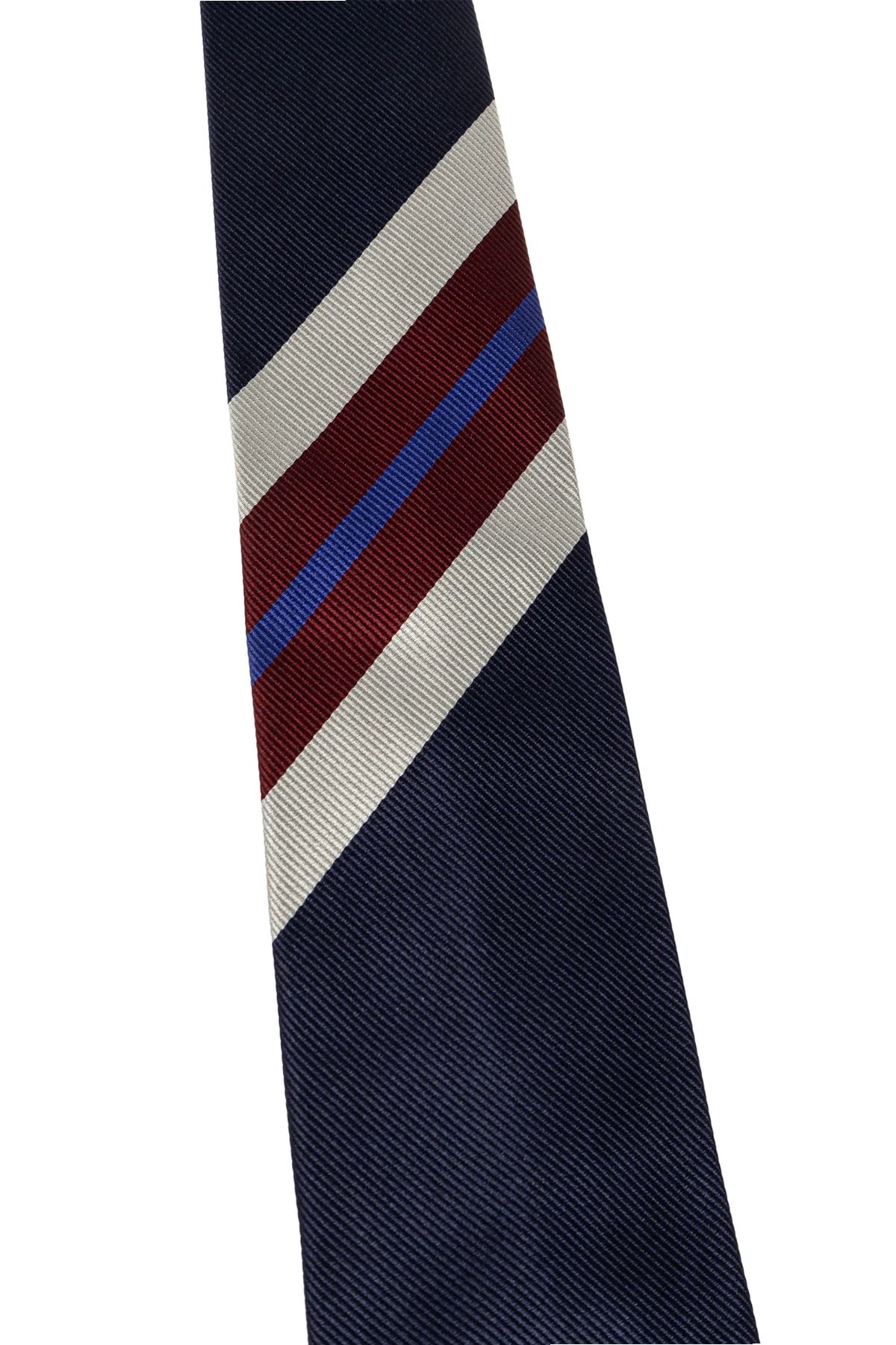 Die glatte, marineblaue Oberfläche der Krawatte wird durch ein markantes, schräges Muster aus breiten Streifen in Dunkelrot- und Cremetönen akzentuiert, ergänzt durch eine feine blaue Linie im Inneren des roten Motivs. Das Fehlen sichtbarer Embleme unterstreicht den diskreten Luxus, während der Hinweis „MADE IN ITALY“ Authentizität und handwerkliche Perfektion garantiert.