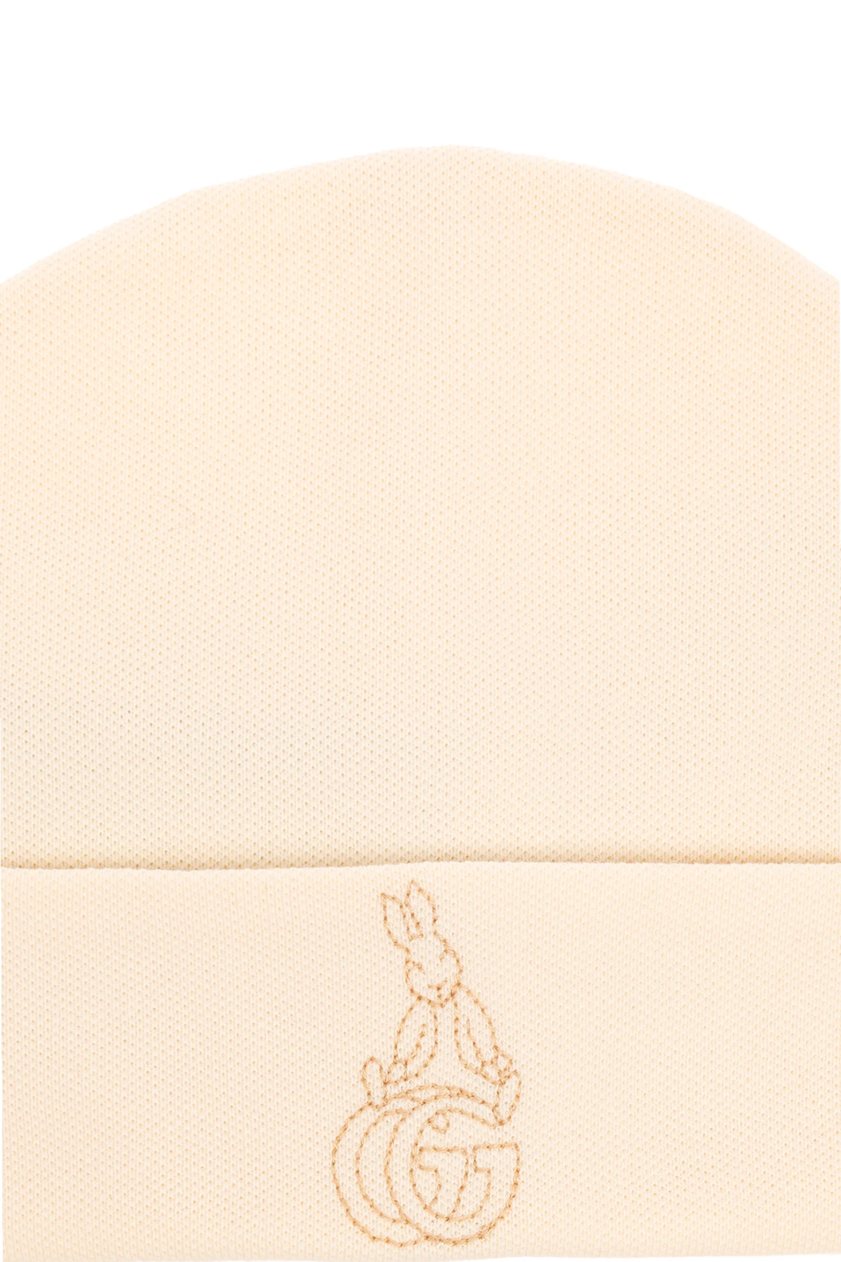 Cream beanie from Gucci x Peter Rabbit™. Made from cotton, this item showcases an embroidered beige logo on the front.
