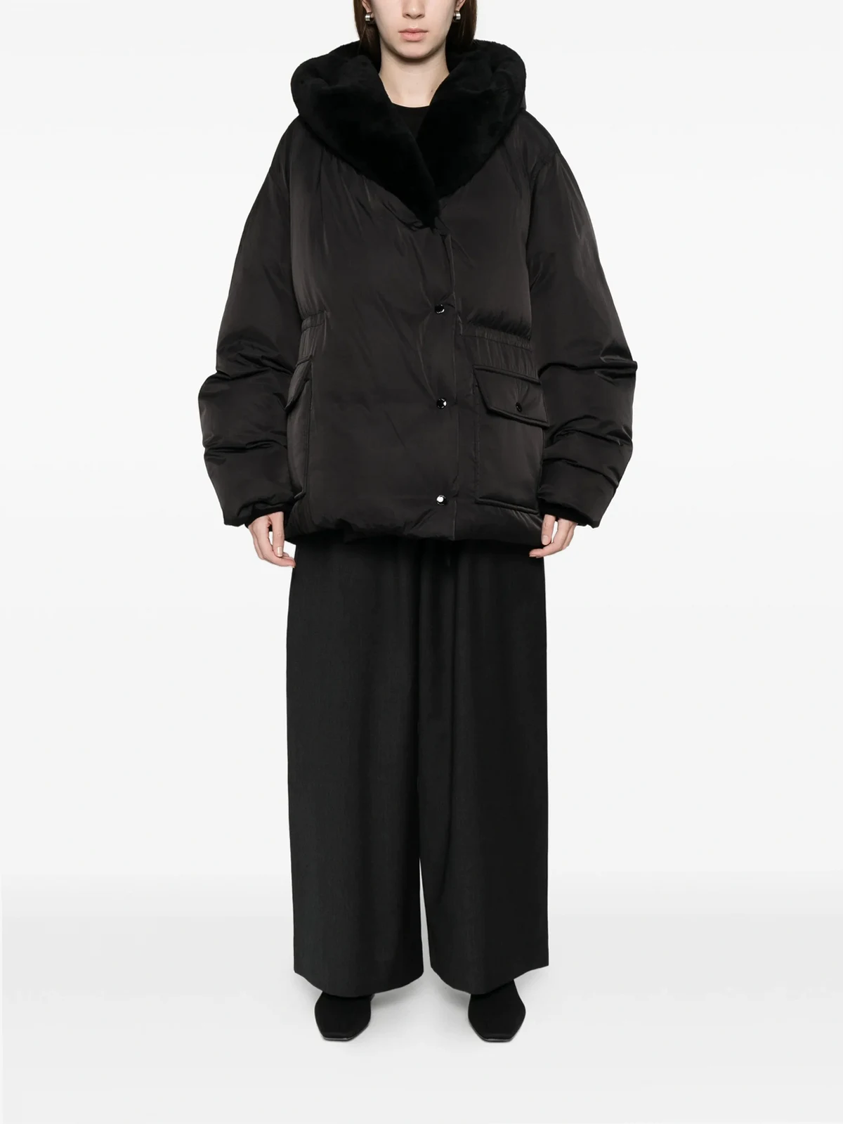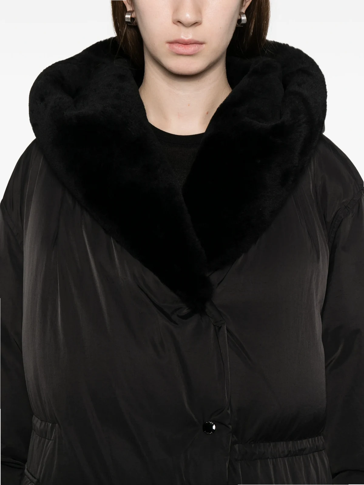Außenmaterial: Polyamid 100%, Shearling 100% Futter: Polyester 100%, Recycelte Daunen 90%, Federn 10%