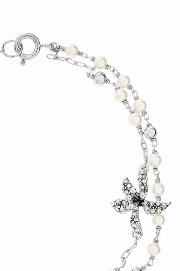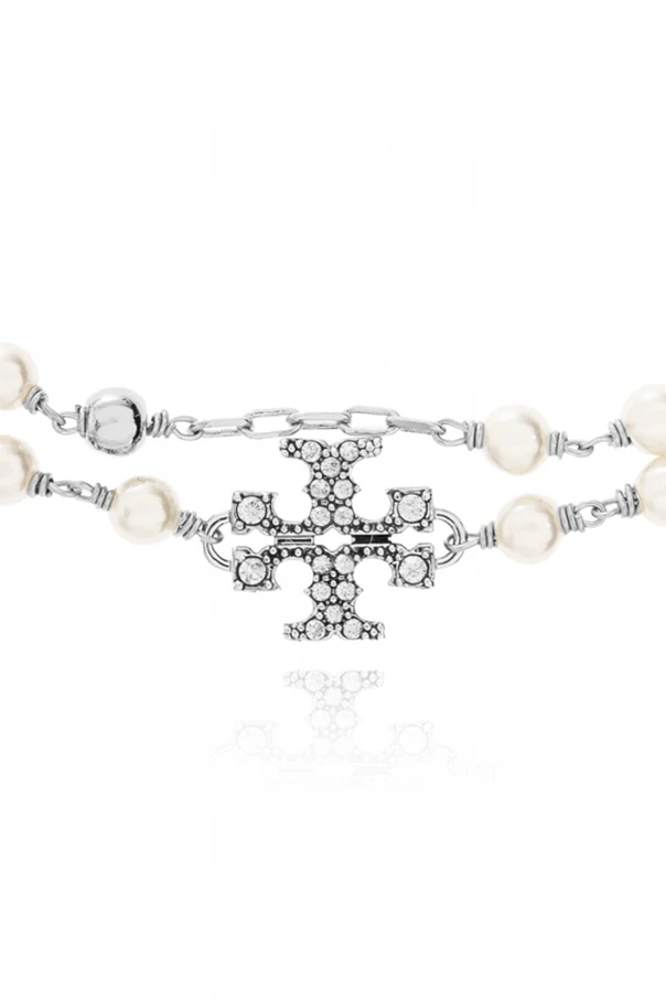 Armband mit Glasperlen von Tory Burch ist eine faszinierende Kombination aus subtiler Zurückhaltung und raffinierter Eleganz. Die zarte, doppelte Kette aus Metall in silberner Farbe ist regelmäßig mit Milchweiß glänzenden Glasperlen verziert.