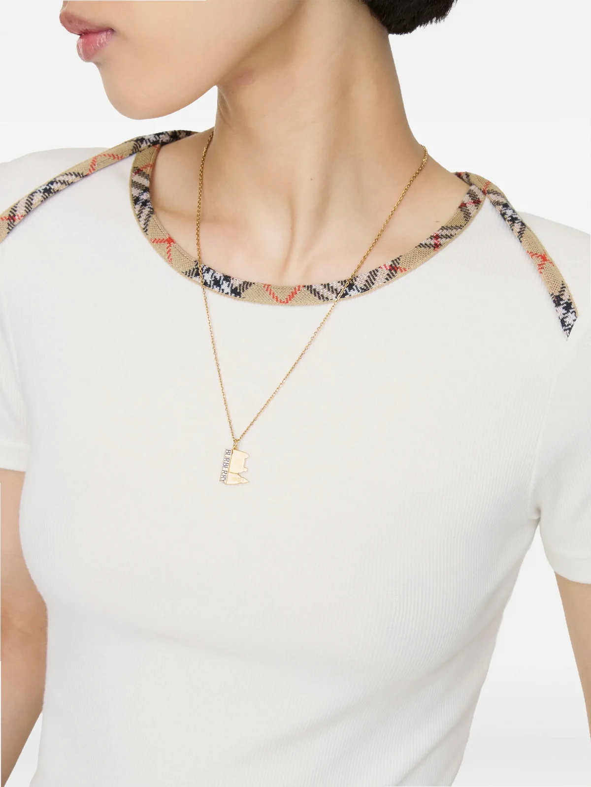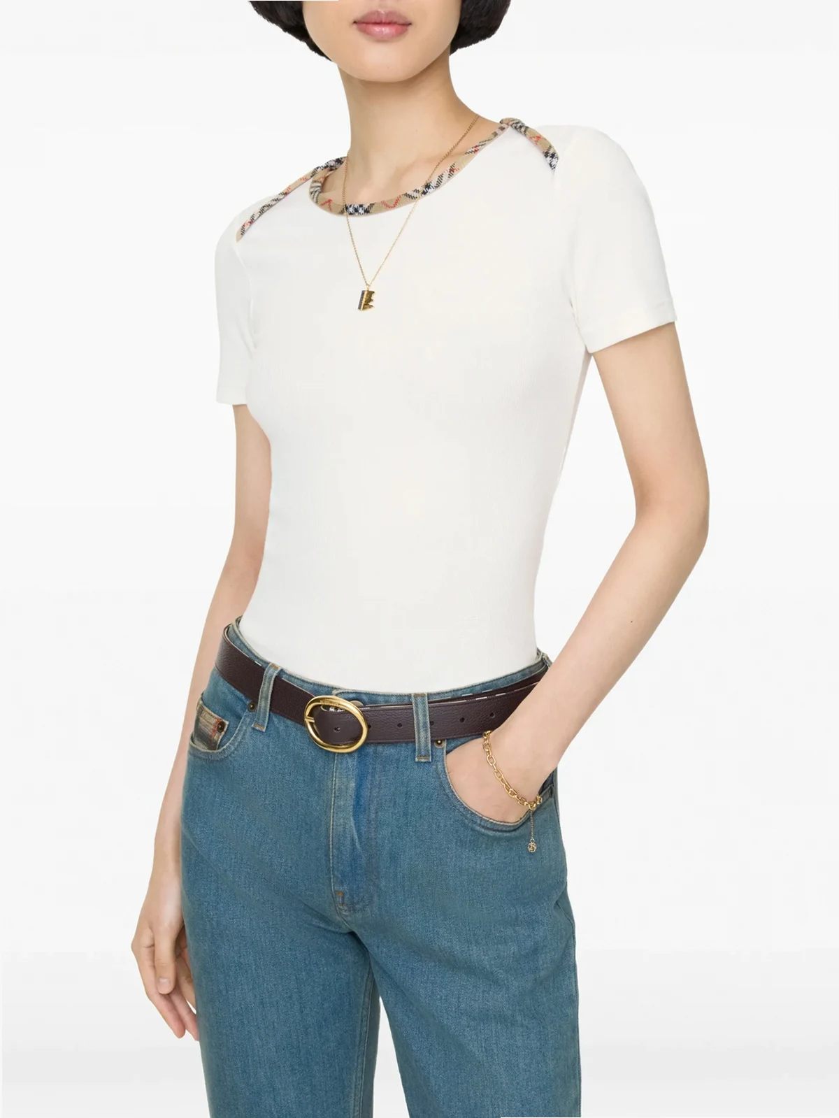 Geripptes T-Shirt aus Baumwollstretch, schmal geschnitten. Das Piece wird durch den Burberry Check an den Kuvertschultern akzentuiert und mit unserem ikonischen, gestickten Equestrian Knight Design vollendet. ^ Equestrian Knight-Stickerei