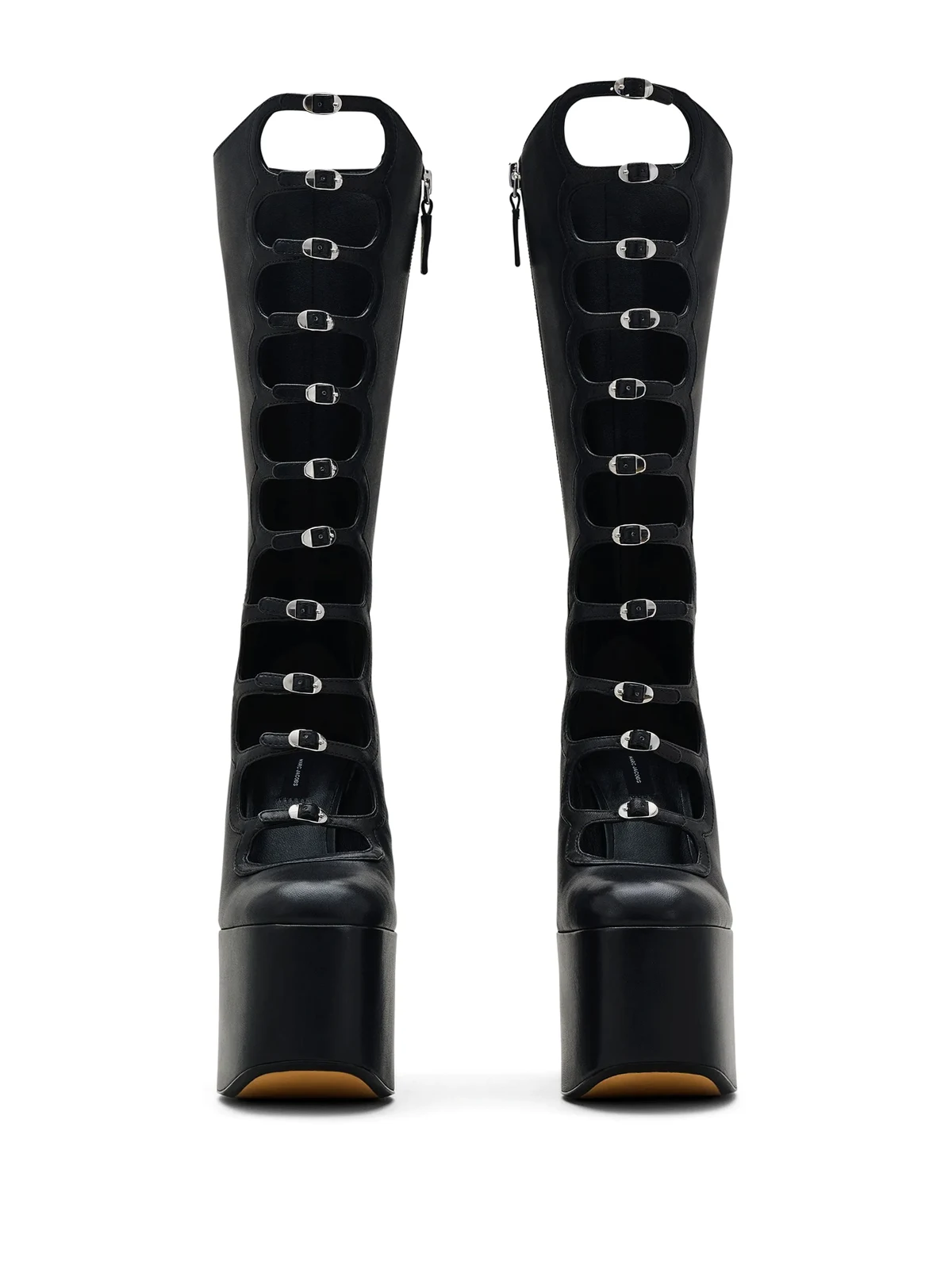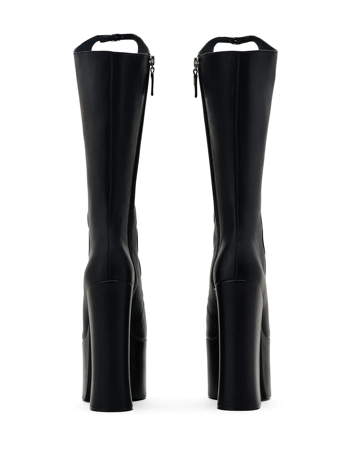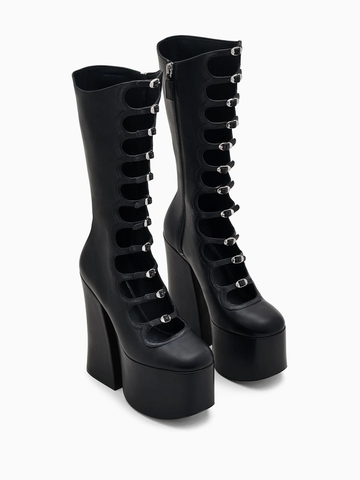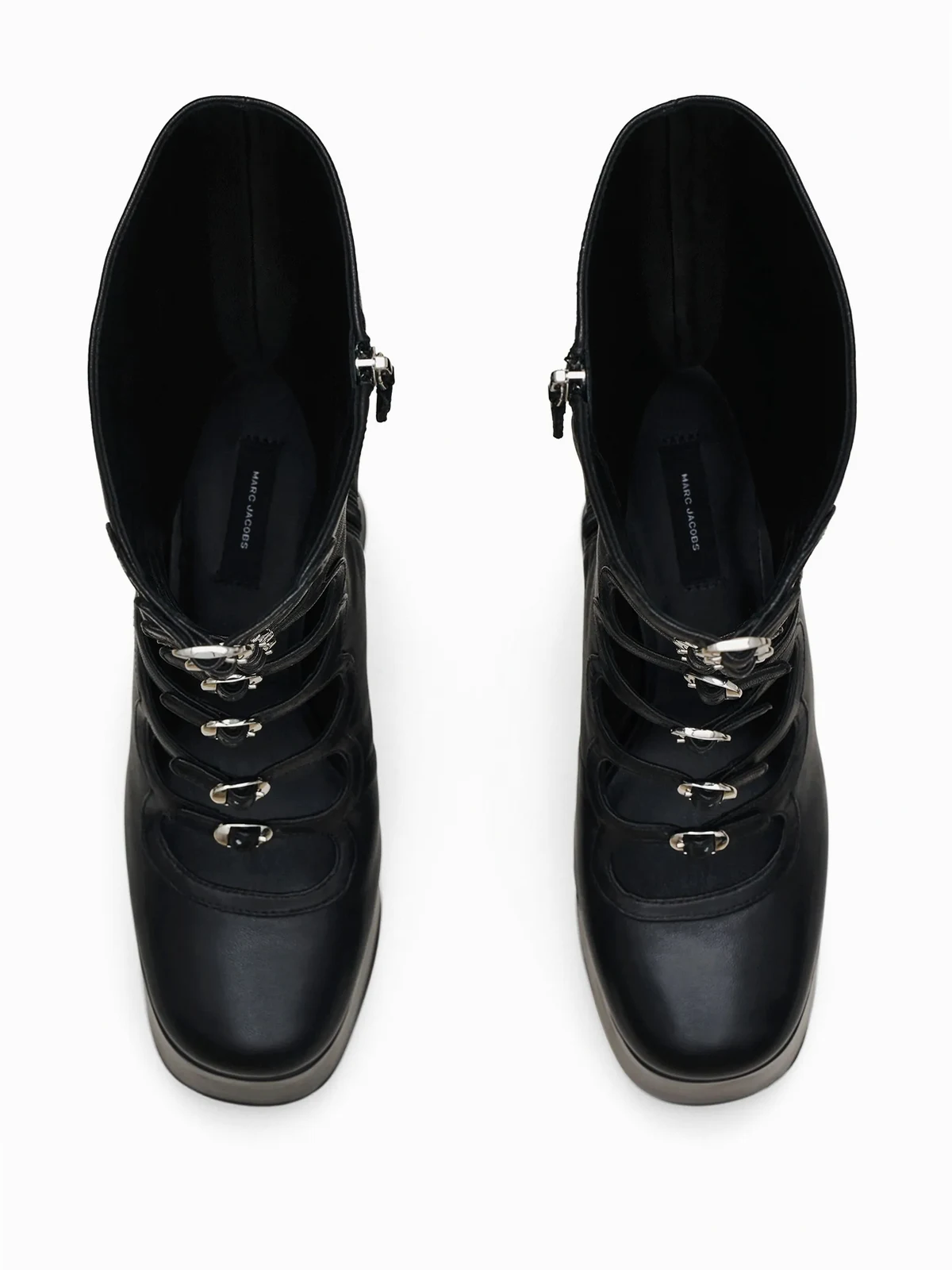 Glattleder, gleichfarbige Nähte, silberfarbene Beschläge, Zierschnalle, runde Kappe, seitlicher Reißverschluss, Logo-Prägung im Fußbett, Blockabsatz, Pleateausohle.