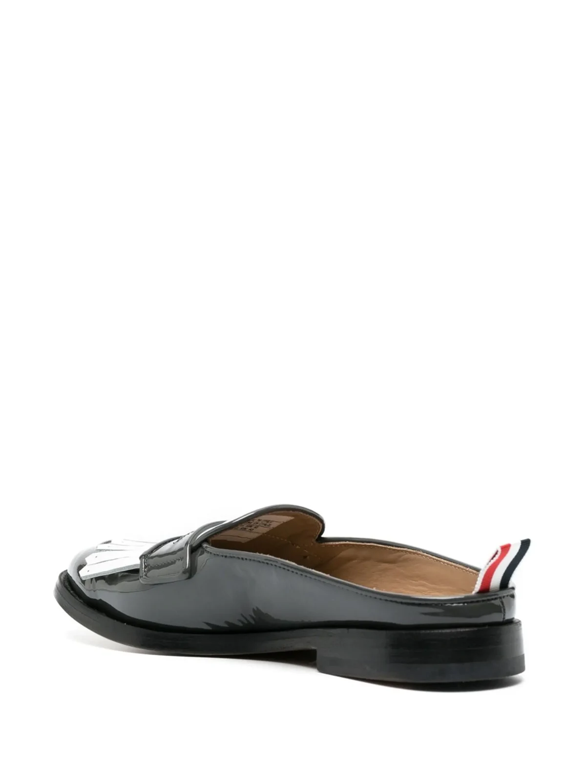 Schwarz/Weiß, Kalbsleder, Lackleder-Finish, ohne Verschluss, Fransen-Detail, Penny-Riemen, mandelförmige Kappe, ikonische Ripsbandschlaufe.