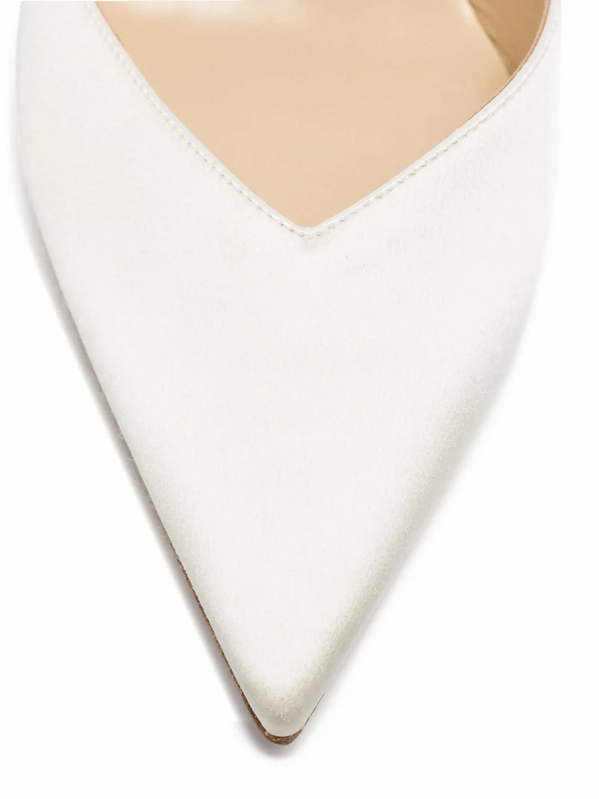 Spitze Kappe, V-förmiges Vorderblatt, Logo-Prägung im Fußbett, Knöchelriemen mit Kristallen, Stiletto-Absatz. Farbe: Weiß. Material: Leder.