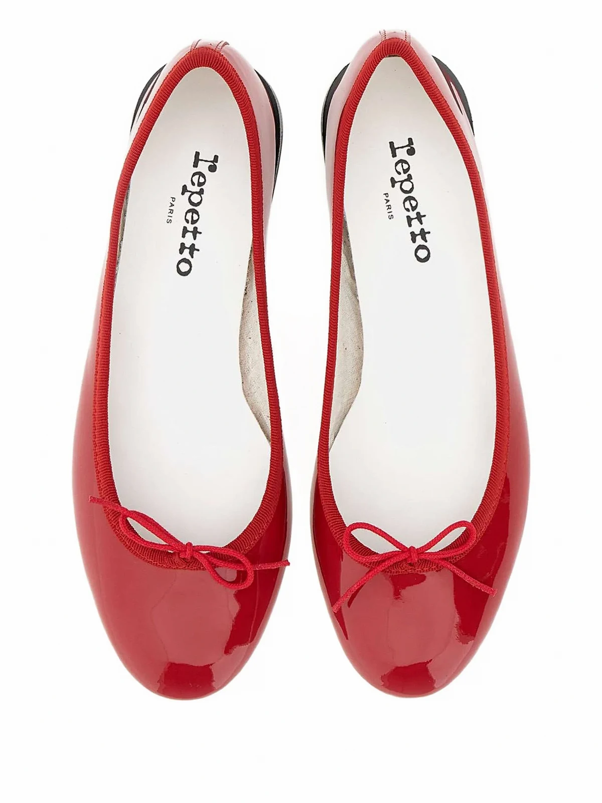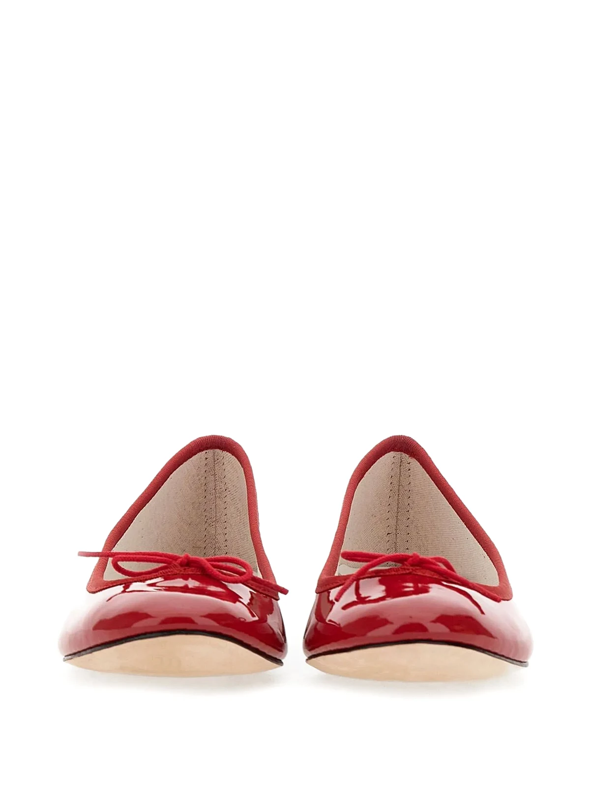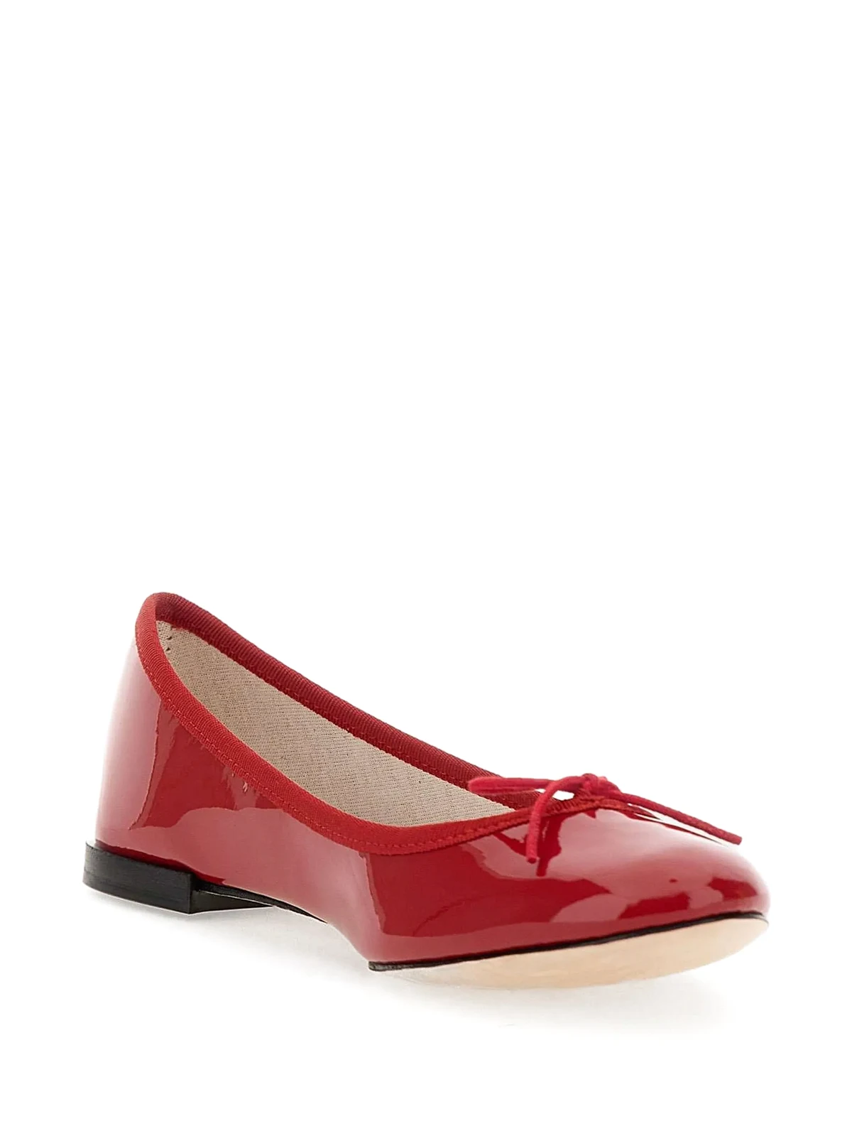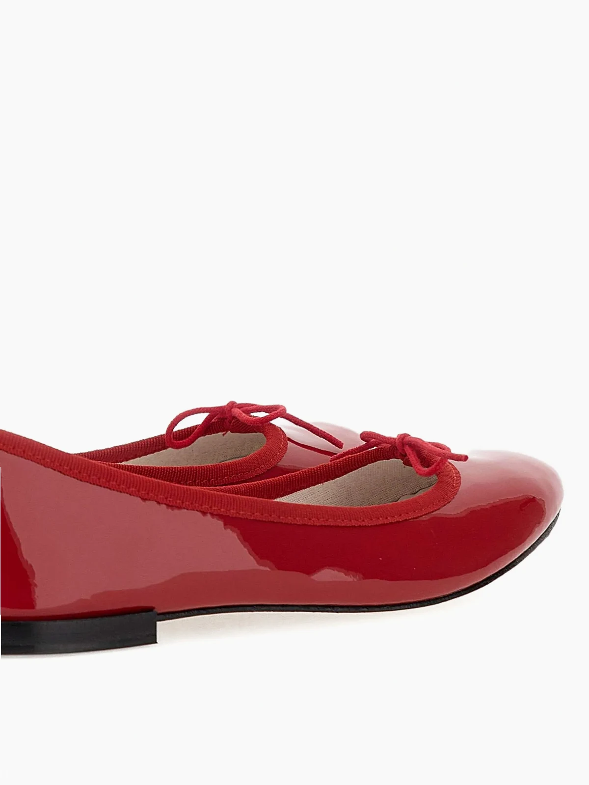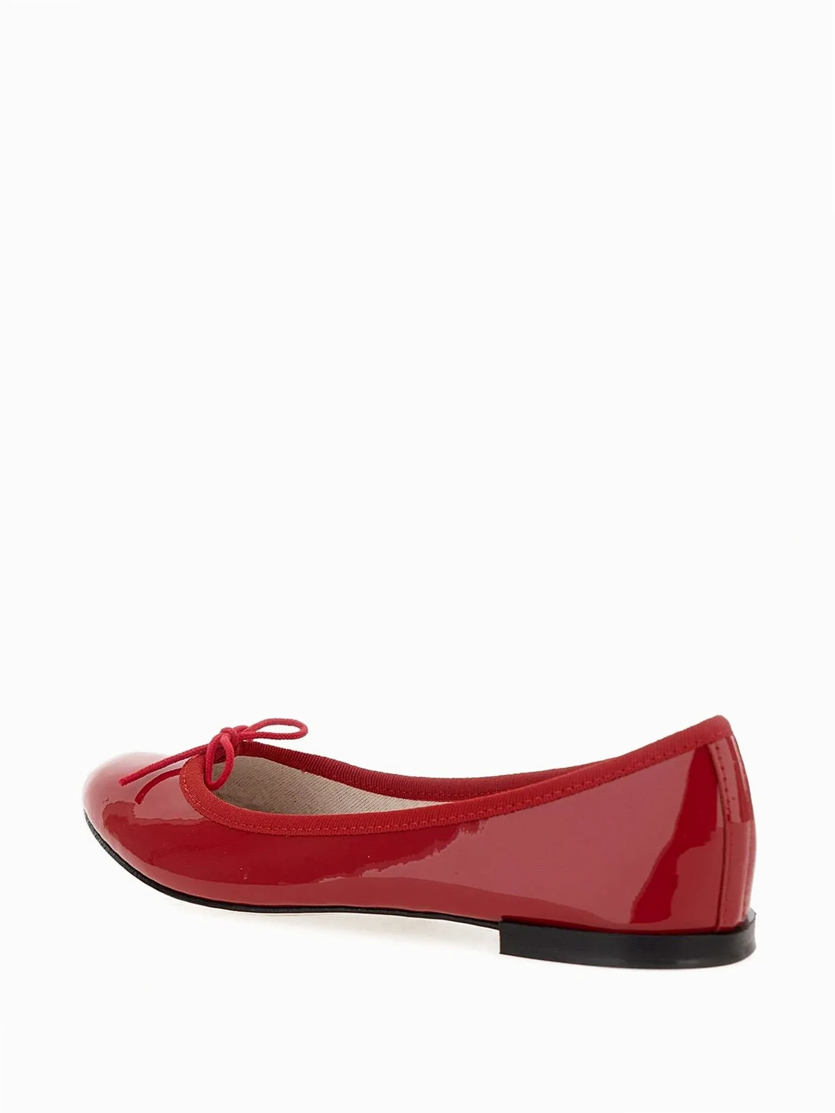 Runde Kappe, Schleifendetails, flache Sohle, ohne Verschluss, Logo-Prägung im Fußbett. Material: Lackleder.